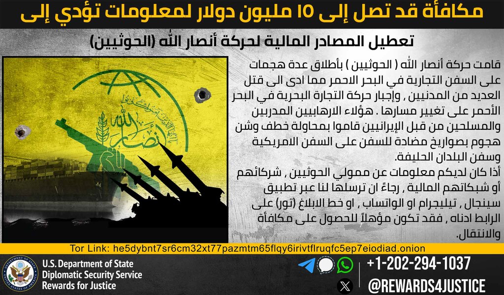 يقدم برنامج مكافآت من اجل العدالة مكافأة قد تصل إلى ١٥ مليون دولار لمعلومات تؤدي إلى تعطيل الاليات المالية لجماعة أنصار الله المعروفين أيضًا بالحوثيين والتي صنفتهم الولايات المتحدة الامريكية بمنظمة إرهابية اجنبية.