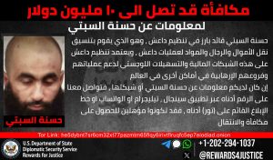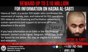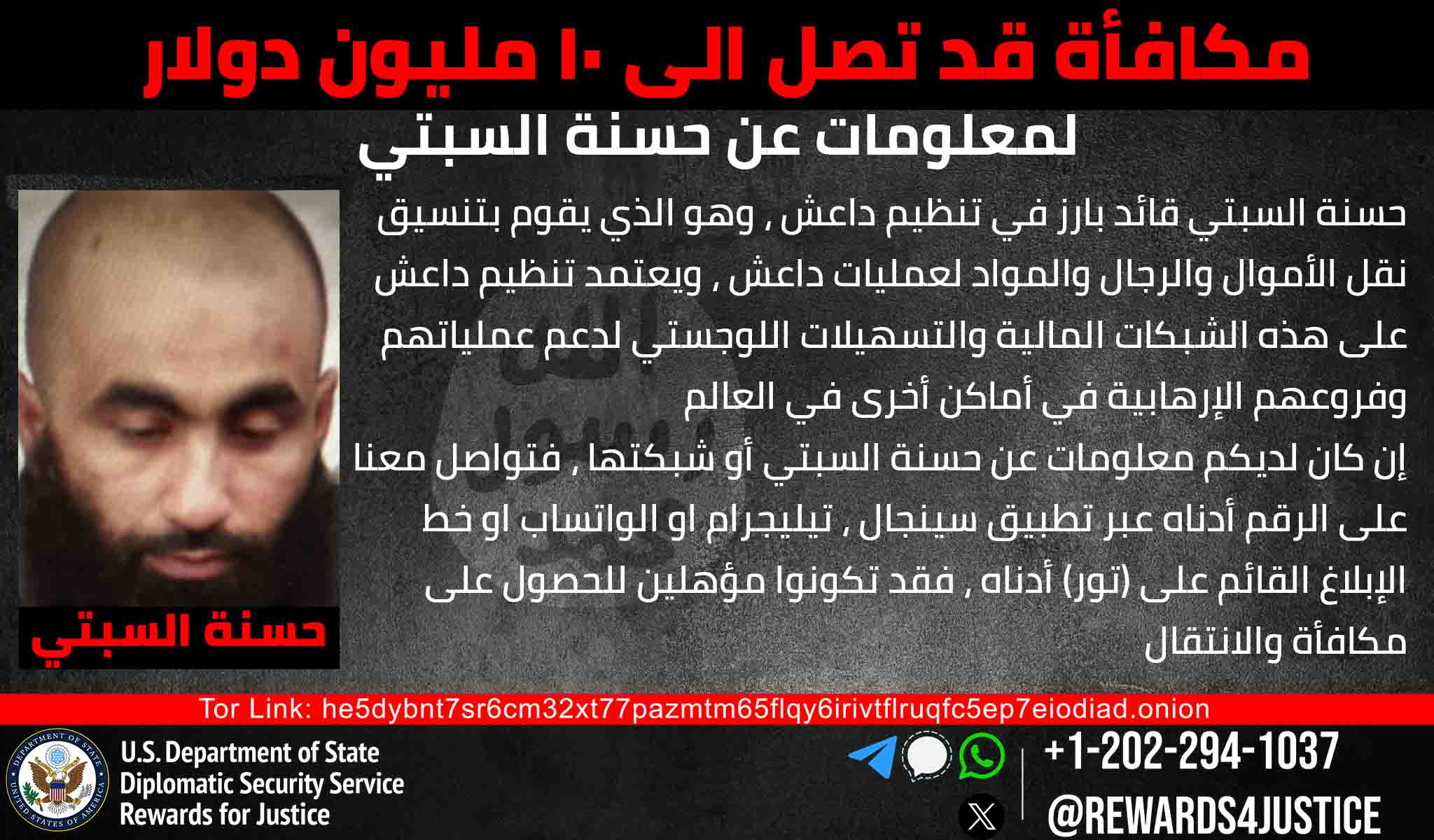 مكافآت من أجل العدالة تقدم مكافأة قد تصل إلى ١٠ ملايين دولار مقابل معلومات تؤدي إلى تعطيل الآليات المالية لتنظيم داعش، المصنف من قبل الولايات المتحدة بانها منظمة إرهابية أجنبية