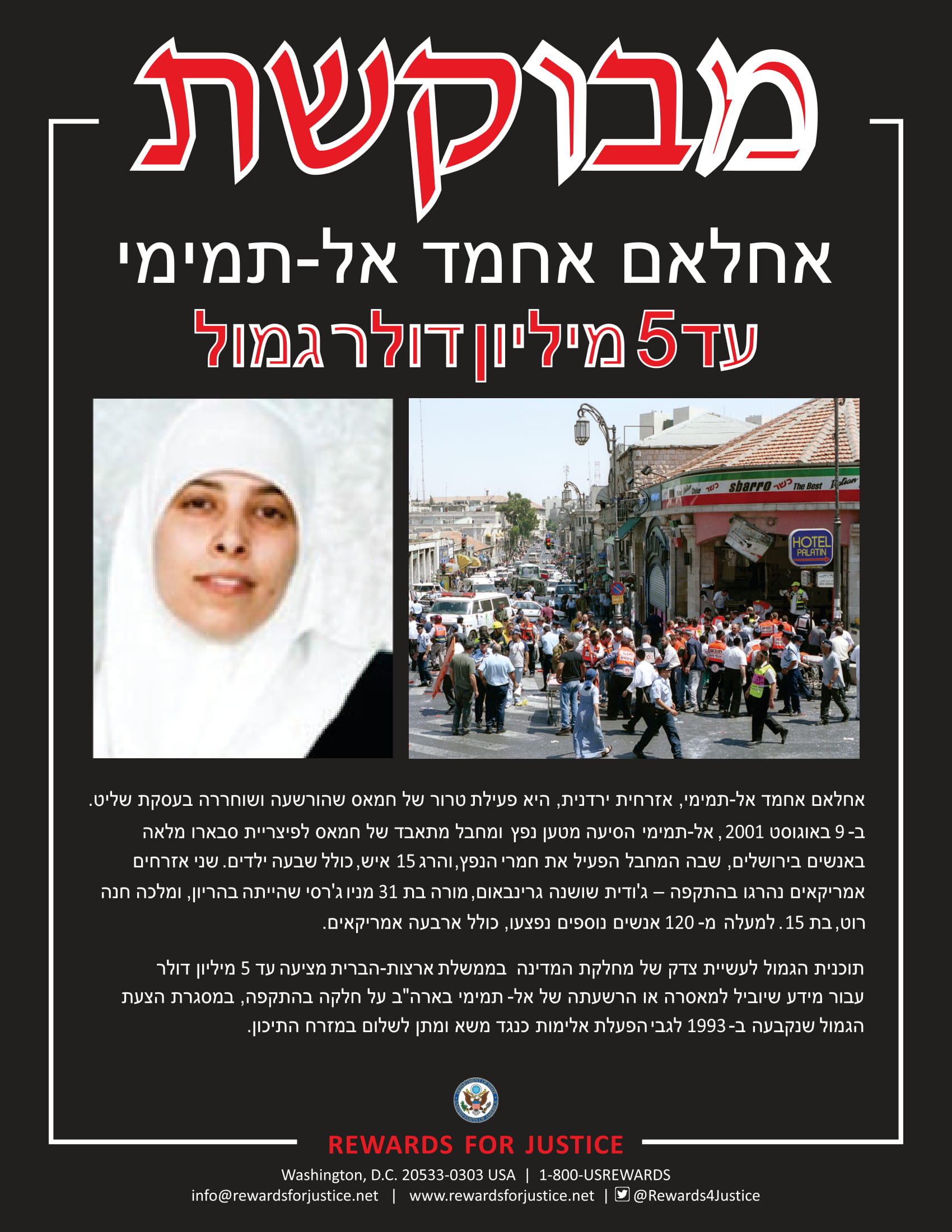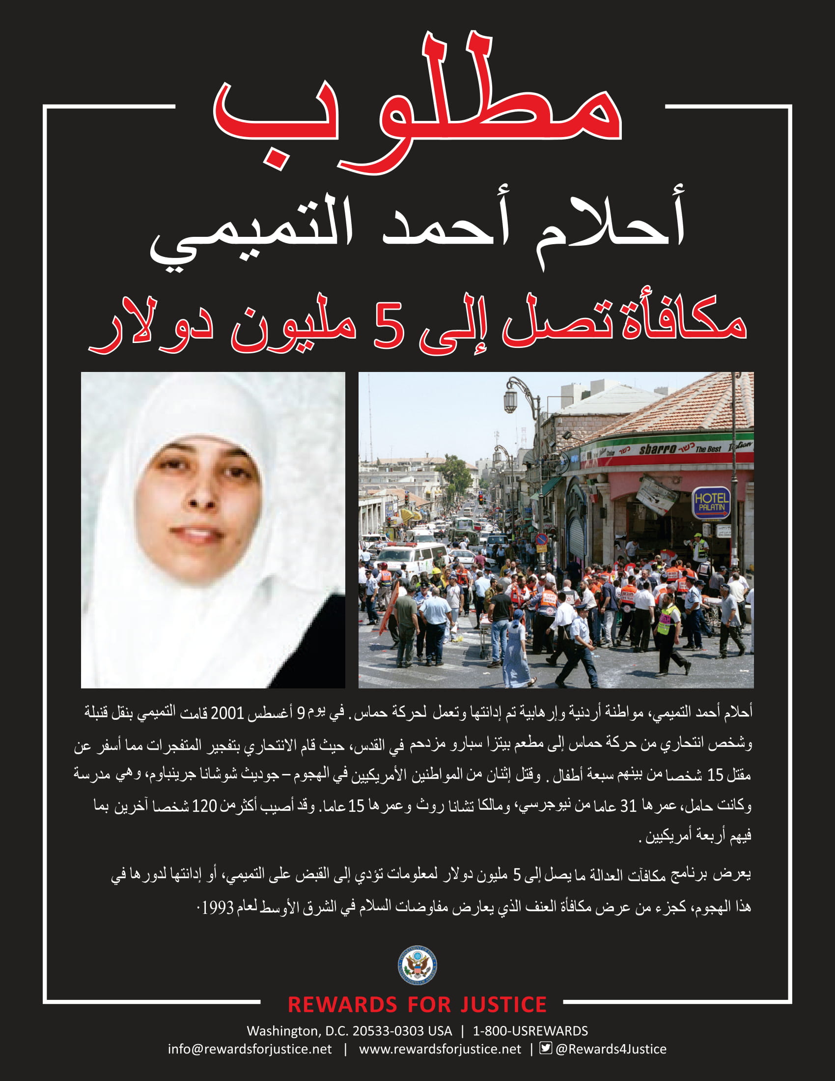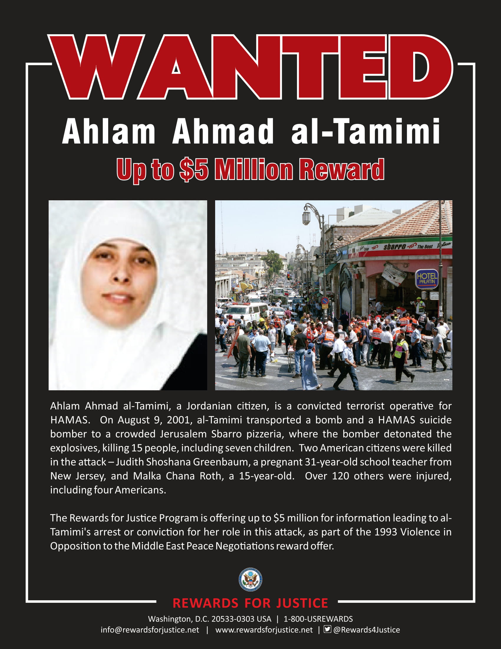 Rewards for Justice is offering a reward of up to $5 million for information on Ahlam Ahmad al-Tamimi, also known as “Khalti” and “Halati,” as part of its 1993 Violence in Opposition to the Middle East Peace Negotiations reward offer.