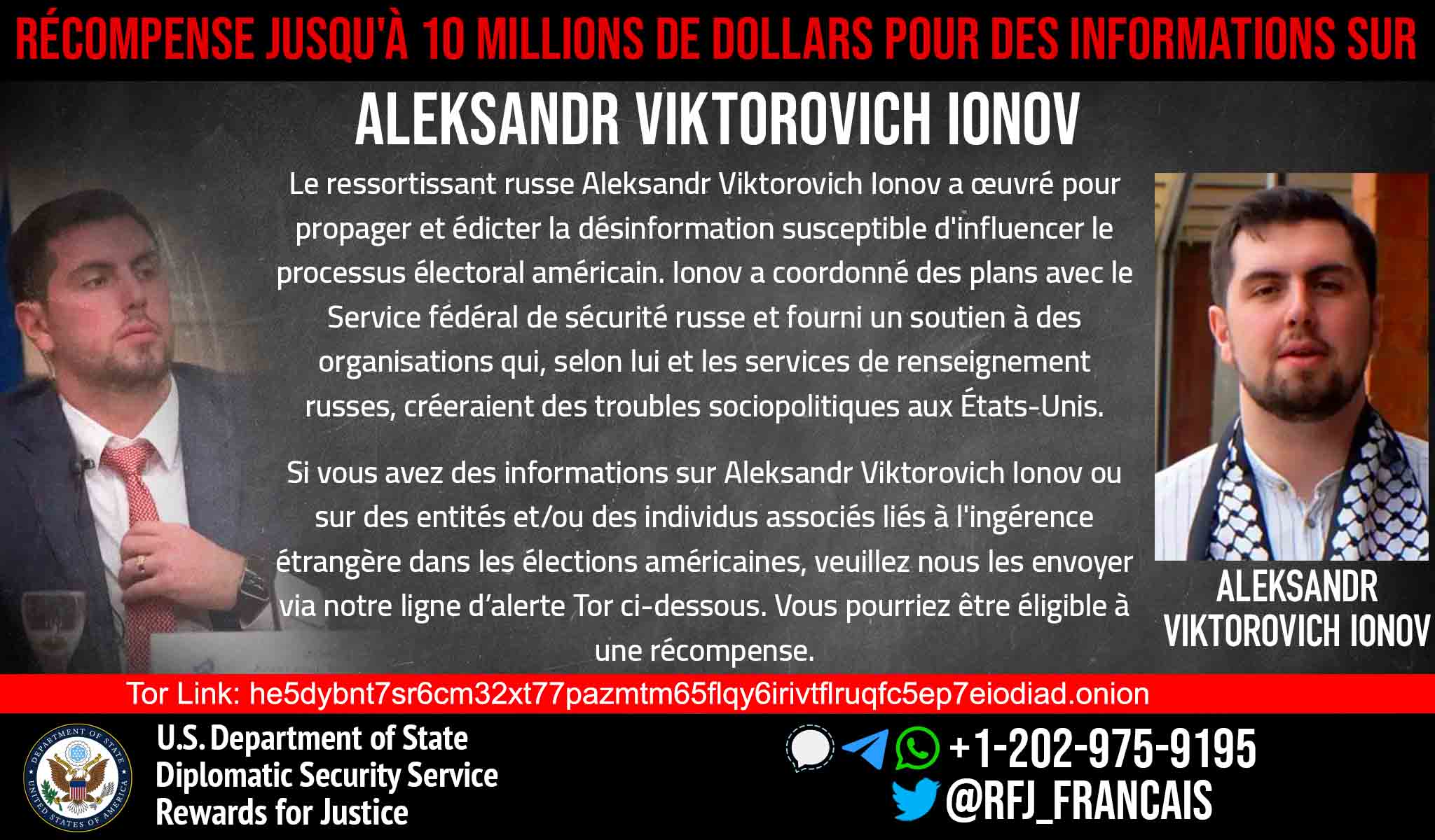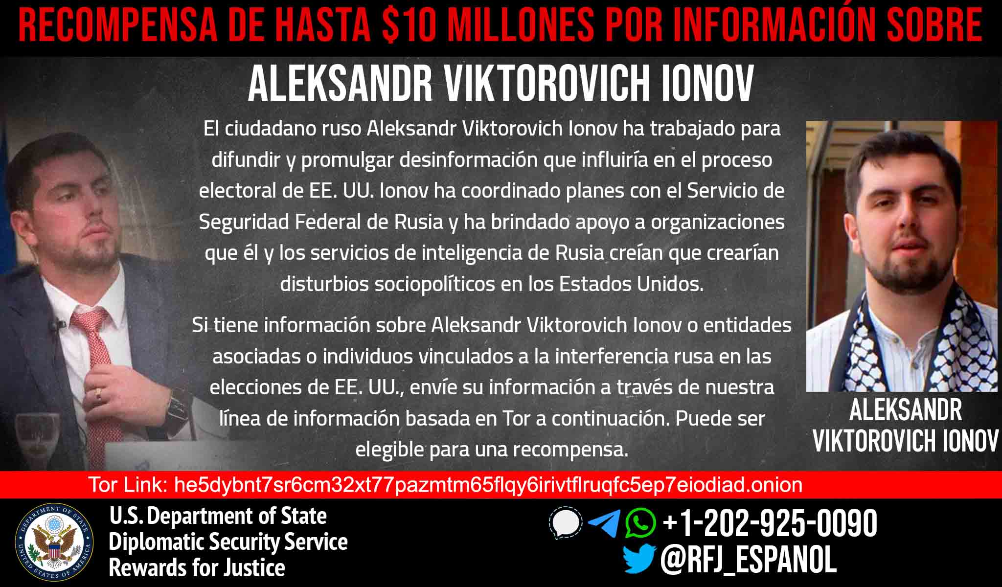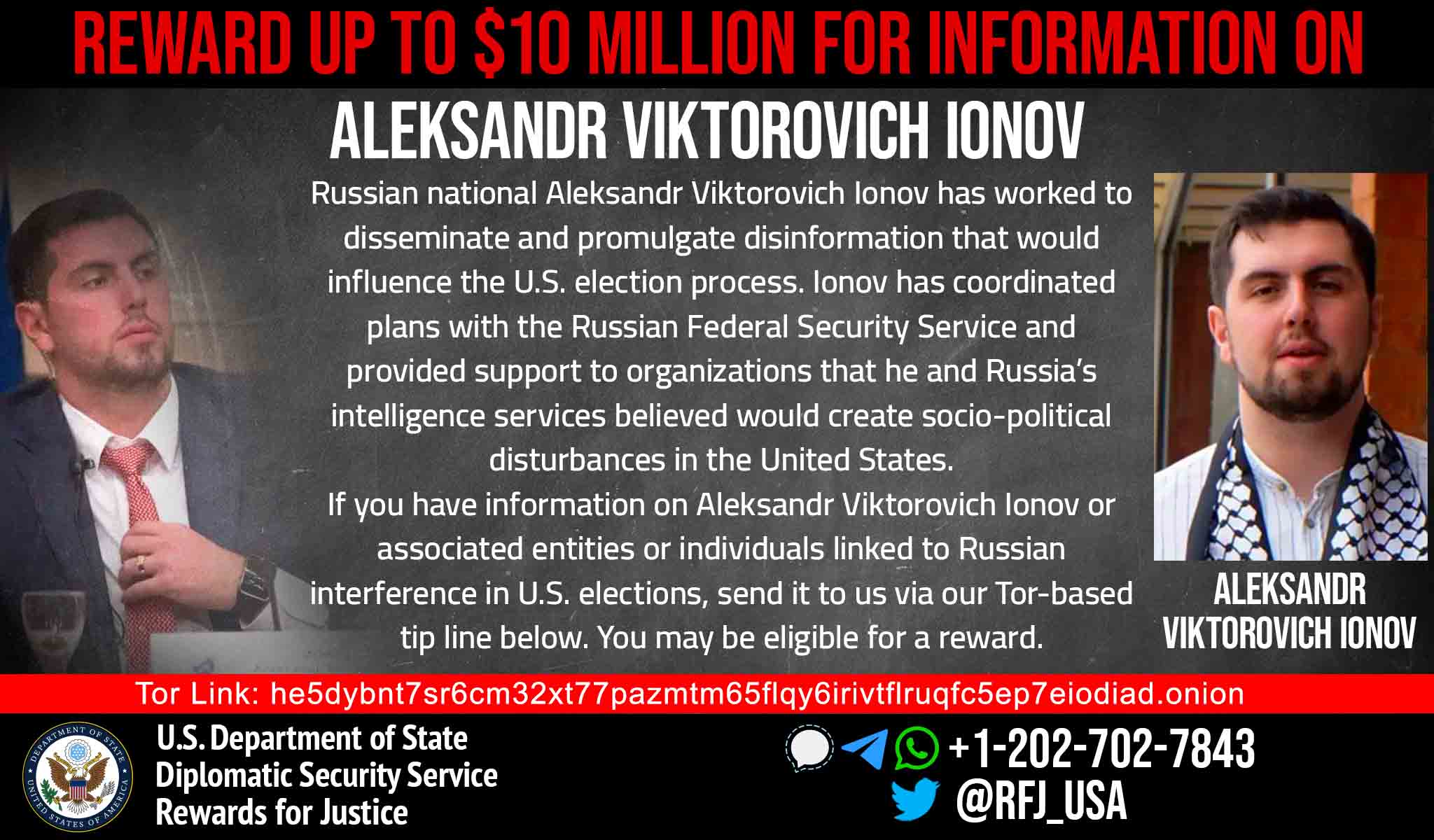 Anyone with information on Aleksandr Ionov or associated entities and/or individuals linked to foreign interference in U.S. elections should contact Rewards for Justice via our Tor-based tips-reporting channel at: he5dybnt7sr6cm32xt77pazmtm65flqy6irivtflruqfc5ep7eiodiad.onion (Tor browser required).