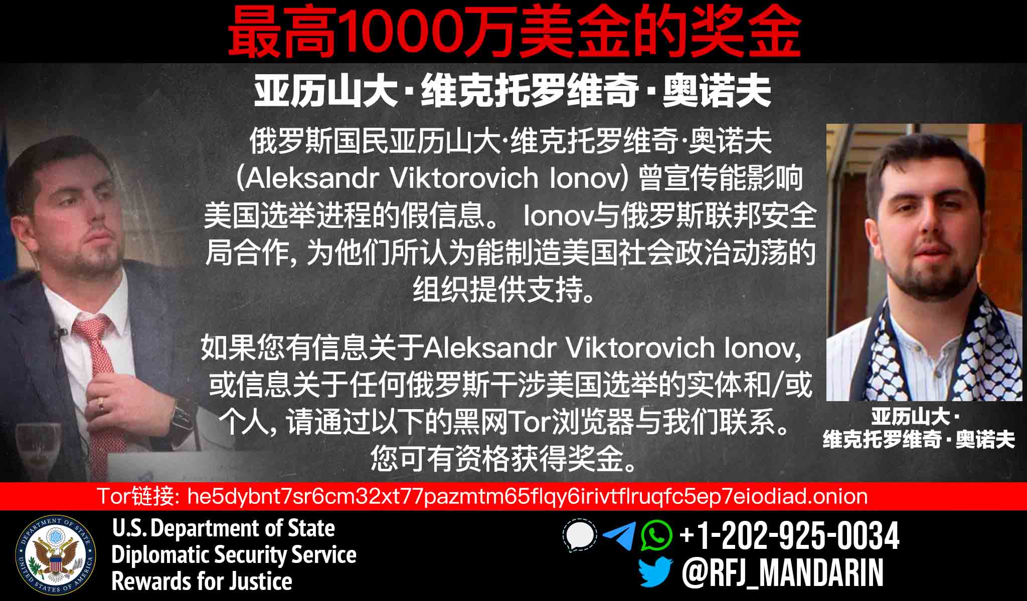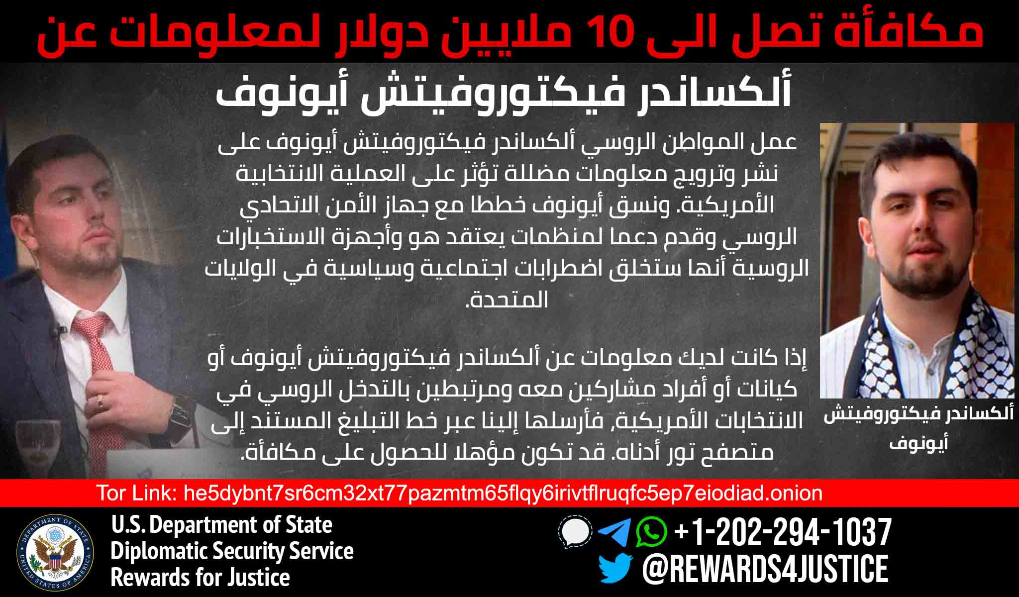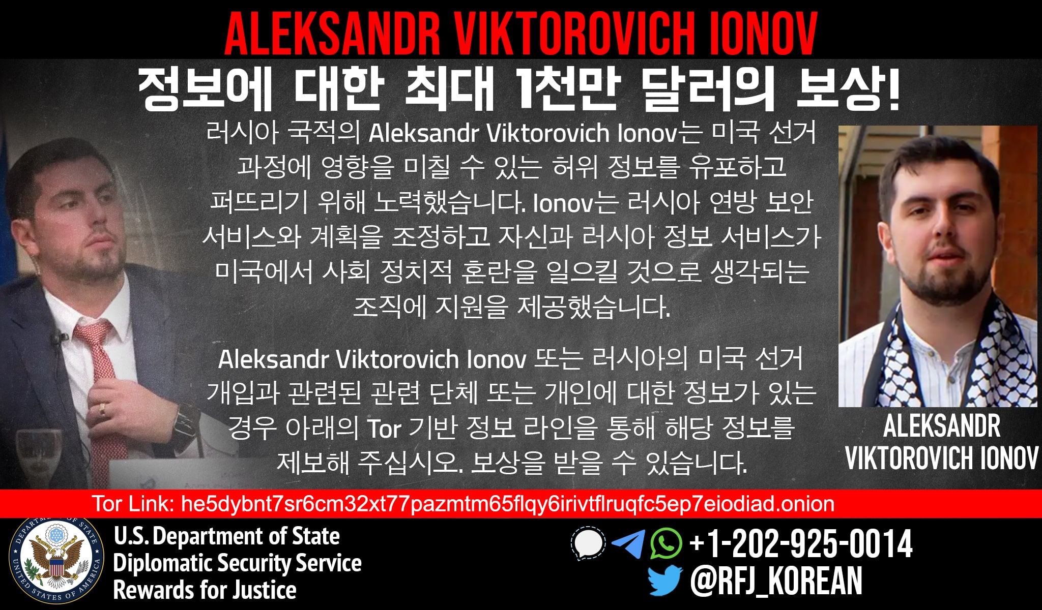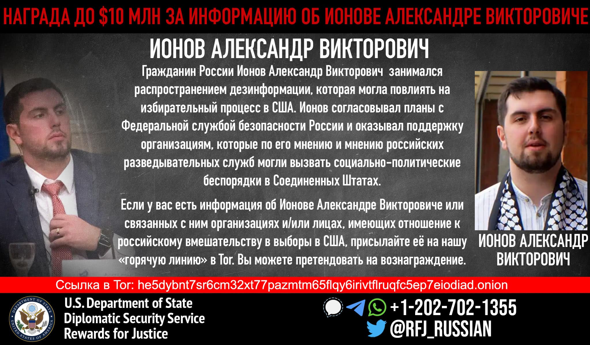Anyone with information on Aleksandr Ionov or associated entities and/or individuals linked to foreign interference in U.S. elections should contact Rewards for Justice via our Tor-based tips-reporting channel at: he5dybnt7sr6cm32xt77pazmtm65flqy6irivtflruqfc5ep7eiodiad.onion (Tor browser required).