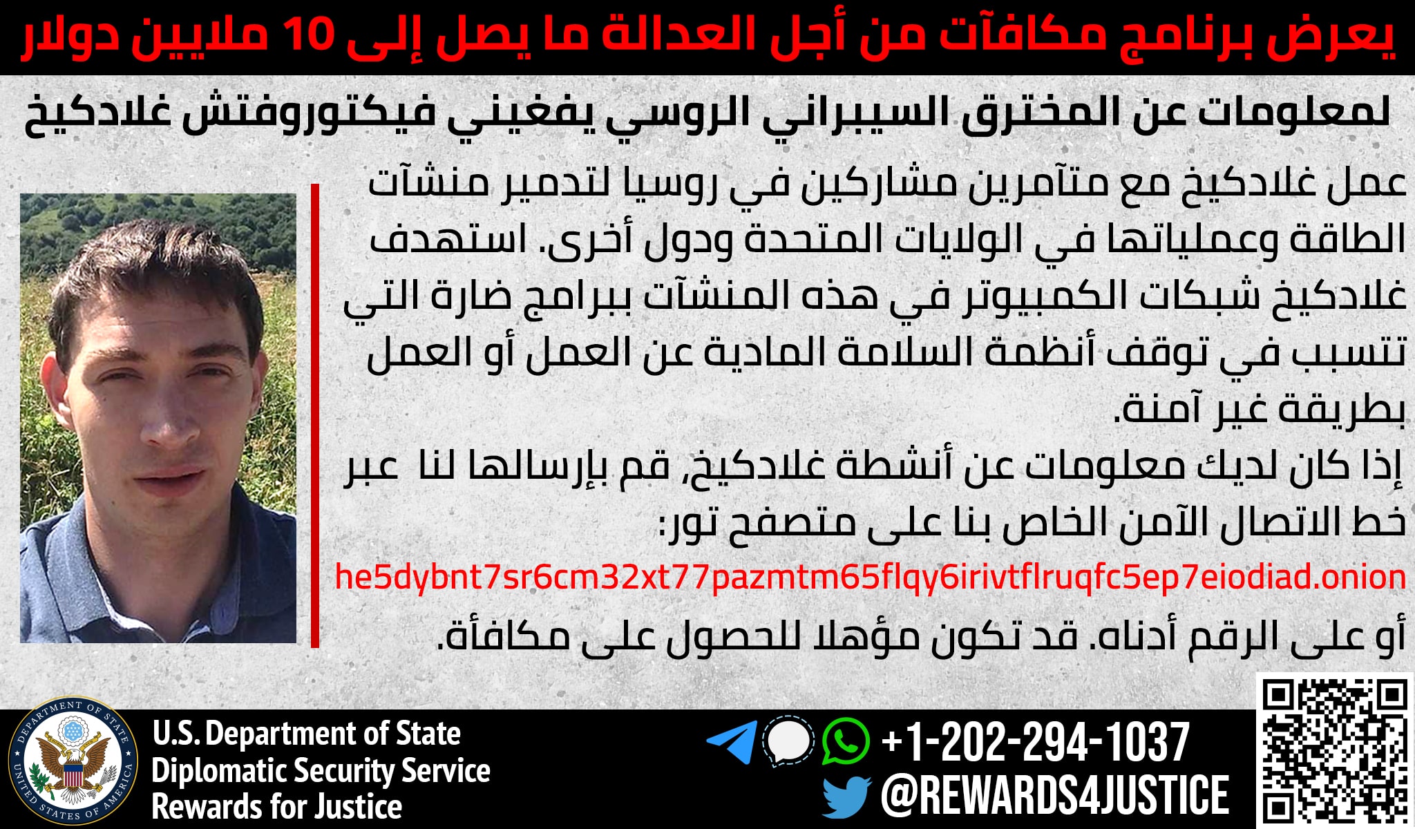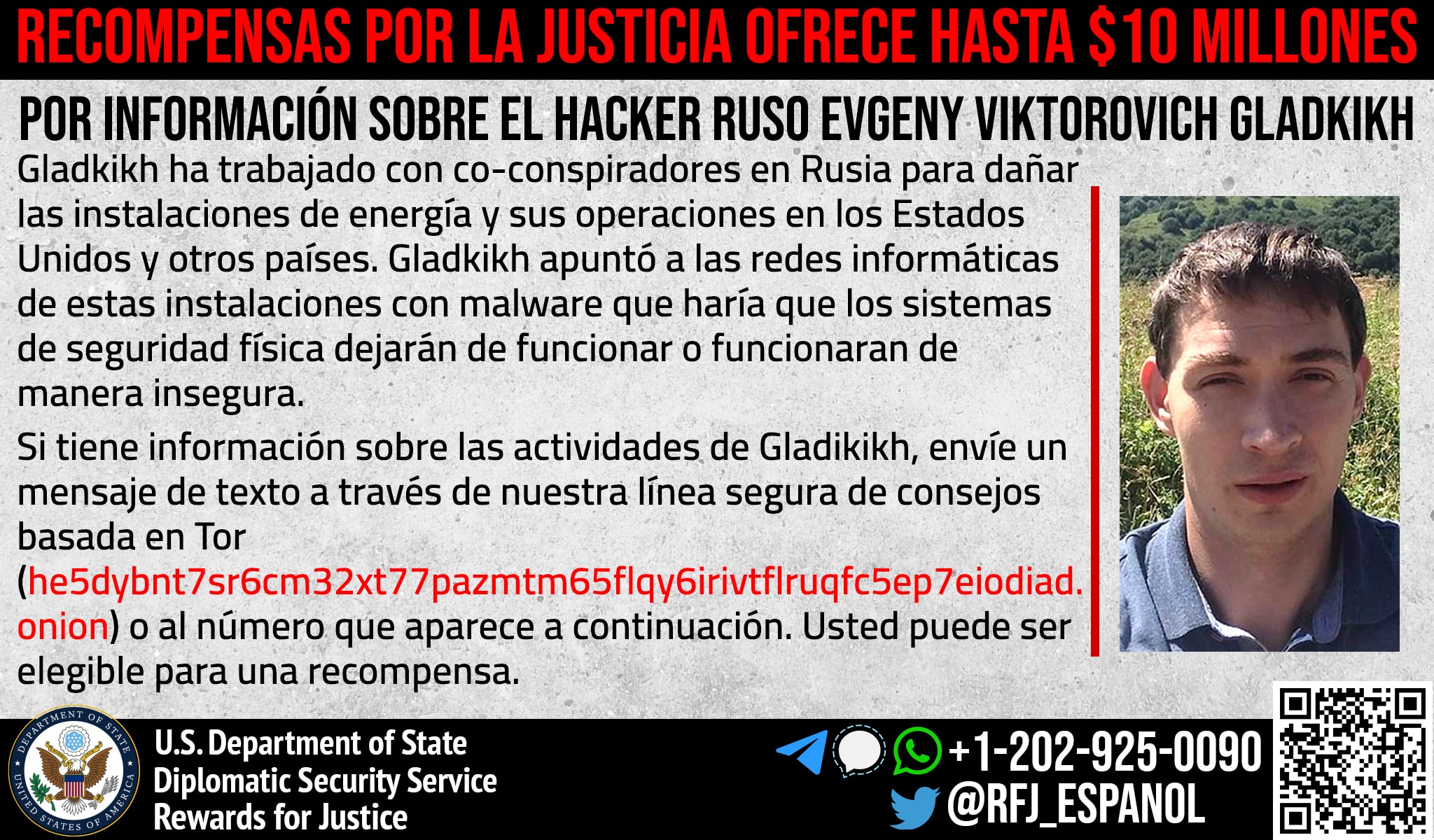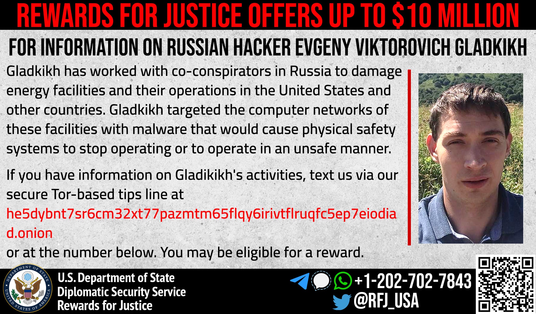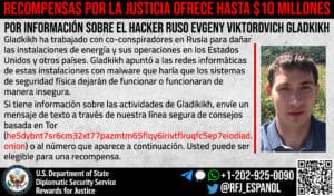 Anyone with information on Evgeny Viktorovich Gladkikh’s malicious cyberactivity should contact Rewards for Justice via the Tor-based tips-reporting channel at: he5dybnt7sr6cm32xt77pazmtm65flqy6irivtflruqfc5ep7eiodiad.onion (Tor browser required)