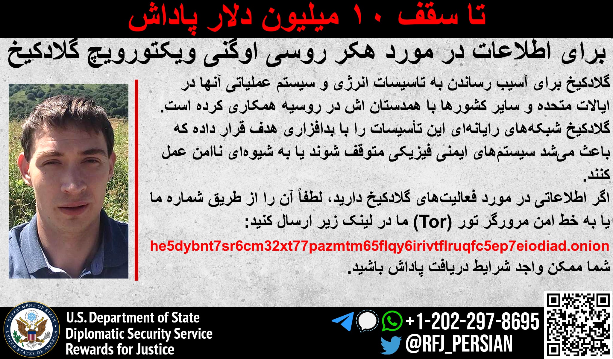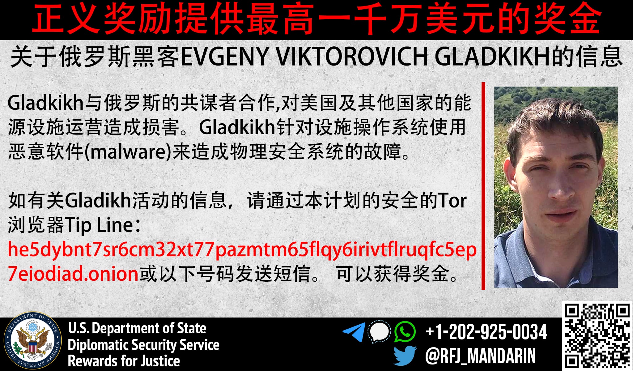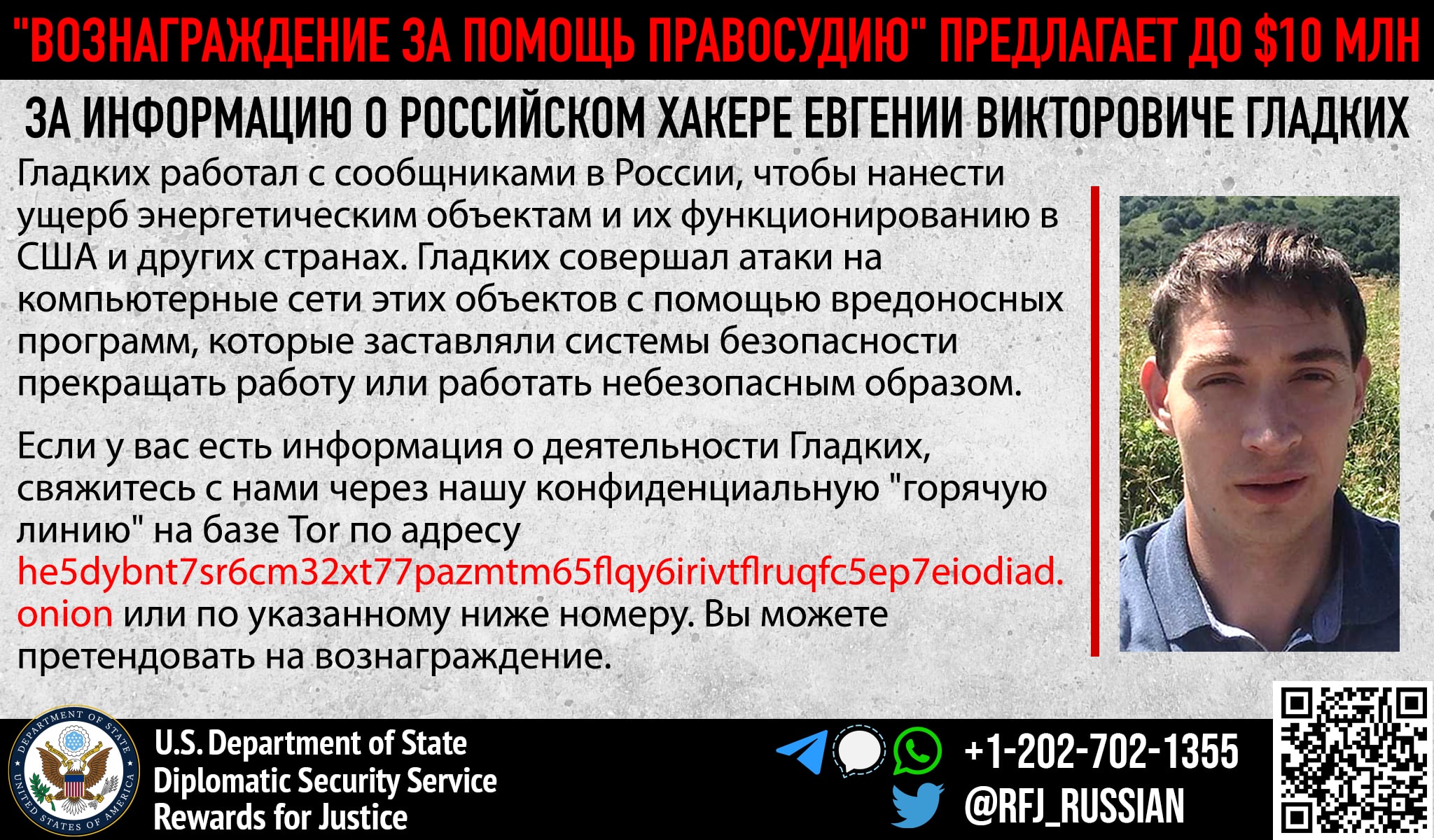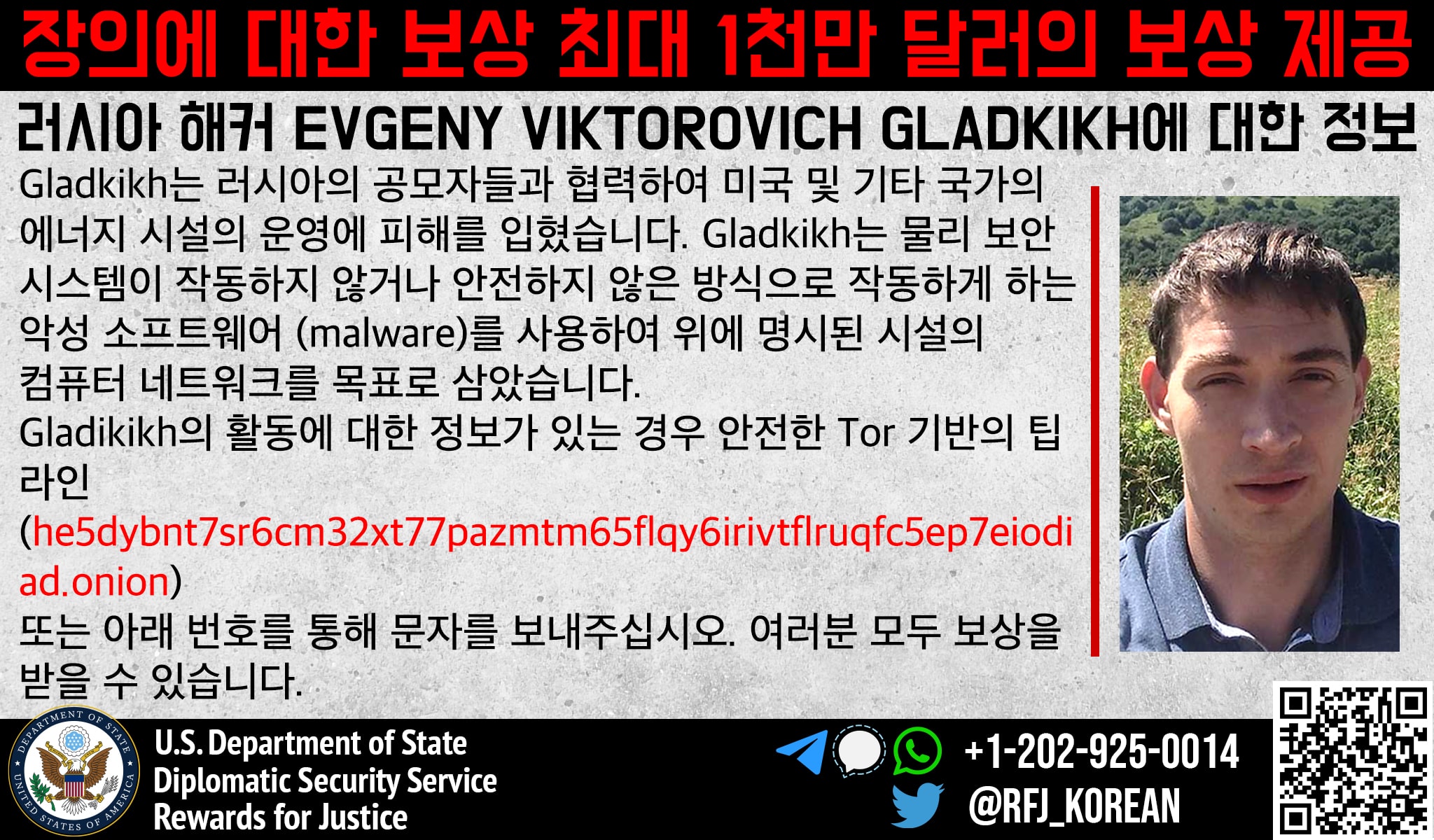 Anyone with information on Evgeny Viktorovich Gladkikh’s malicious cyberactivity should contact Rewards for Justice via the Tor-based tips-reporting channel at: he5dybnt7sr6cm32xt77pazmtm65flqy6irivtflruqfc5ep7eiodiad.onion (Tor browser required)