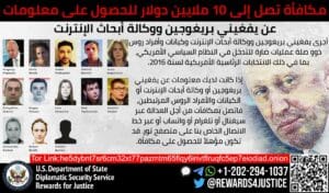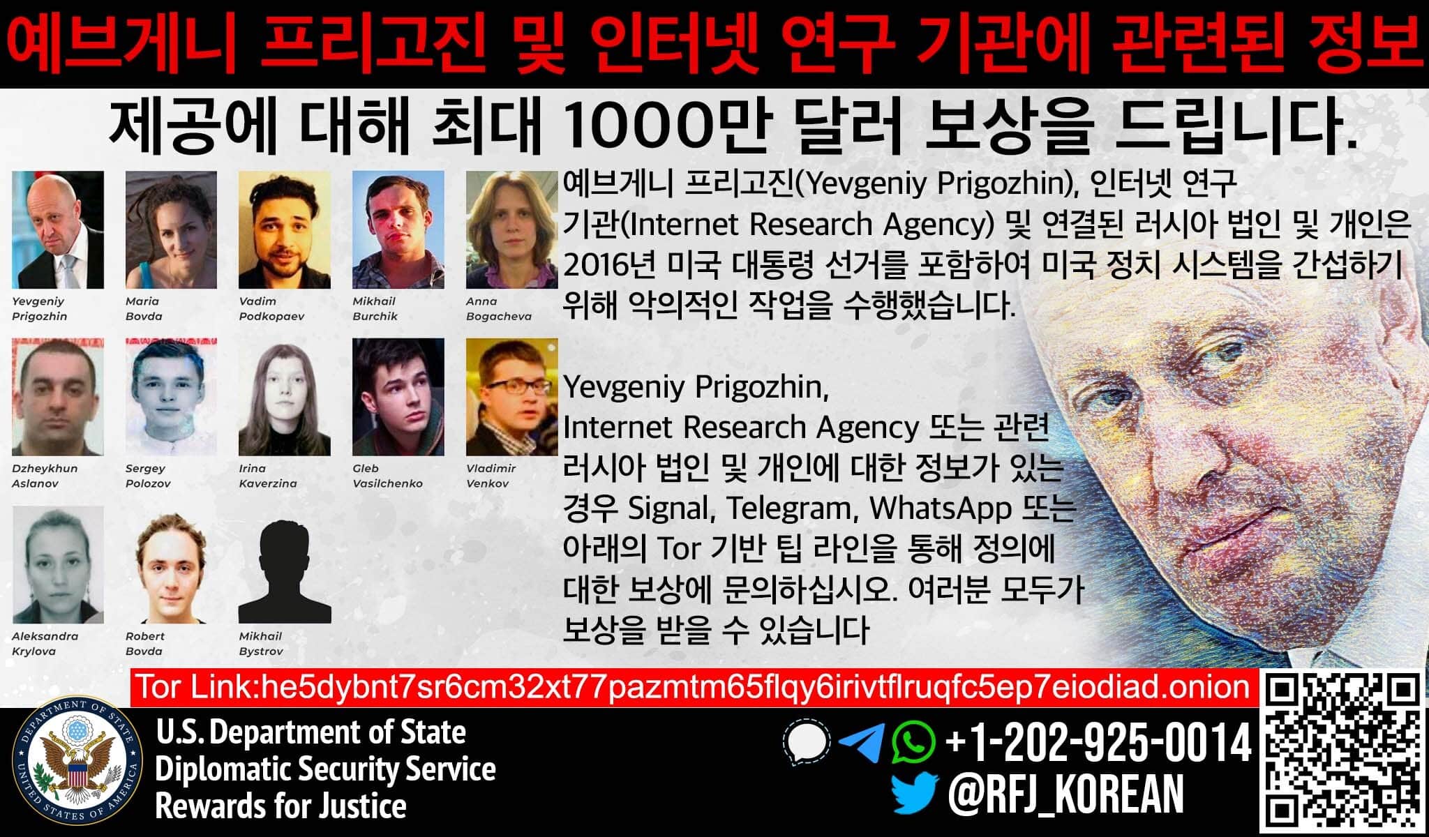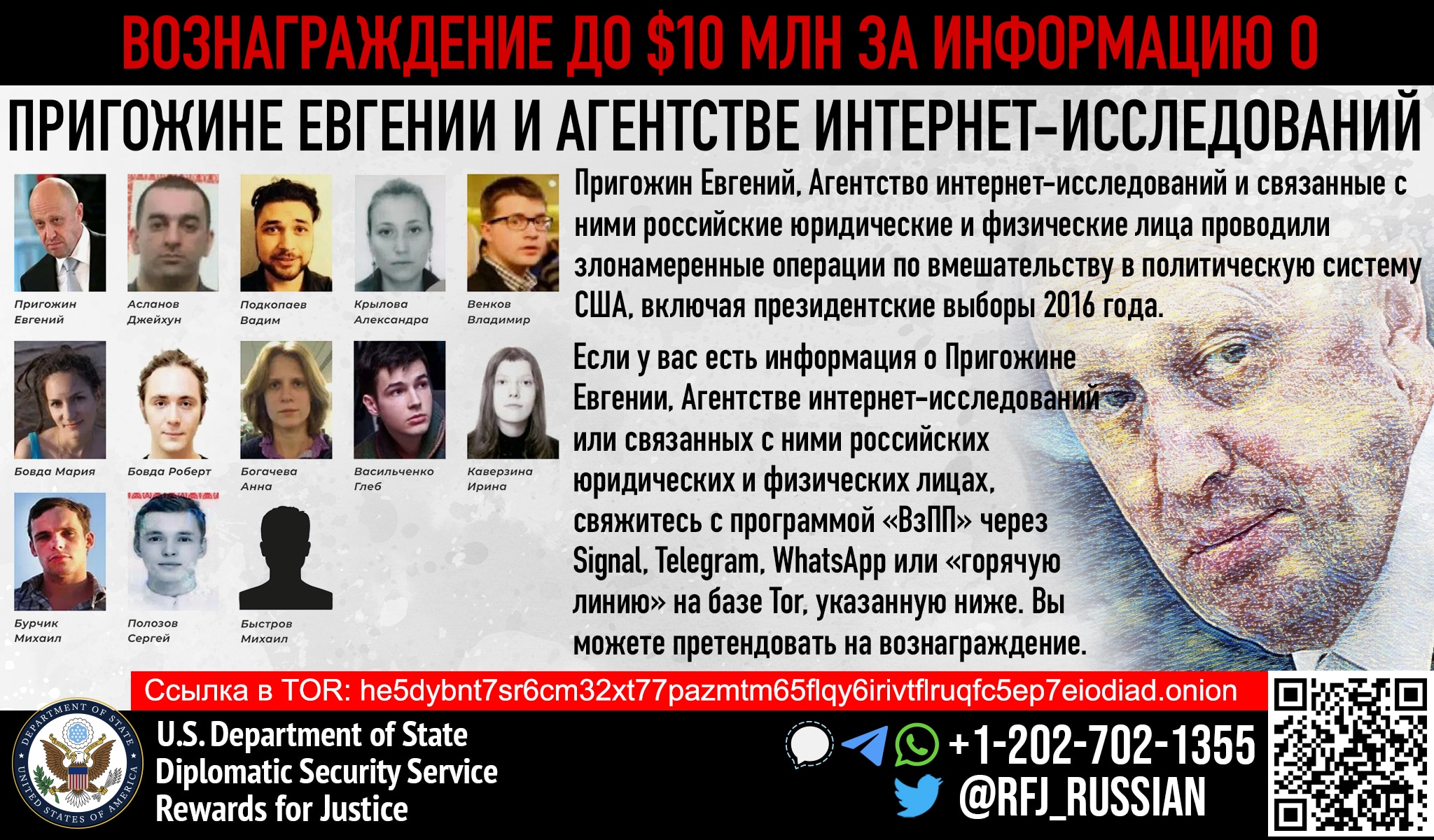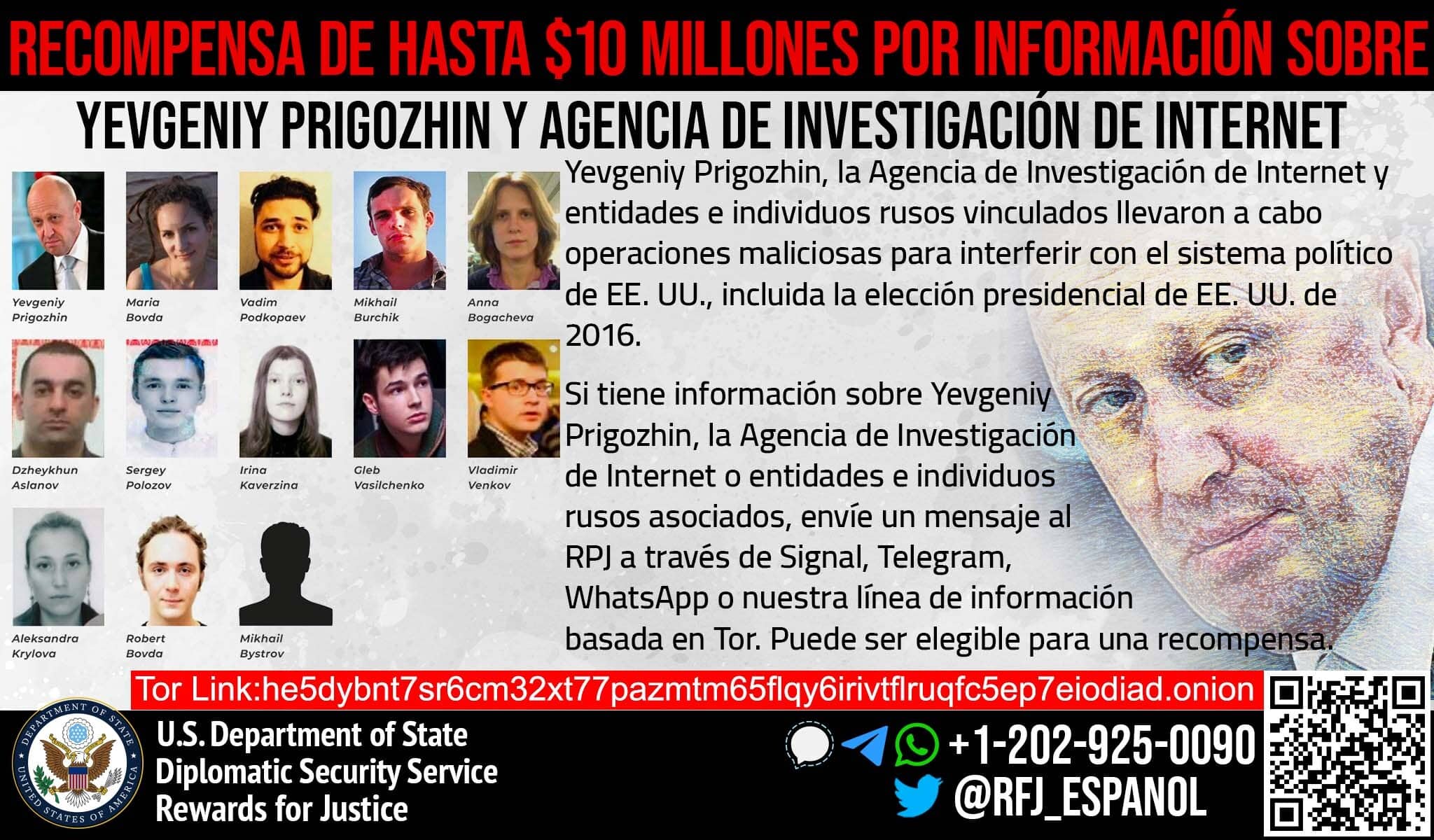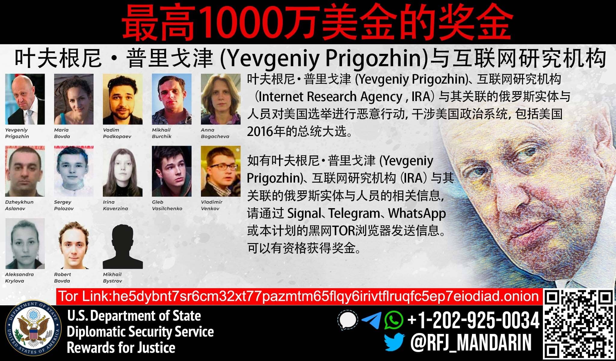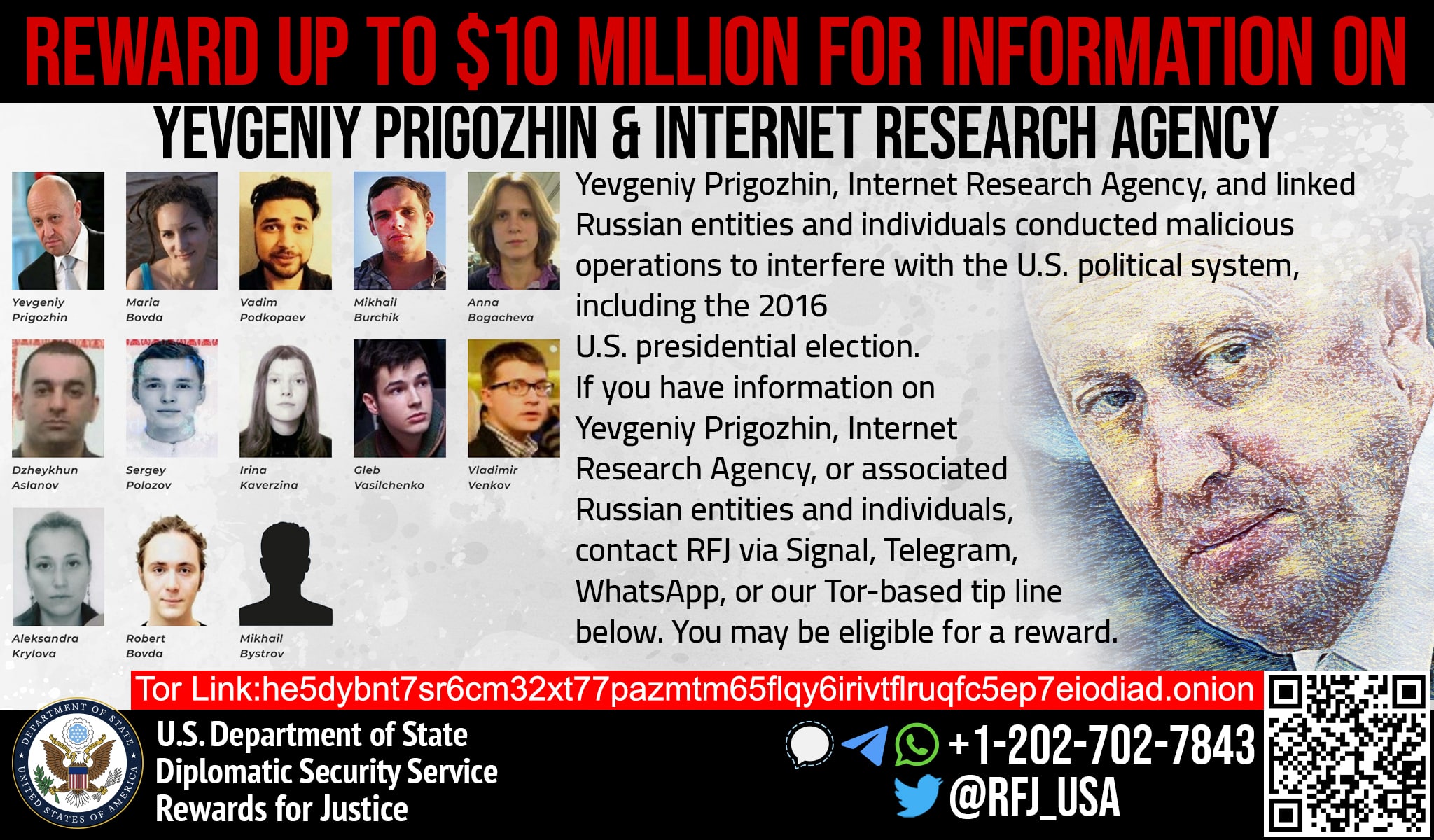Das Rewards for Justice-Programm sucht Informationen über die Internet Research Agency LLC (Internet-Forschungsagentur – IRA), Yevgeniy Viktorovich Prigozhin und verbundene russische Organisationen und Mitarbeiter wegen ihrer Beteiligung an der Beeinflussung der US-Wahlen, einschließlich der Präsidentschaftswahlen im Jahr 2016.