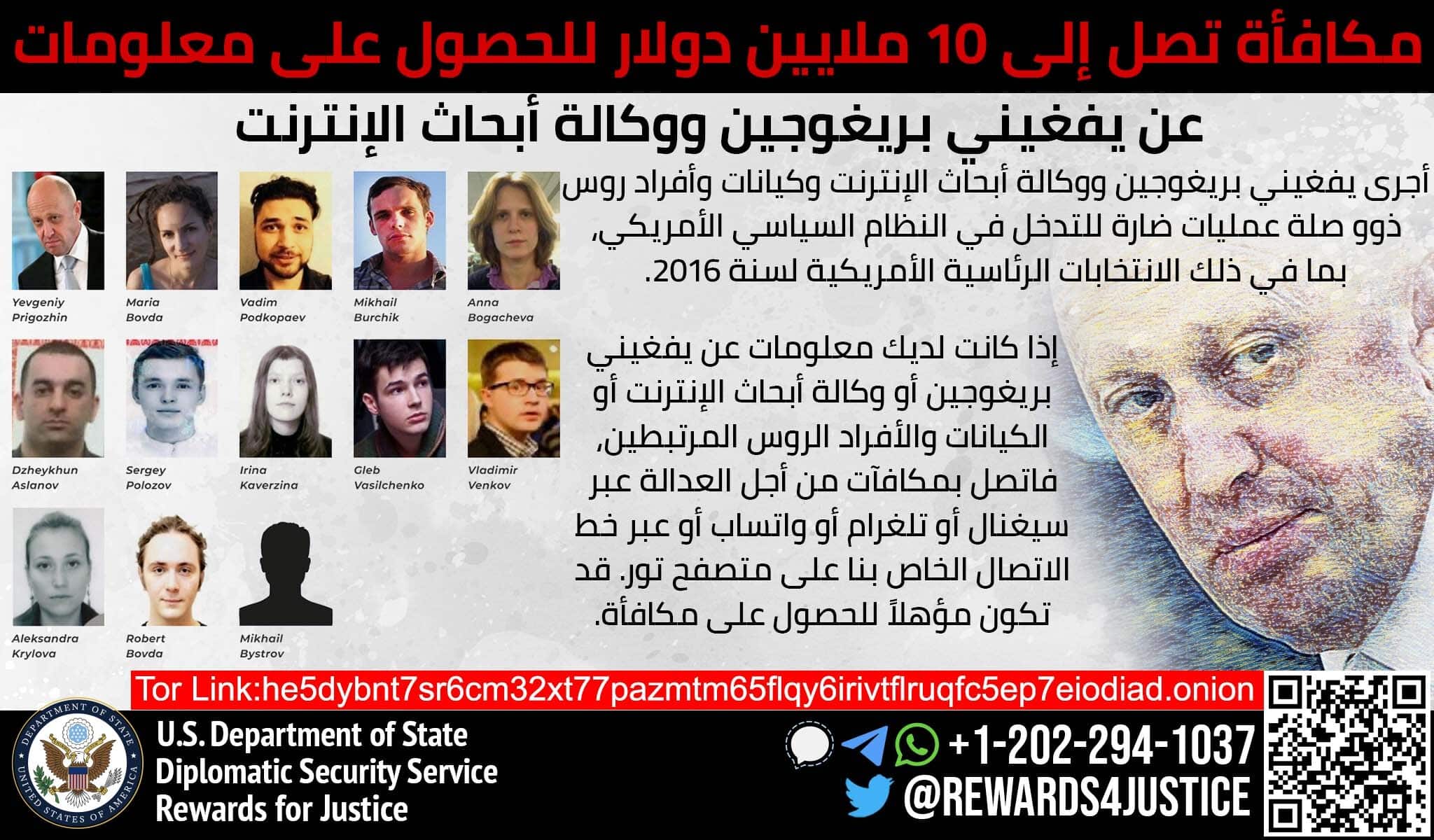 Personen mit Informationen über die Internet Research Agency, Yevgeniy Viktorovich Prigozhin und verbundene russische Organisationen und/oder Einzelpersonen, die mit dem Eingriff in US-Wahlen in Verbindung stehen, sollten das Rewards for Justice-Programm über unseren Tor-basierten Tipp-Meldekanal kontaktieren: he5dybnt7sr6cm32xt77pazmtm65flqy6irivtflruqfc5ep7eiodiad.onion (Tor-Browser erforderlich).
