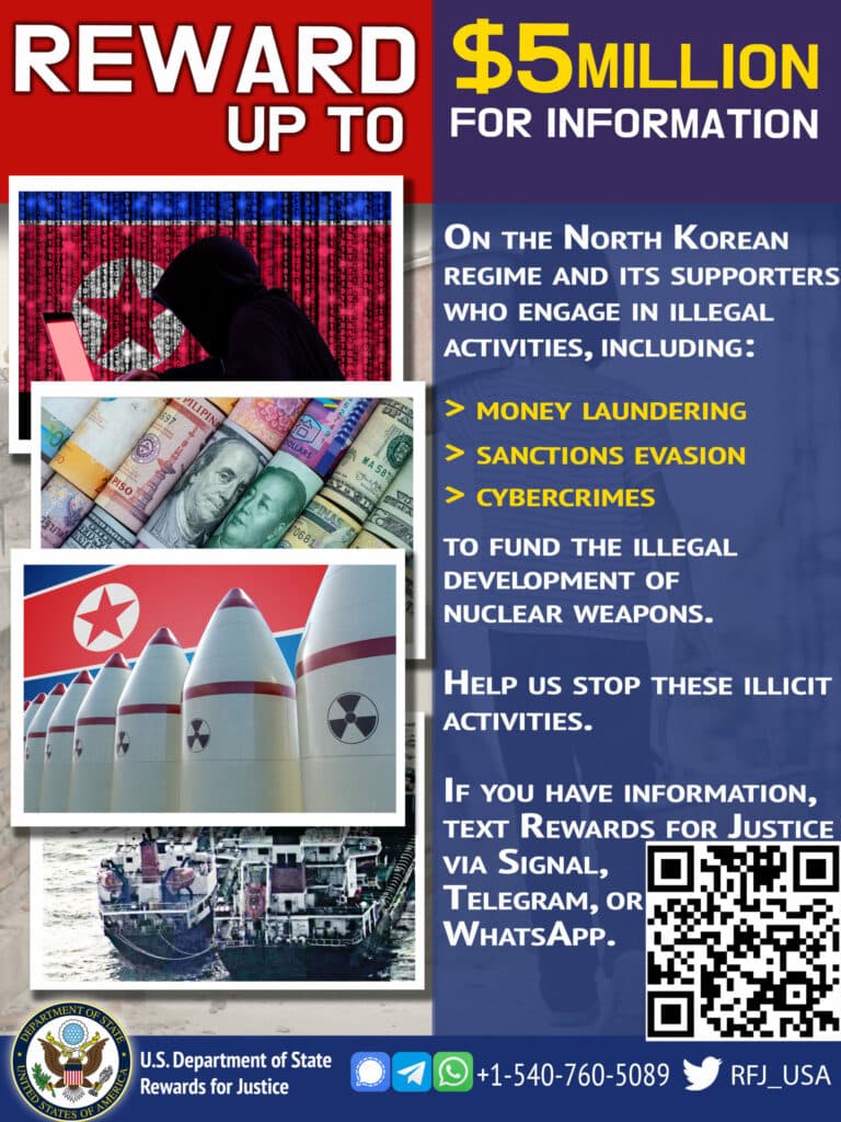 In order to support international efforts to disrupt North Korea’s illicit activities, the State Department’s Rewards for Justice (RFJ) program offers rewards of up to $5 million for information that leads to the disruption of financial mechanisms of persons engaged in certain activities that support North Korea, including money laundering, exportation of luxury goods to North Korea, specified cyber-activity and actions that support WMD proliferation.