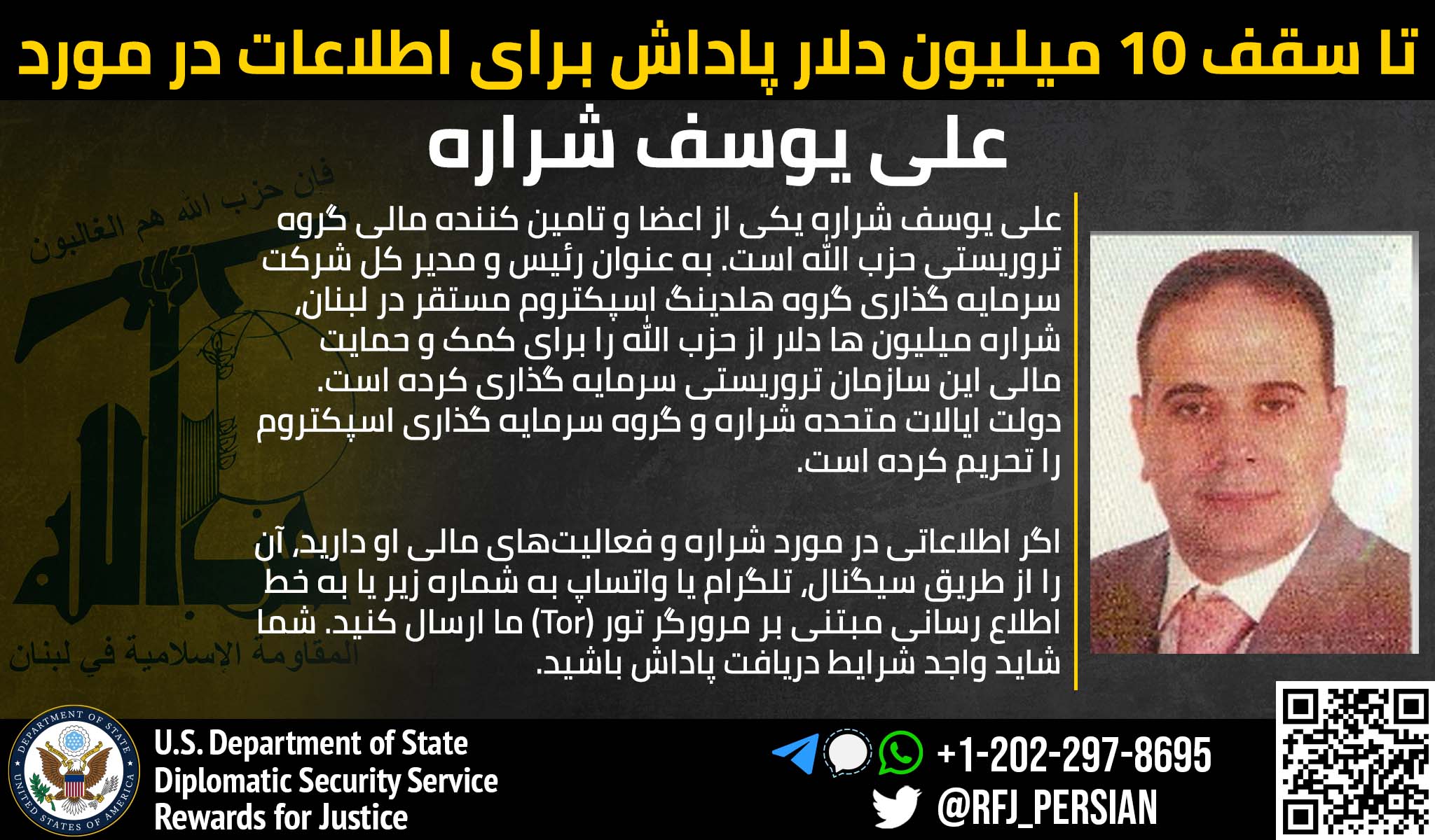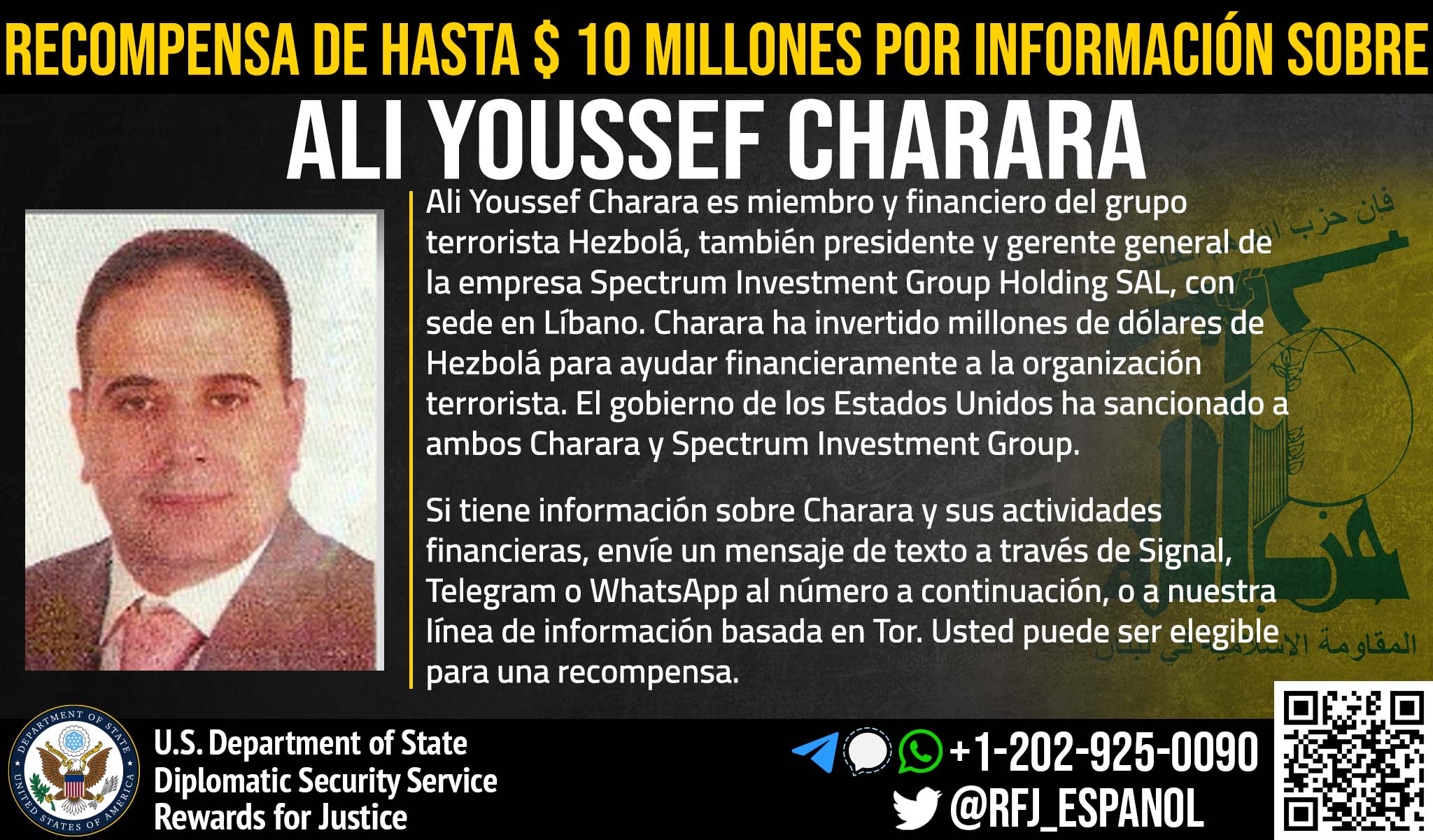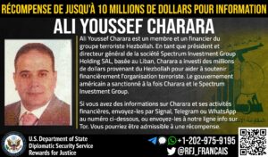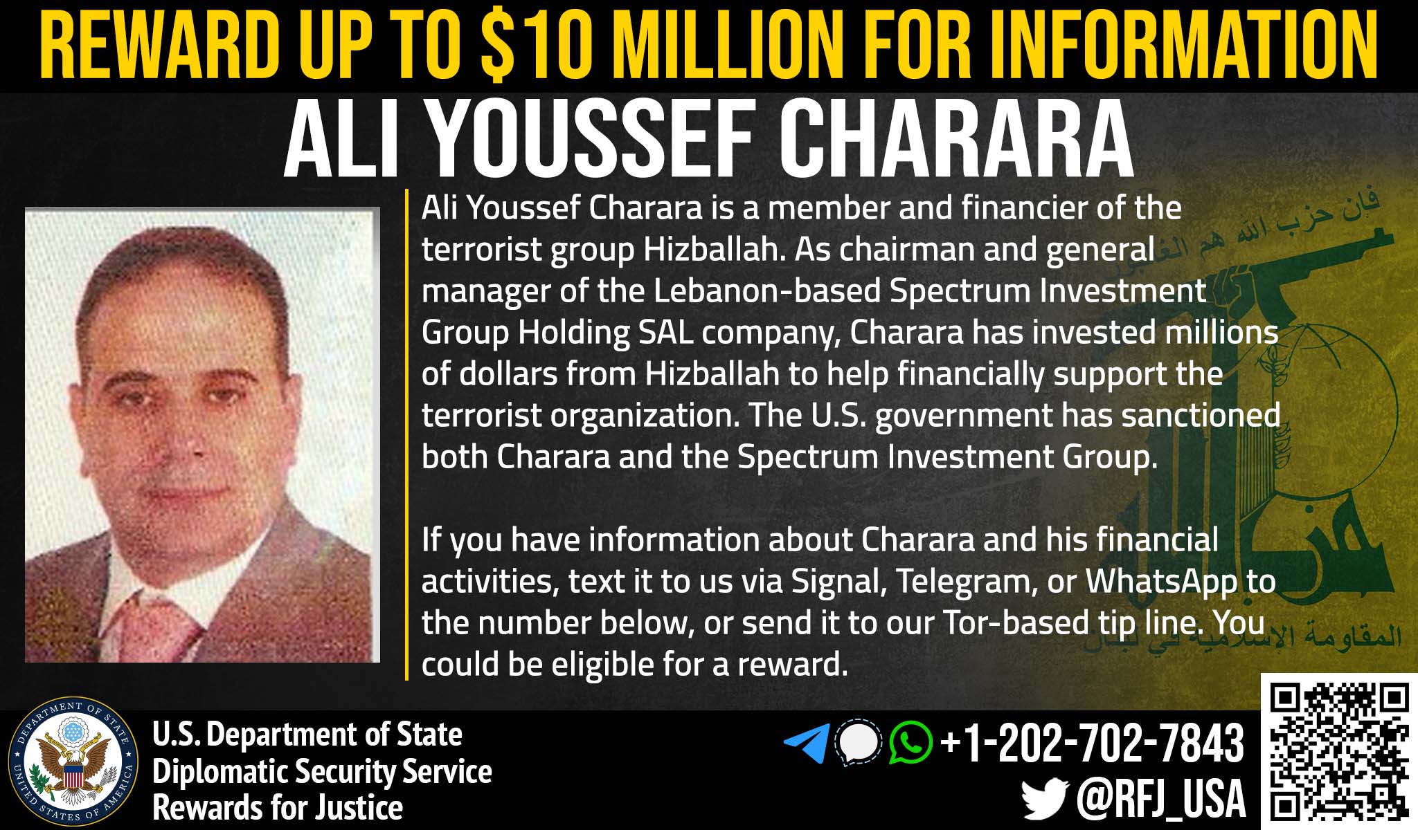 Το Πρόγραμμα Προσφορά Αμοιβής για Απονομή Δικαιοσύνης προσφέρει αμοιβή ύψους 10 εκατομμυρίων δολαρίων σχετικά με τη διάλυση των οικονομικών μηχανισμών της Χιζμπολάχ. Ο Αλί Γιούσεφ Χαράρα, επίσης γνωστός και ως Αλί Γιούσεφ Σιαράρα και Αλί Γιουσούφ Σιαράρα, είναι ο χρηματοδότης κλειδί της Χιζμπολάχ και Πρόεδρος και Γενικός Διευθυντής της εταιρίας τηλεπικοινωνιών Spectrum Investment Group Holding SAL, με έδρα τον Λίβανο, ένας φορέας στον οποίο επεβλήθηκε ποινή από το Υπουργείο Οικονομικών των ΗΠΑ. Ο Χαράρα έχει λάβει εκατομμύρια δολάρια από τη Χιζμπολάχ για να τα επενδύσει σε εμπορικά έργα, τα οποία στηρίζουν οικονομικά την τρομοκρατική οργάνωση.