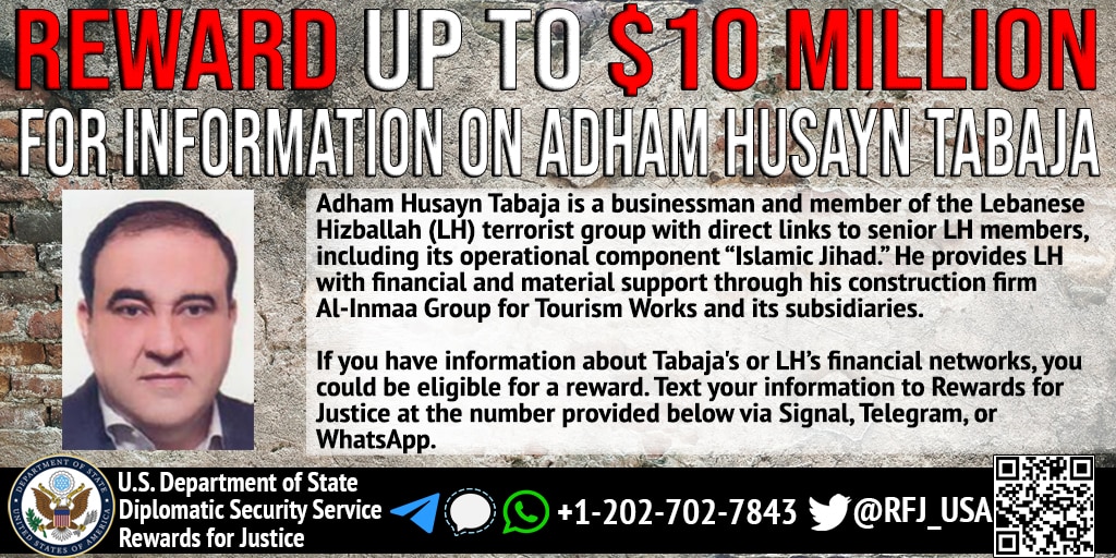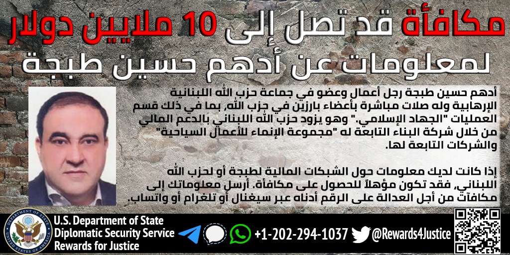 Το Πρόγραμμα Προσφοράς Αμοιβής για Απονομή Δικαιοσύνης προσφέρει αμοιβή ύψους 10 εκατομμυρίων δολαρίων για παροχή πληροφοριών οι οποίες οδηγούν στην διάλυση των οικονομικών μηχανισμών της Χιζμπολάχ. Ο Ατχάμ Χουσιάν Ταπάχα, επίσης γνωστός και ως Ατχάμ Ταπάχα είναι ένα μέλος της Χιζμπολάχ το οποίο διατηρεί άμεσους δεσμούς με τα ανώτερα οργανωτικά στοιχεία της ανώτερης βαθμίδας της Χιζμπολάχ, συμπεριλαμβανομένης και της Τζιχάντ, του λειτουργικού δομικού στοιχείου της τρομοκρατικής οργάνωσης.