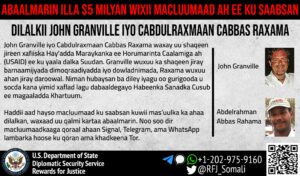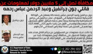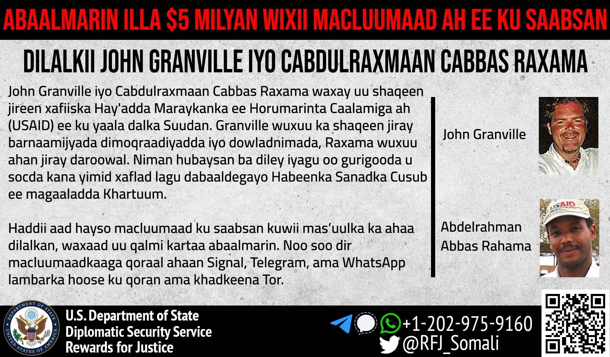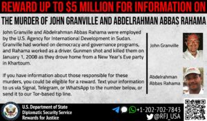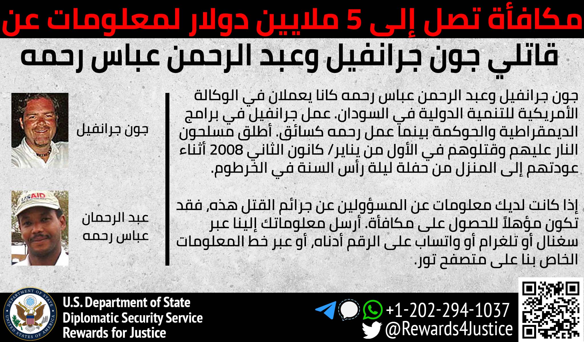 Το Πρόγραμμα Προσφοράς Αμοιβής για Απονομή Δικαιοσύνης προσφέρει αμοιβή ύψους 5 εκατομμυρίων δολαρίων για παροχή πληροφοριών σχετικά με τις δολοφονίες των υπαλλήλων της Αμερικανικής Υπηρεσίας Διεθνούς Ανάπτυξης (USAID), τον Τζων Γκράνβιλ και Αμπντελραχμάν Αμπάς Ραχάμα. Την 1η Ιανουαρίου 2008, ο Γκράνβιλ και ο Ραχάμα πήγαιναν στο σπίτι μετά από ένα πάρτυ παραμονής Πρωτοχρονιάς στην πόλη Χαρτούμ όταν πυροβολήθηκαν και σκοτώθηκαν. Δύο οργανώσεις ξεχωριστά ανέλαβαν ευθύνη για τις δολοφονίες: η τώρα ξεπερασμένη Αλ Κάιντα στη Γη των Δύο Νείλων (AQTN) και της Ansar al Tawhid (Υποστηρικτές του Μονοθεισμού).