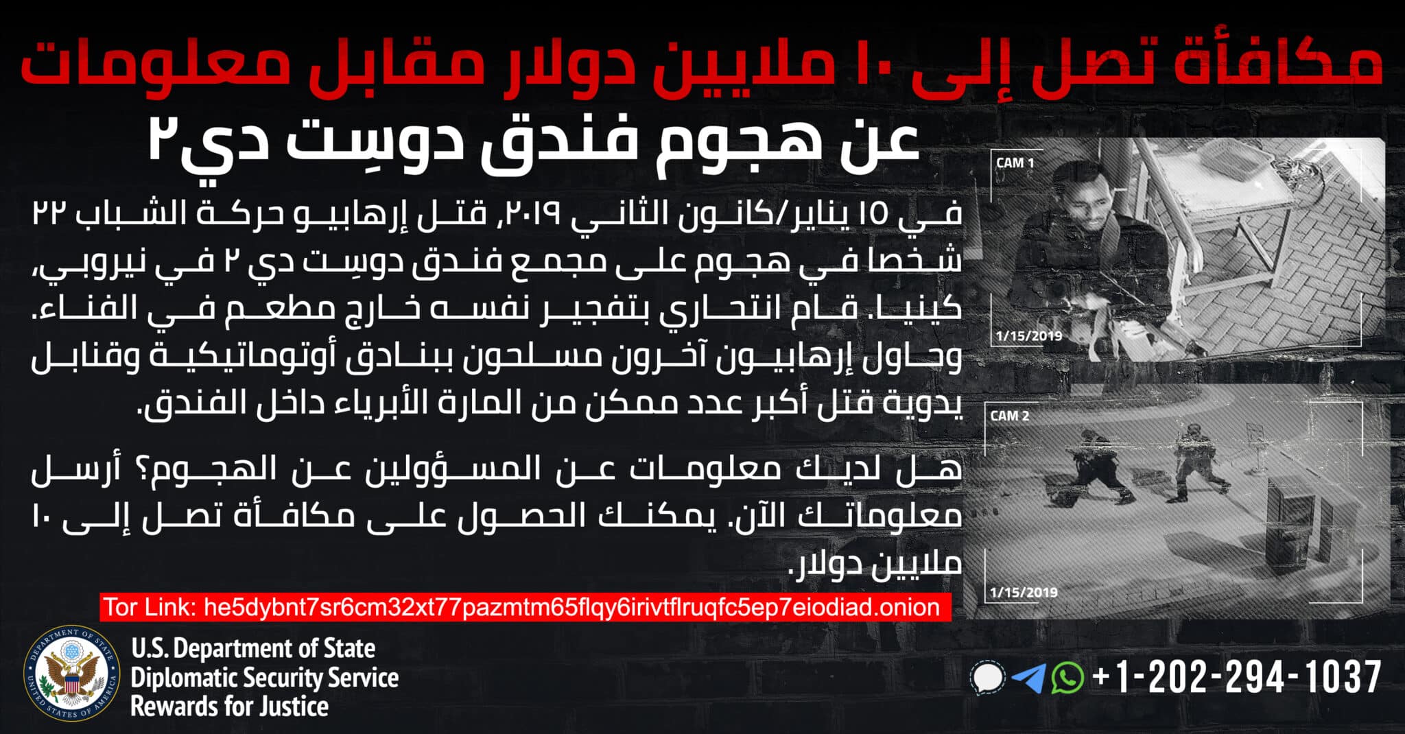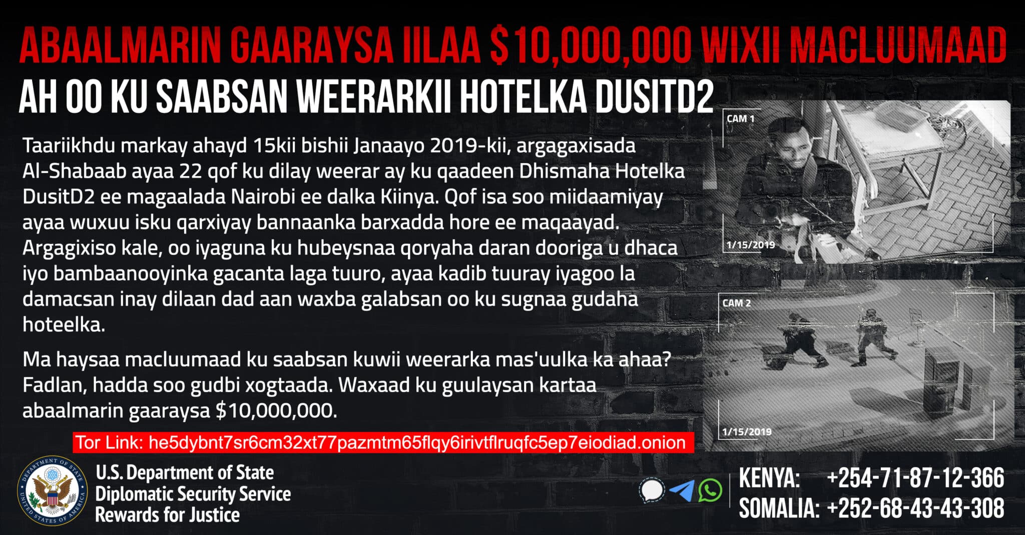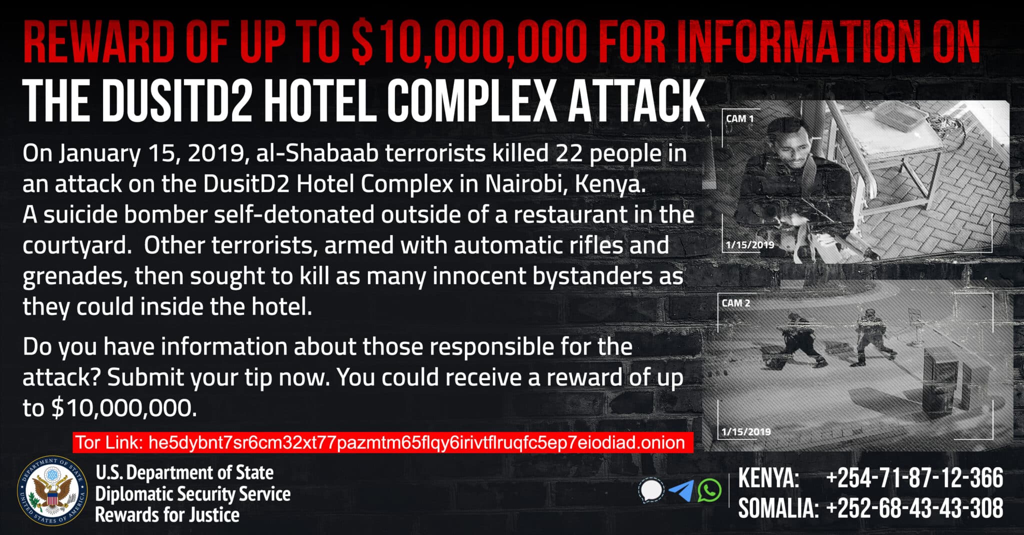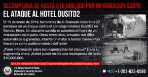 Το Πρόγραμμα Προσφοράς Αμοιβής για Απονομή Δικαιοσύνης προσφέρει αμοιβή, η οποία ανέρχεται στα 10 εκατομμύρια δολάρια για παροχή πληροφοριών σχετικά με τον Μοχάμουντ Άμπντι και οποιοδήποτε άλλο άτομο υπεύθυνο για την επίθεση από τρομοκράτες της Αλ Σεμπάμπ στο συγκρότημα Ξενοδοχείων DusitD2 το 2019, στο Ναιρόμπι στην Κένυα. Το απόγευμα της 15ης Ιανουαρίου, 2019, ένοπλοι άντρες της Αλ Σεμπάμπ, οπλισμένοι με εκρηκτικά, αυτόματα όπλα και ρουκέτες επιτέθηκαν στο εμπορικό κέντρο DusitD2, 6 κτιριακά συγκροτήματα καταστημάτων, γραφείων κι ενός ξενοδοχείου. Τουλάχιστον 21 άνθρωποι, συμπεριλαμβανομένου ενός Αμερικανού πολίτη, σκοτώθηκαν κατά την επίθεση. Η Αλ Σεμπάμπ-ένας σύνδεσμος της τρομοκρατικής οργάνωσης Αλ Κάιντα κυκλοφόρησε απευθείας ειδήσεις καθόλη τη διάρκεια της επίθεσης μέσω του Σιαχάντατου επίσημου Πρακτορείου Ειδήσεων της Σιαχάντα και εξέδωσε ανακοίνωση τύπου στην οποία δήλωσε ότι η επίθεση έγινε σύμφωνα με καθοδήγηση του τότε ηγέτη της Αλ Κάιντα, Άιμαν Ζαουάχιρι.