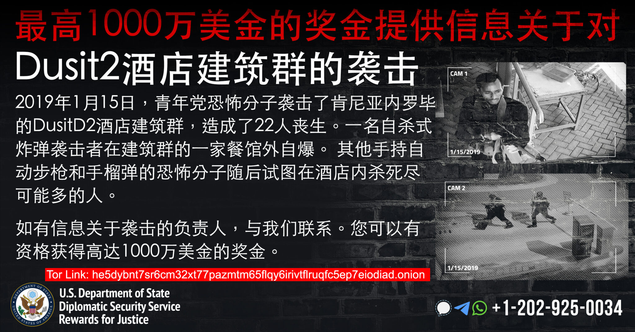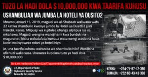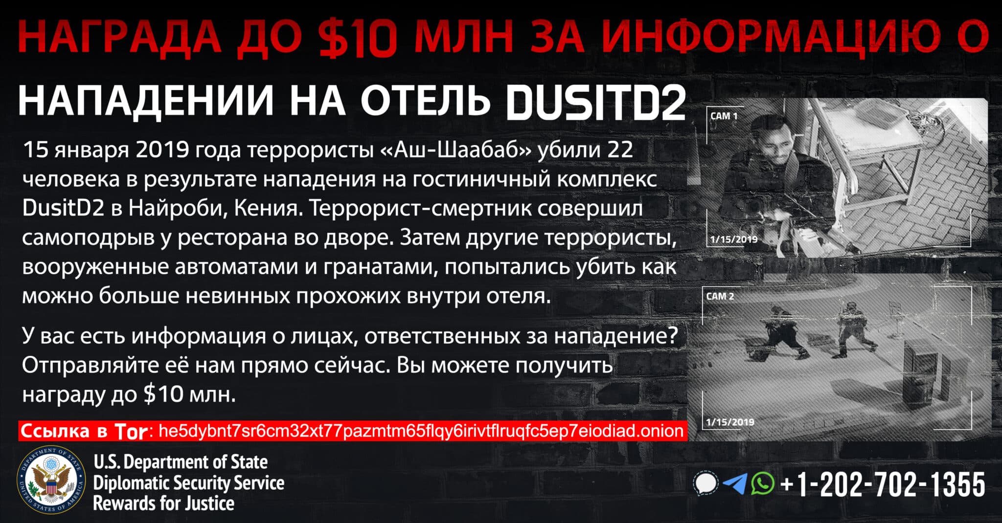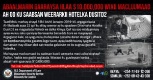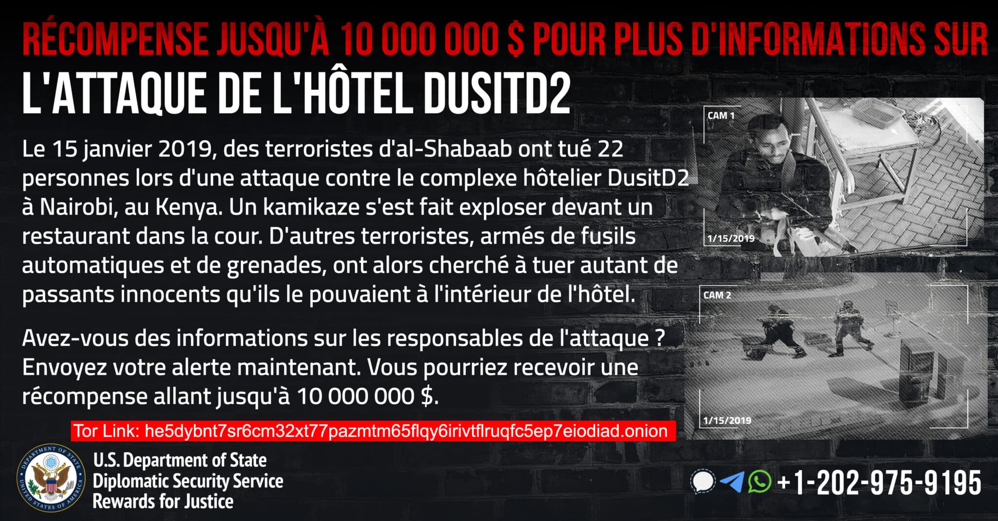 Το Πρόγραμμα Προσφοράς Αμοιβής για Απονομή Δικαιοσύνης προσφέρει αμοιβή, η οποία ανέρχεται στα 10 εκατομμύρια δολάρια για παροχή πληροφοριών σχετικά με τον Μοχάμουντ Άμπντι και οποιοδήποτε άλλο άτομο υπεύθυνο για την επίθεση από τρομοκράτες της Αλ Σεμπάμπ στο συγκρότημα Ξενοδοχείων DusitD2 το 2019, στο Ναιρόμπι στην Κένυα. Το απόγευμα της 15ης Ιανουαρίου, 2019, ένοπλοι άντρες της Αλ Σεμπάμπ, οπλισμένοι με εκρηκτικά, αυτόματα όπλα και ρουκέτες επιτέθηκαν στο εμπορικό κέντρο DusitD2, 6 κτιριακά συγκροτήματα καταστημάτων, γραφείων κι ενός ξενοδοχείου. Τουλάχιστον 21 άνθρωποι, συμπεριλαμβανομένου ενός Αμερικανού πολίτη, σκοτώθηκαν κατά την επίθεση. Η Αλ Σεμπάμπ-ένας σύνδεσμος της τρομοκρατικής οργάνωσης Αλ Κάιντα κυκλοφόρησε απευθείας ειδήσεις καθόλη τη διάρκεια της επίθεσης μέσω του Σιαχάντατου επίσημου Πρακτορείου Ειδήσεων της Σιαχάντα και εξέδωσε ανακοίνωση τύπου στην οποία δήλωσε ότι η επίθεση έγινε σύμφωνα με καθοδήγηση του τότε ηγέτη της Αλ Κάιντα, Άιμαν Ζαουάχιρι.