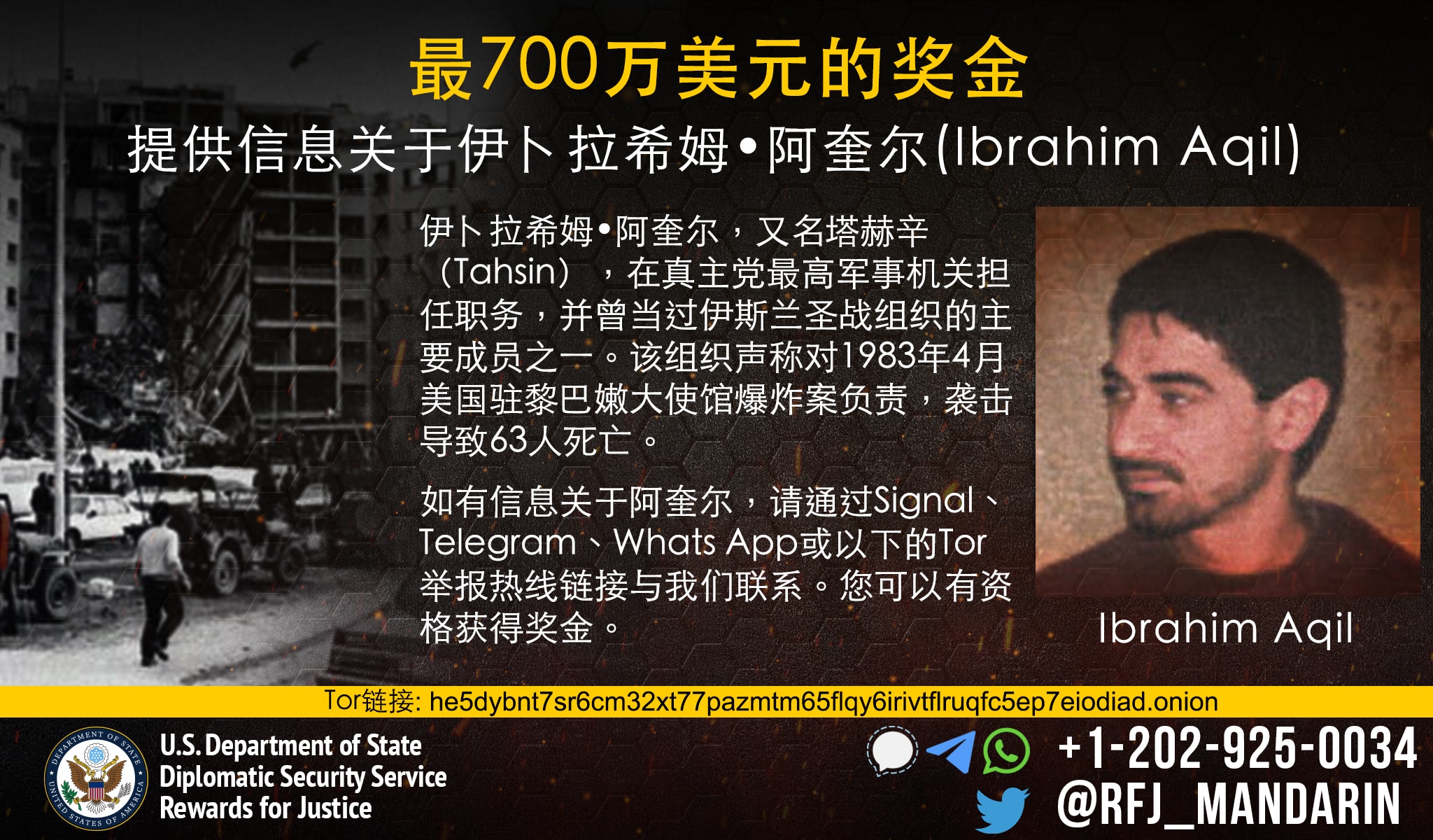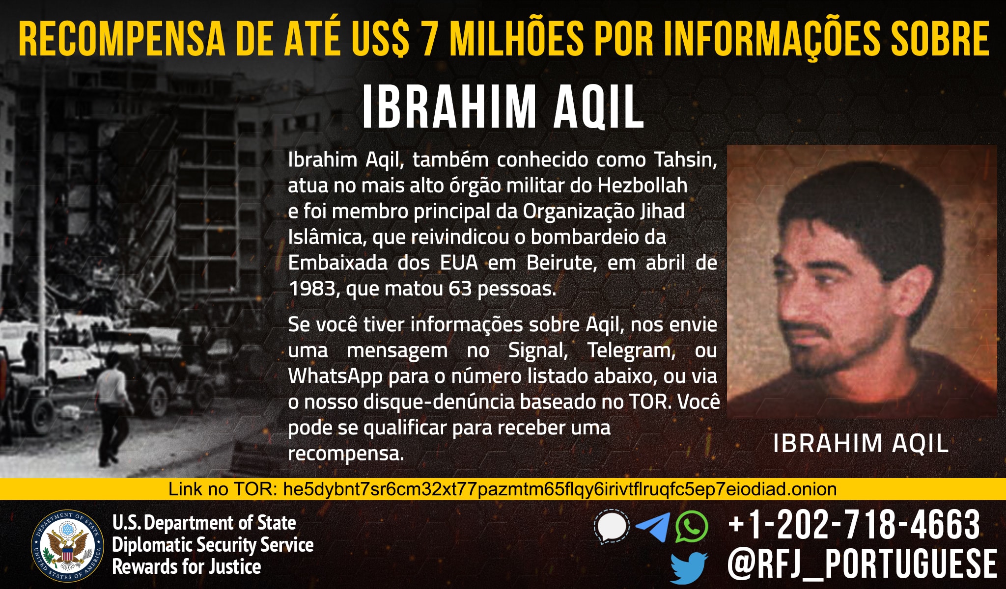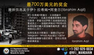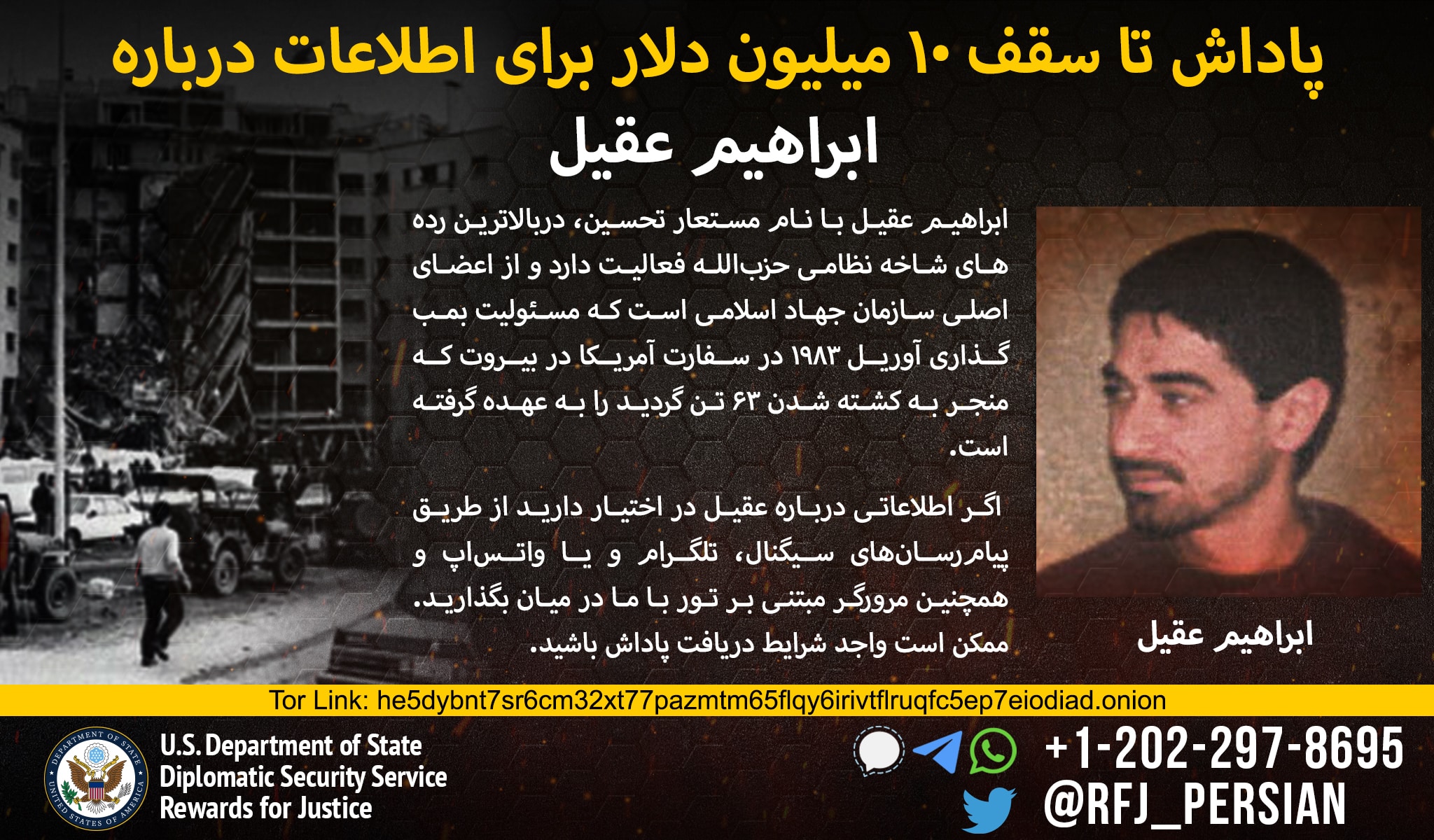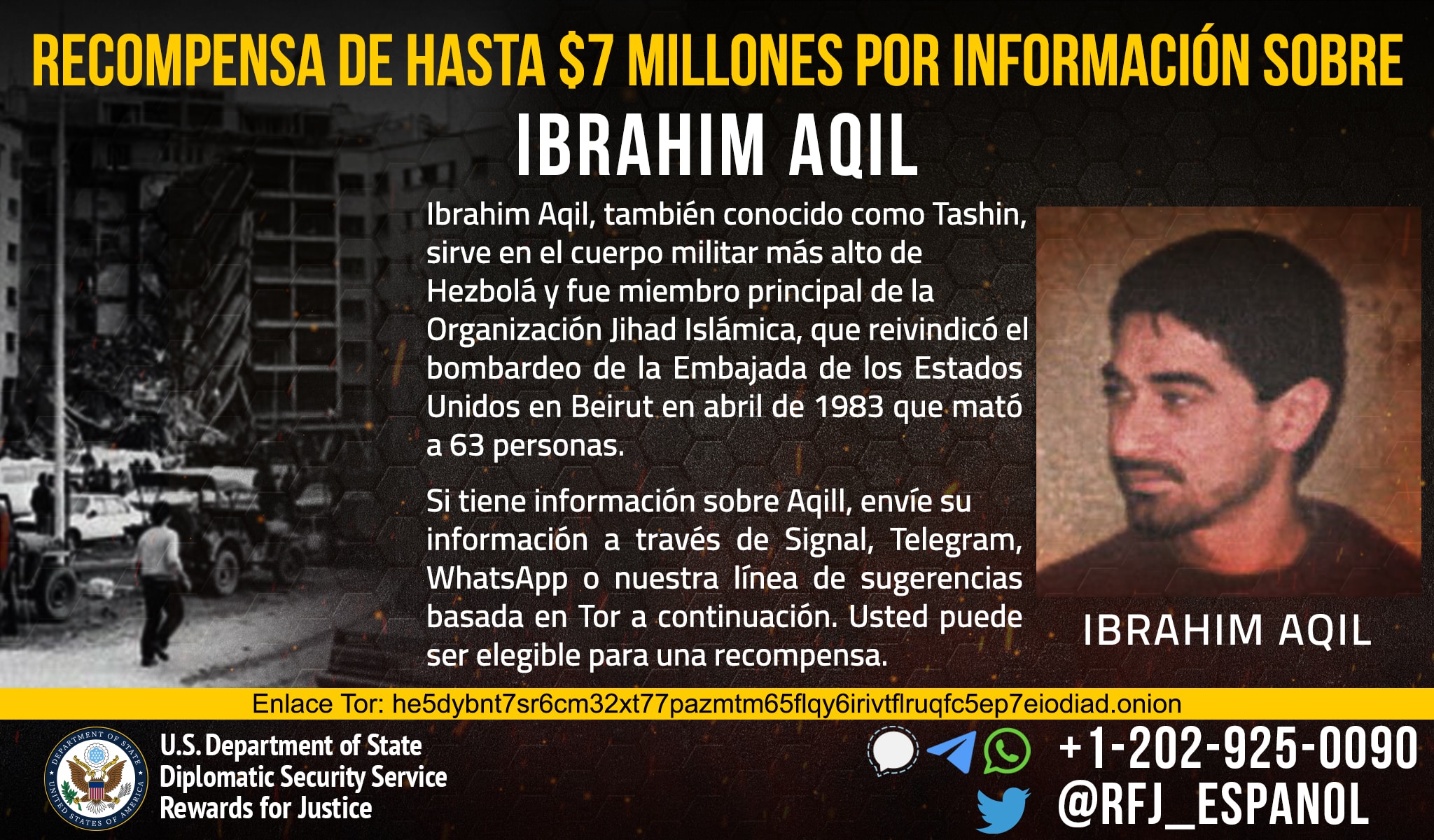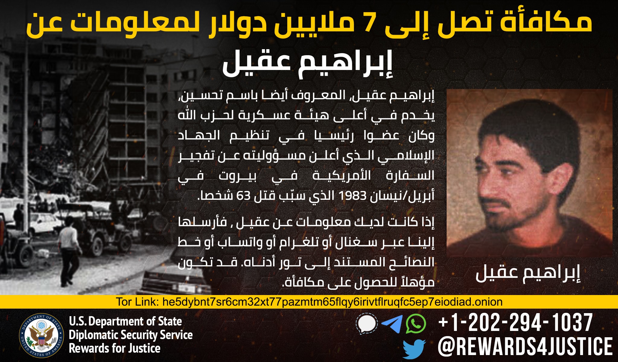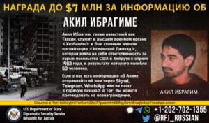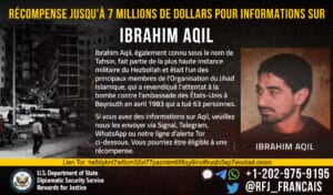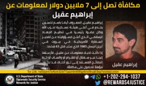 Το Πρόγραμμα Προσφοράς Απονομής Δικαιοσύνης προσφέρει αμοιβή που ανέρχεται στα 7 εκατομμύρια δολάρια για παροχή πληροφοριών σχετικά με τον ηγέτη κλειδί της Χιζμπολάχ, Ιμπραχήμ Ακίλ.
