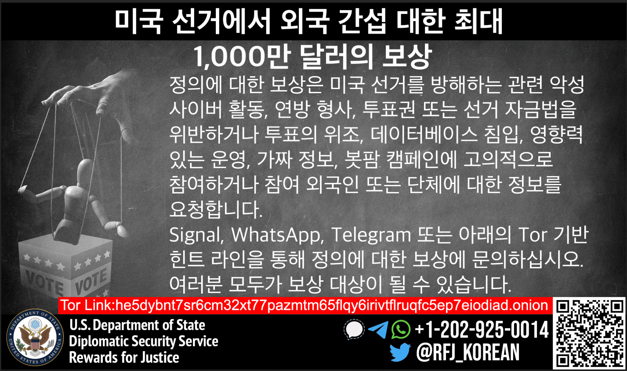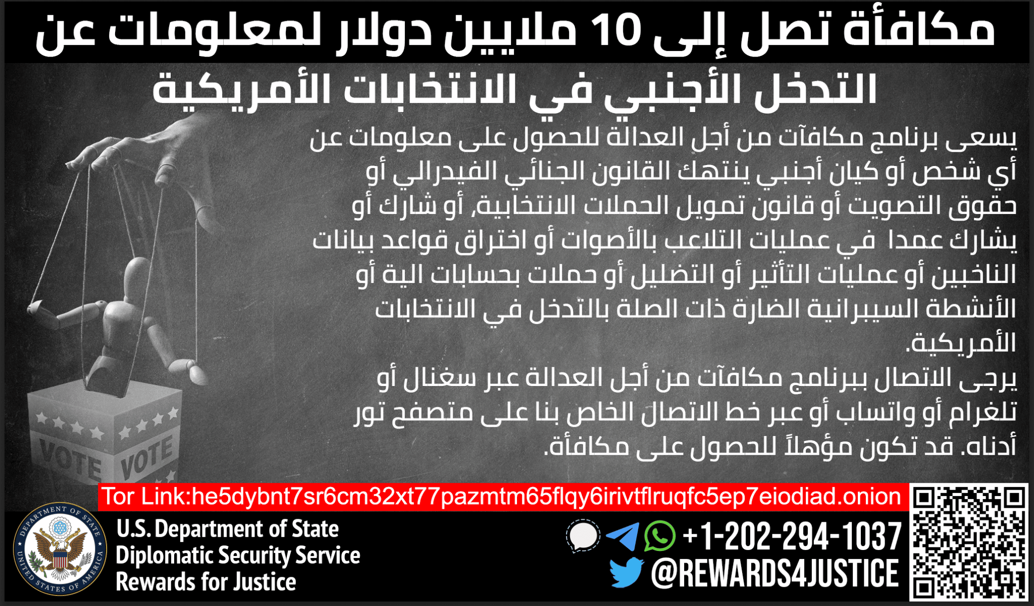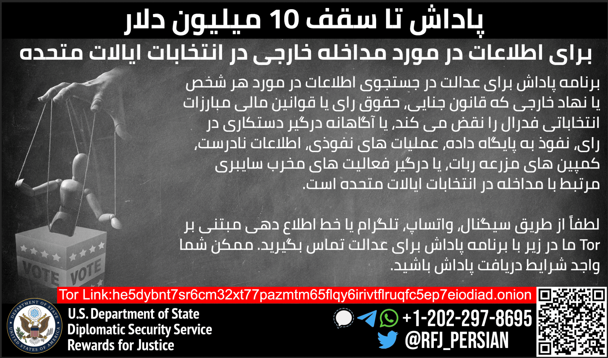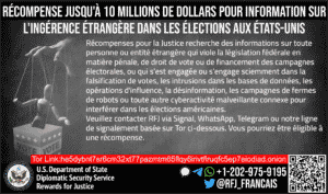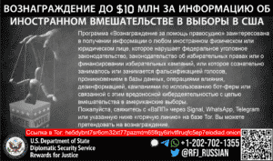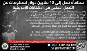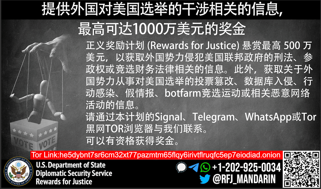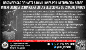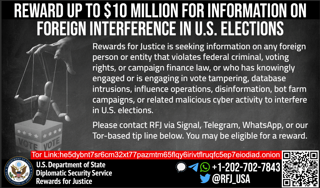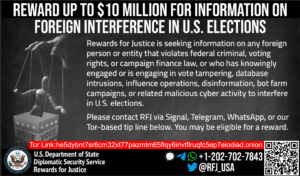 Rewards for Justice is offering a reward of up to $10 million for information on foreign interference in U.S. elections.