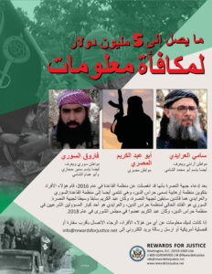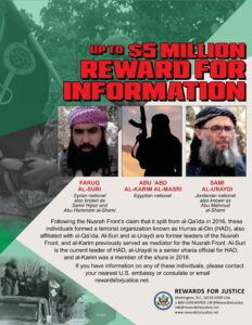 «پاداش برای عدالت» بهازای اطلاعات مربوط به ابو عبدالکریم المصری، معروف به کریم، تا 5 میلیون دلار پاداش میپردازد. المصری عضو بازنشسته القاعده (AQ) است و از فرماندهان ارشد حرّاس الدین (HAD)، گروه جهادی وابسته به AQ، محسوب میشود. در سال 2018، المصری عضو شورای HAD، نهاد تصمیمساز ارشد گروه، بود و بهعنوان رابط HAD و هیات تحریر شام، از گروههای پوششی وابسته به AQ (که HAD از آن جدا شده بود) فعالیت میکرد.