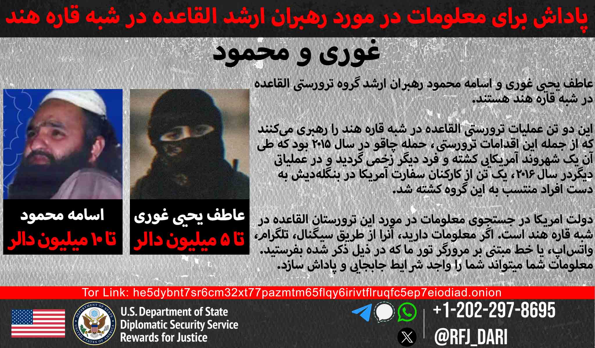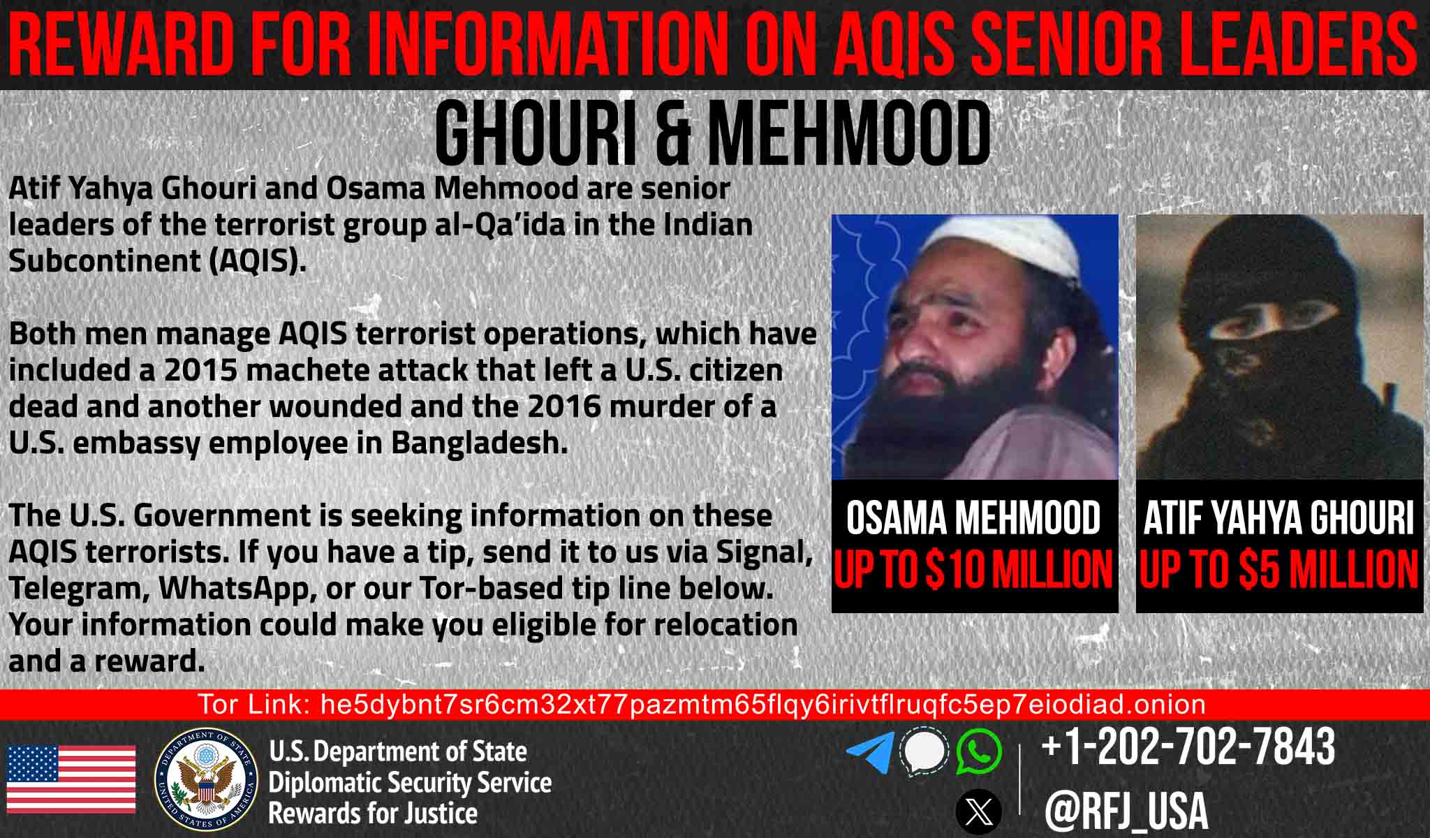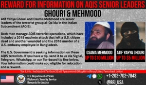 برنامه پاداش برای عدالت تا ۵ میلیون دلار پاداش برای اطلاعات درباره اسامه محمود -امیر گروه تروریستی القاعده در شبه قاره هند (AQIS)- در نظر گرفته است.