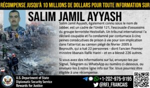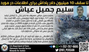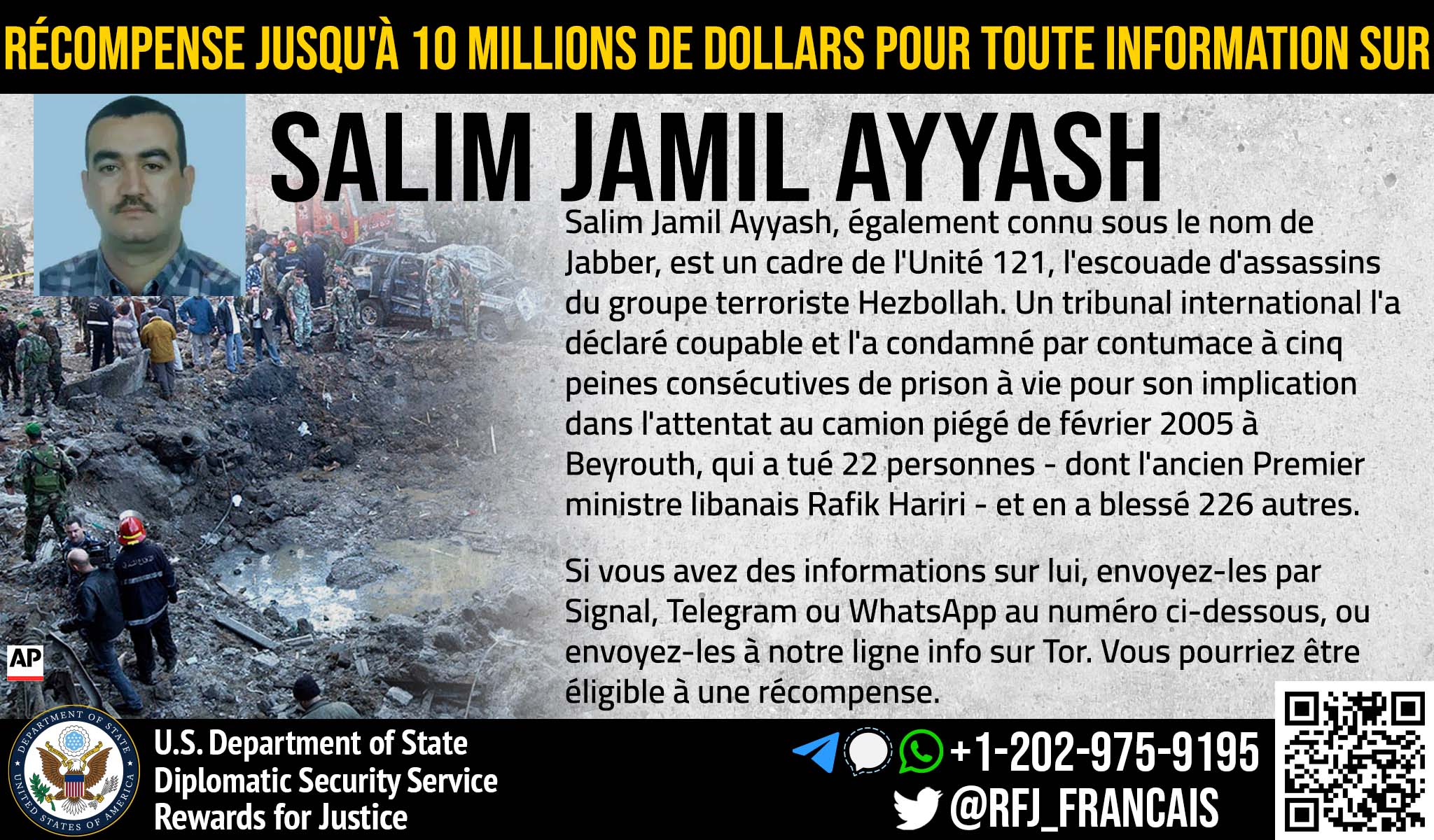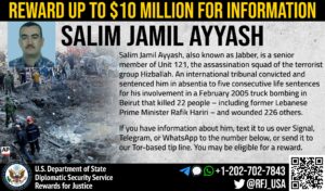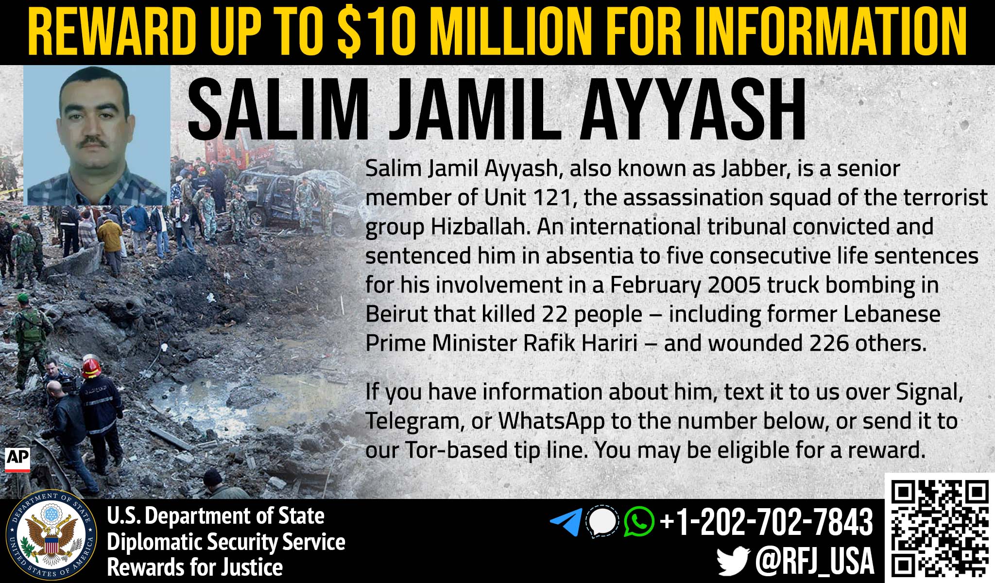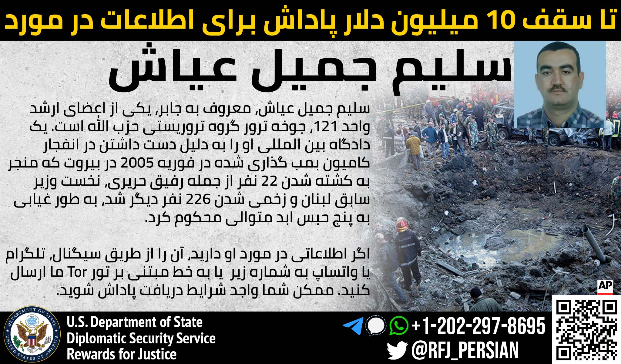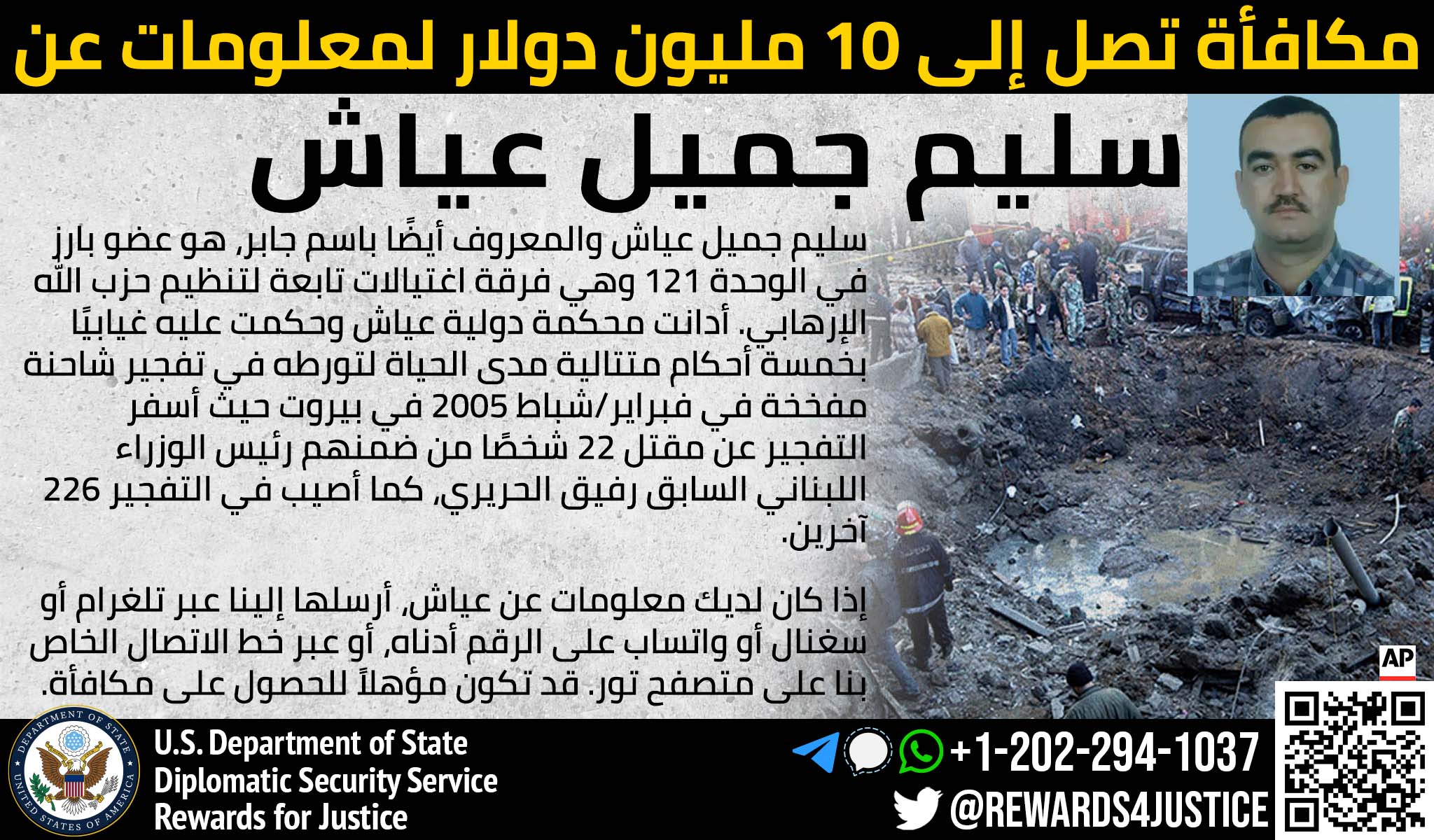 «پاداش برای عدالت» به‌ازای اطلاعات مربوط به سلیم جمیل عیاش، معروف به سلیم جلیل عیاش و جابر، تا 10 میلیون دلار پاداش می‌پردازد. عیاش از عوامل ارشد واحد 121 حزب الله، جوخه ترور این گروه تروریستی، است که مستقیماً از حسن نصرالله، دبیرکل حزب الله، دستور می‌گیرد. عیاش ظاهراً در اقدامات مربوط به حمله به پرسنل نظامی ایالات متحده شرکت داشته است.