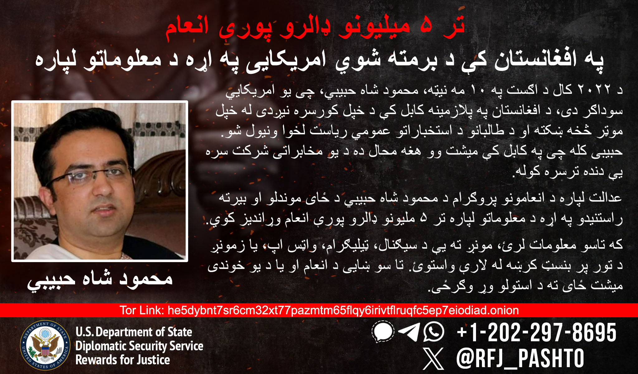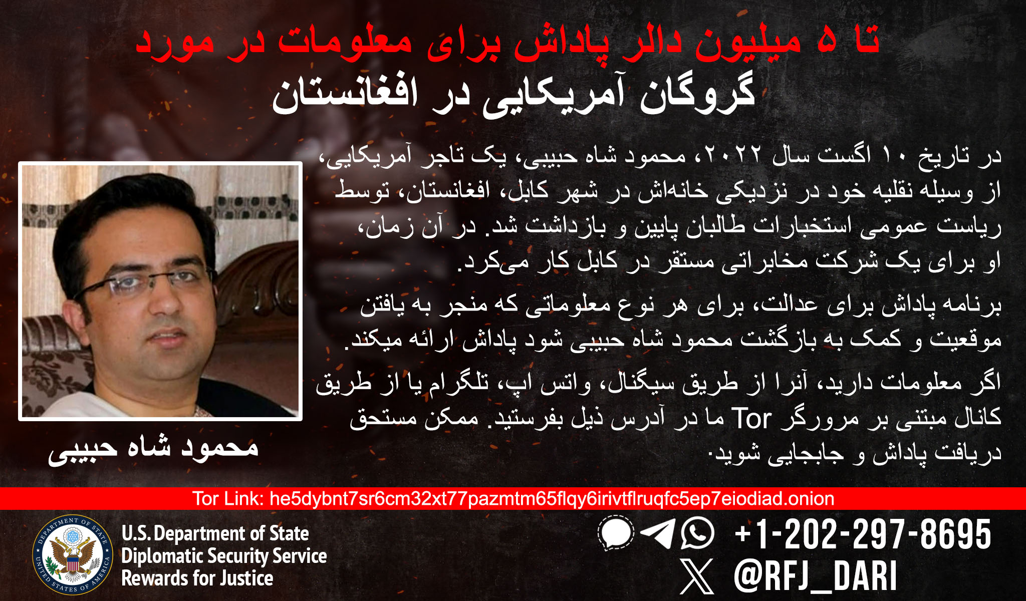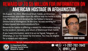 «پاداش برای عدالت» تا ۵ میلیون دالر پاداش برای اطلاعاتی در نظر گرفته است که منجر به یافتن مکان و کمک به بازگشت تاجر آمریکایی، «محمود شاه حبیبی» گردد که در تاریخ ۱۰ آگست ۲۰۲۲ در افغانستان ناپدید شده است.