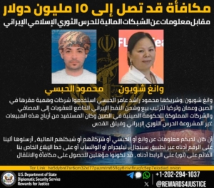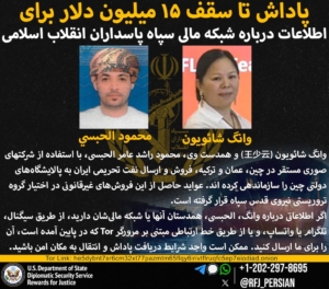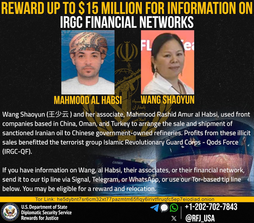 برنامه «پاداش برای عدالت» به نمایندگی از وزارت خارجه ایالات متحده، برای اطلاعاتی که موجب اختلال در سازوکارهای مالی سپاه پاسداران – که در فهرست سازمانهای تروریستی خارجی قرار دارد- و همچنین زیرشاخههای مختلف آن از جمله نیروی قدس سپاه گردد، تا سقف ۱۵ میلیون دلار پاداش در نظر گرفته است. سپاه پاسداران، بازوی اصلی حکومت جمهوری اسلامی برای حمایت از گروههای تروریستی در خارج از کشور است و تا کنون تأمین مالی بسیاری از حملات و اقدامات تروریستی در سطح جهان را بر عهده داشته است. سپاه، بخشی از هزینه فعالیتهای تروریستی خود را از طریق فروش نفت تحریمی ایران توسط شبکهای از شرکتهای نیابتی تأمین میکند که این شرکتها این درآمدهای غیرقانونی را از طریق شبکه بانکی آمریکا تطهیر میکنند.