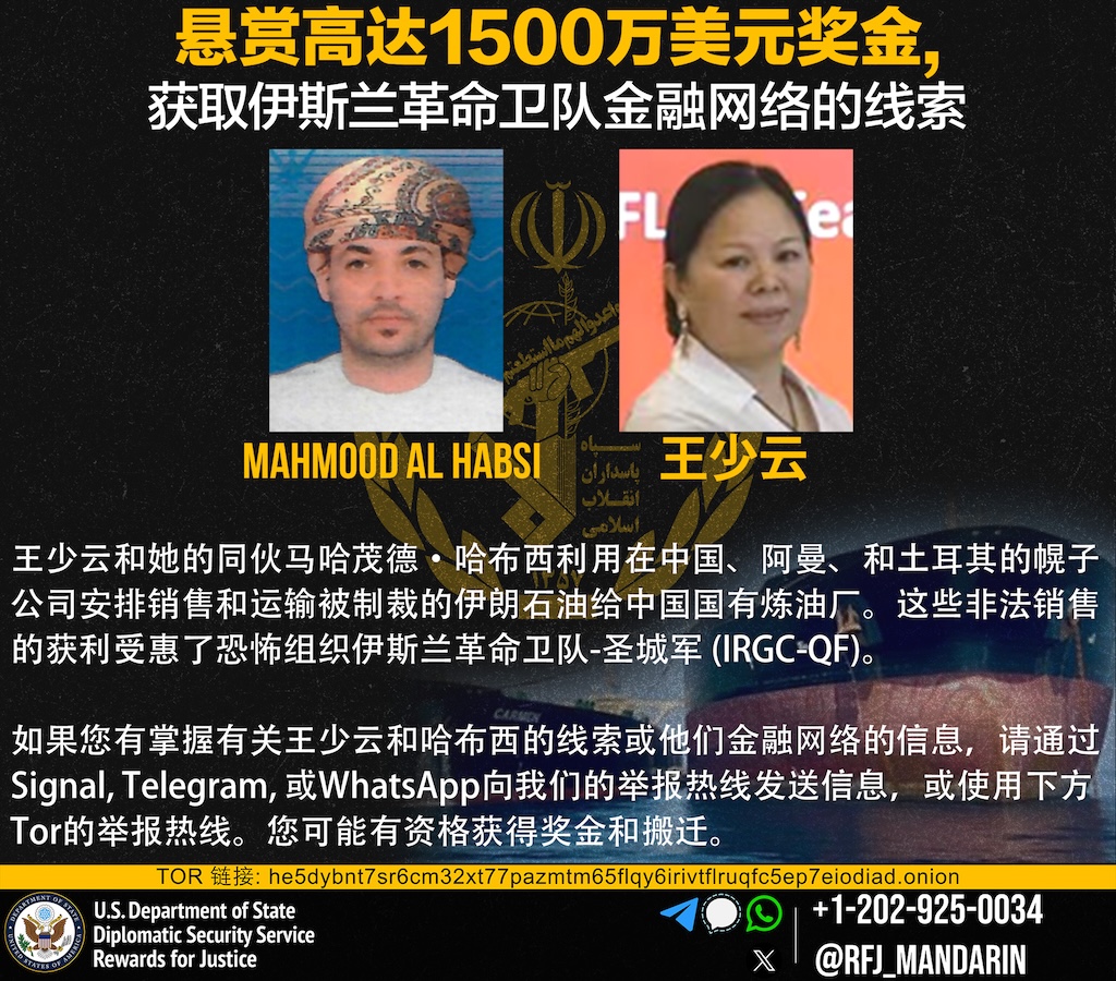 از سال ۲۰۱۹ تا دست کم ژوئیه ۲۰۲۱، وانگ شائویون (王少云) تبعه چین و همکار عمانی وی، محمود راشد عامر الحبسی، با بهره بردن از افراد و شرکتهای صوری مستقر در چین، عمان و ترکیه، عملیات فروش و حمل نفت تحریمی ایران به پالایشگاهها و شرکتهای دولتی چین به نفع نیروی قدس سپاه را بر عهده داشتهاند. وانگ به نمایندگی از سوی شرکتهای چینی، وظیفه هماهنگی فروش نفت ایران از طریق شرکتهای پوششی مستقر در آمریکا را بر عهده داشته است و الحبسی نیز با سود بردن از شرکتها و شبکه کشتیرانی خود، از جمله نفتکشی با پرچم لیبریا با نام موتور تانکر «عمان پراید» انتقال و فروش این نفت را تسهیل میکرده است.