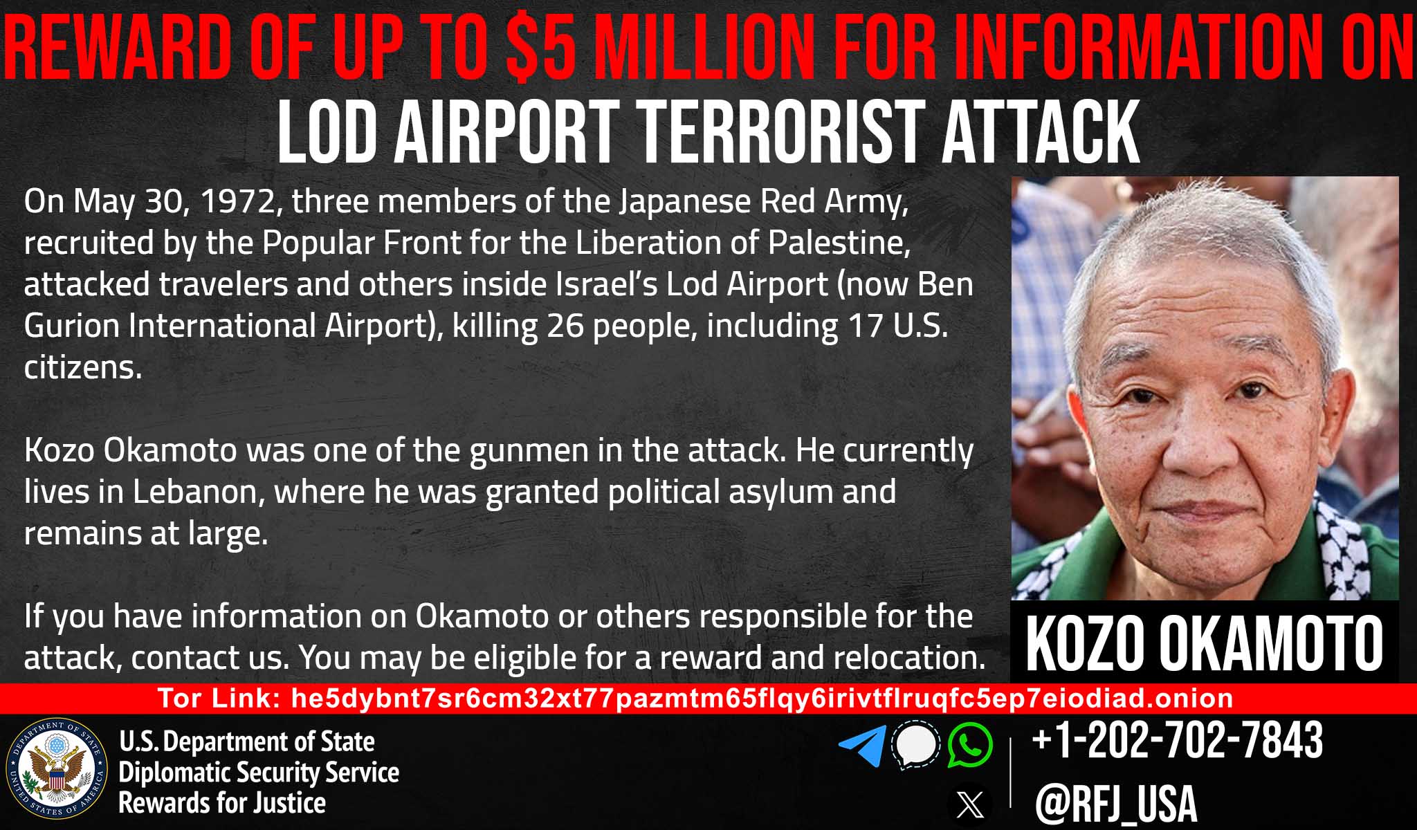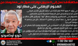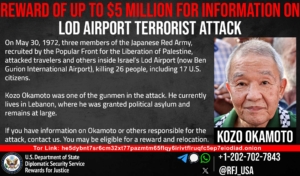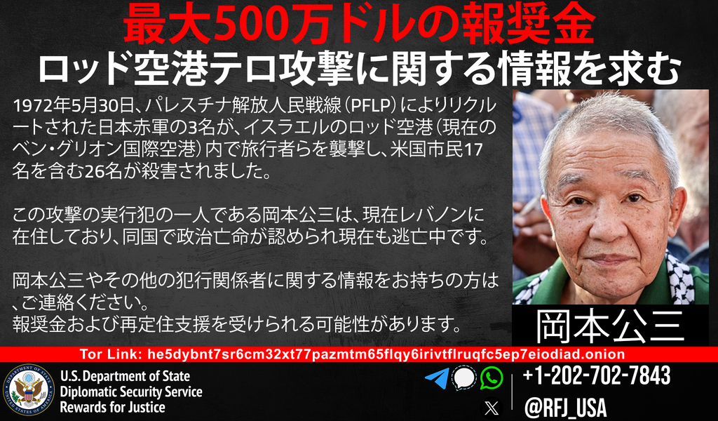正義への報酬プログラムは、1972年5月30日にイスラエルのロッド空港(現在のベン・グリオン国際空港)で発生したテロ攻撃に関与した者に関する情報に対し、最大500万ドルの報奨金を提供しています。