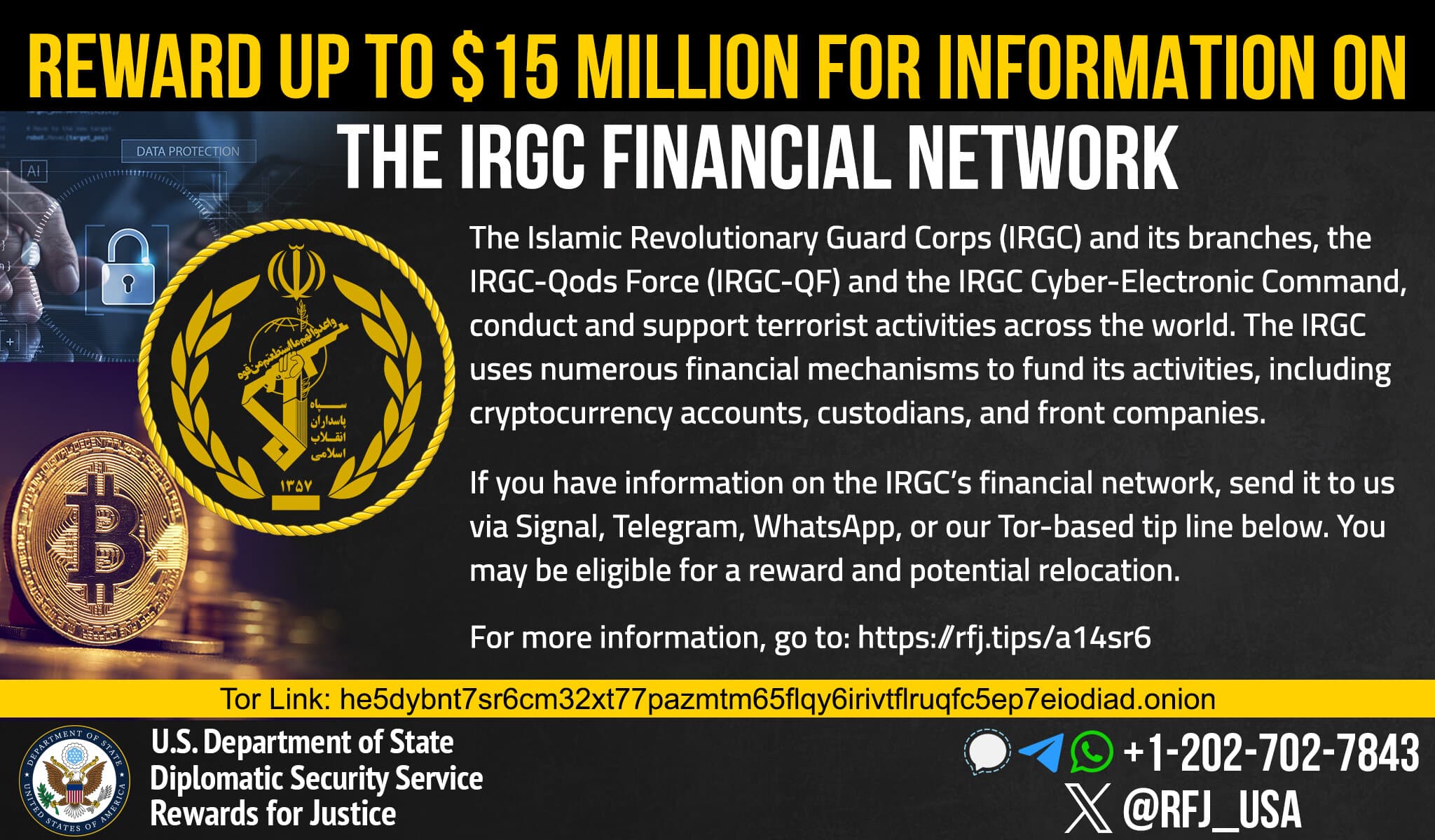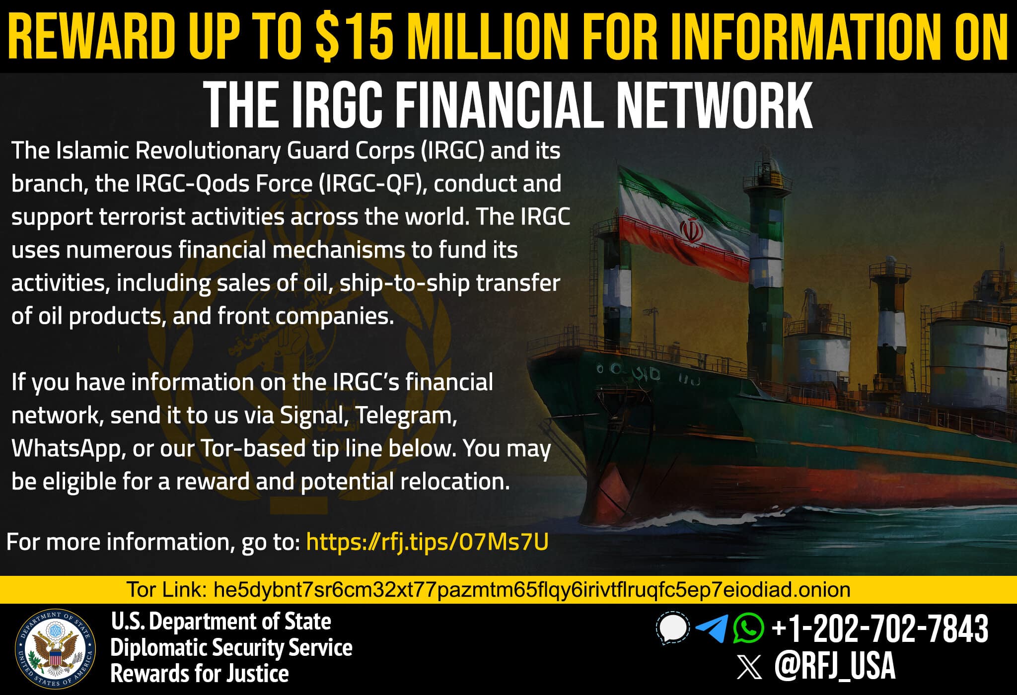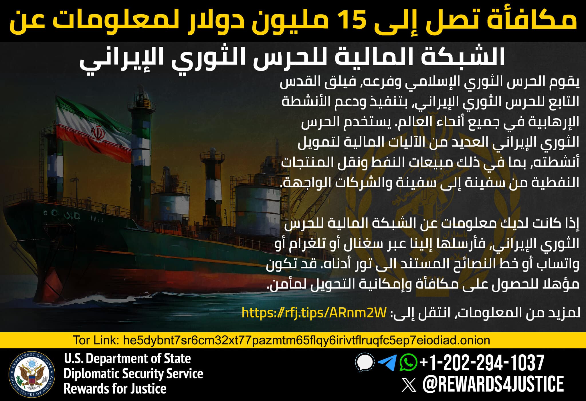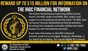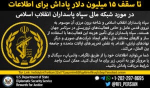 “خەڵات بۆ دادوەری” لەبری ئەو زانیاریانەی دەبنە هۆی تێکشکانی میکانیزمە داراییەکانی “سوپای پاسدارانی ئیسلامی ئێران”(IRGC) (هایپەرلینک) وهەموو لقە جۆربەجۆرەکانی، لەوانە هێزی قودسی سوپای پاسدارانی شۆڕشی ئیسلامی” (IRGC-QF)(هایپەرلینک)، تاکوو 15 ملیۆن دۆلار دەدات. IRGC لە چەندین هێرشی تیرۆریستی و چالاکی جیهانیدا دەستی هەبووە. IRGC-QF لە ڕێگەی نوێنەرەکانییەوە وەک حەماس و حزبوڵا و گرووپە میلیشیاکانی سەر بە ئێران لە عێراق سەرکردایەتی ئۆپەراسیۆنە تیرۆریستییەکانی ئێران لە دەرەوەی ئێران دەکات.