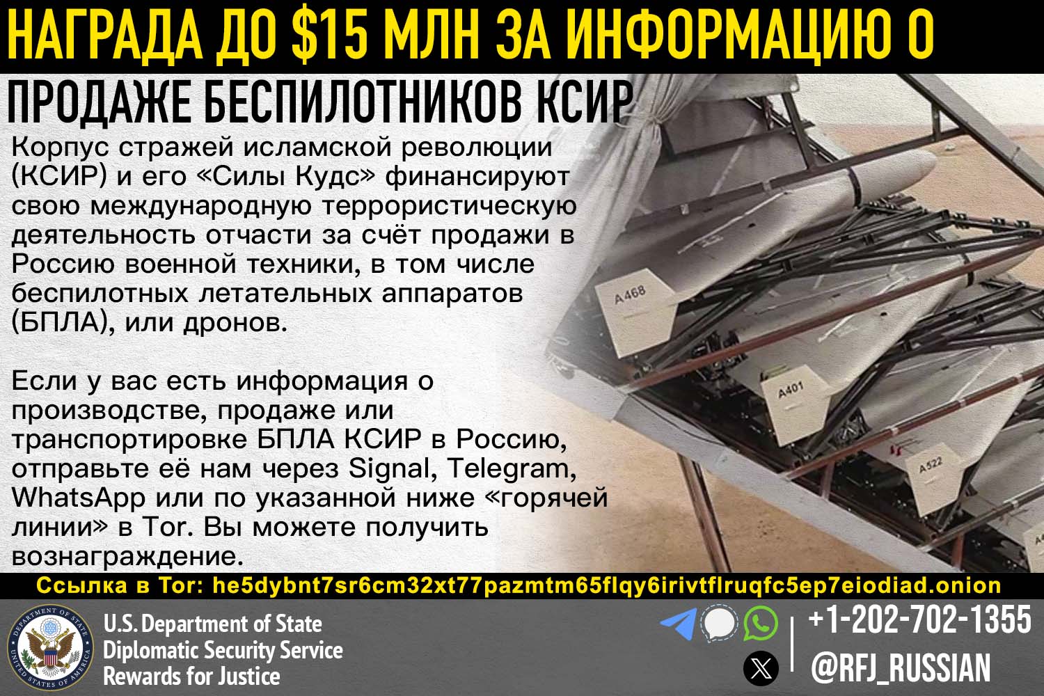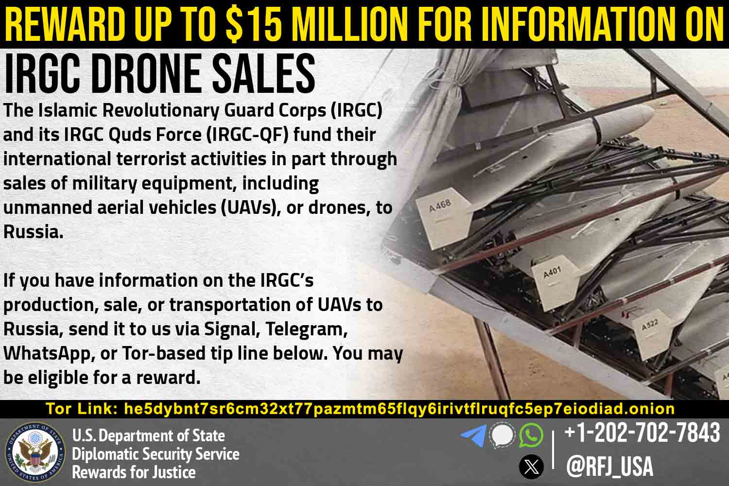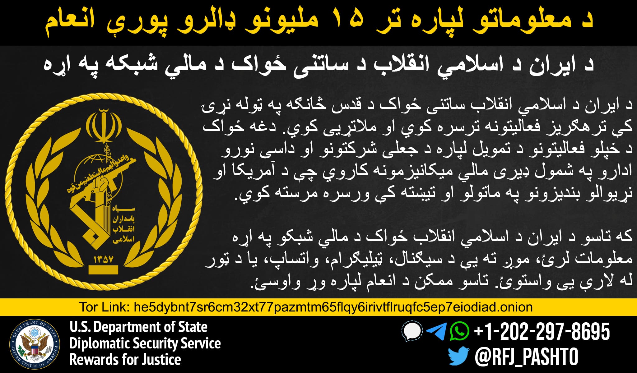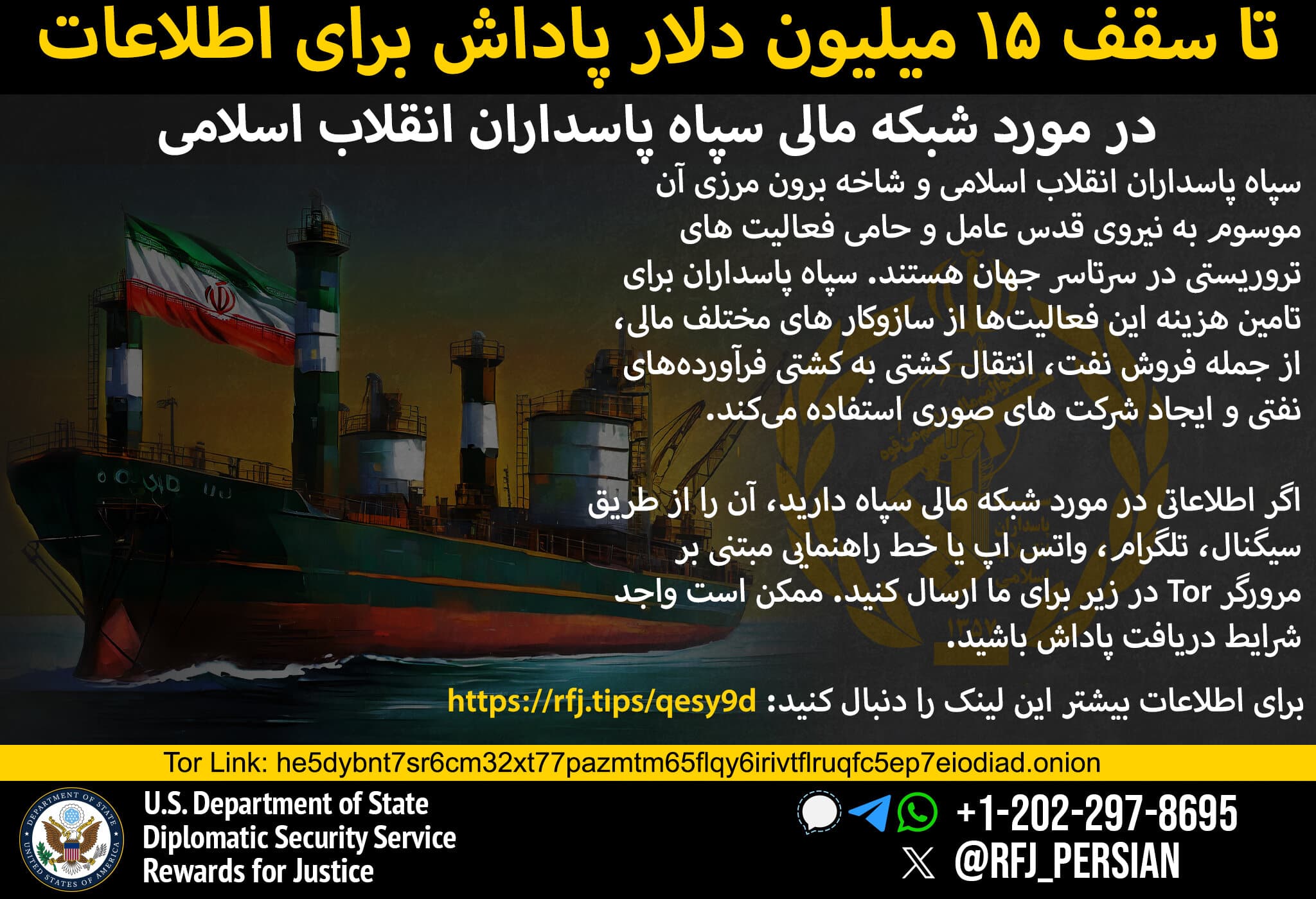 “خەڵات بۆ دادوەری” لەبری ئەو زانیاریانەی دەبنە هۆی تێکشکانی میکانیزمە داراییەکانی “سوپای پاسدارانی ئیسلامی ئێران”(IRGC) (هایپەرلینک) وهەموو لقە جۆربەجۆرەکانی، لەوانە هێزی قودسی سوپای پاسدارانی شۆڕشی ئیسلامی” (IRGC-QF)(هایپەرلینک)، تاکوو 15 ملیۆن دۆلار دەدات. IRGC لە چەندین هێرشی تیرۆریستی و چالاکی جیهانیدا دەستی هەبووە. IRGC-QF لە ڕێگەی نوێنەرەکانییەوە وەک حەماس و حزبوڵا و گرووپە میلیشیاکانی سەر بە ئێران لە عێراق سەرکردایەتی ئۆپەراسیۆنە تیرۆریستییەکانی ئێران لە دەرەوەی ئێران دەکات.