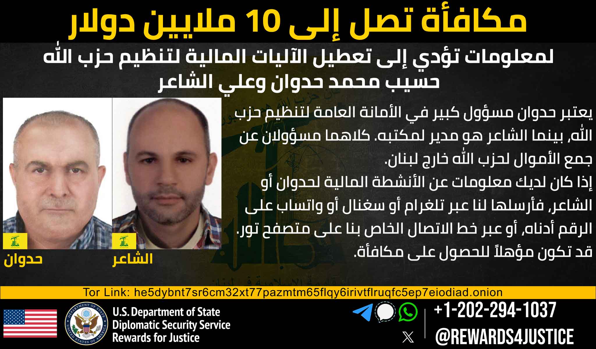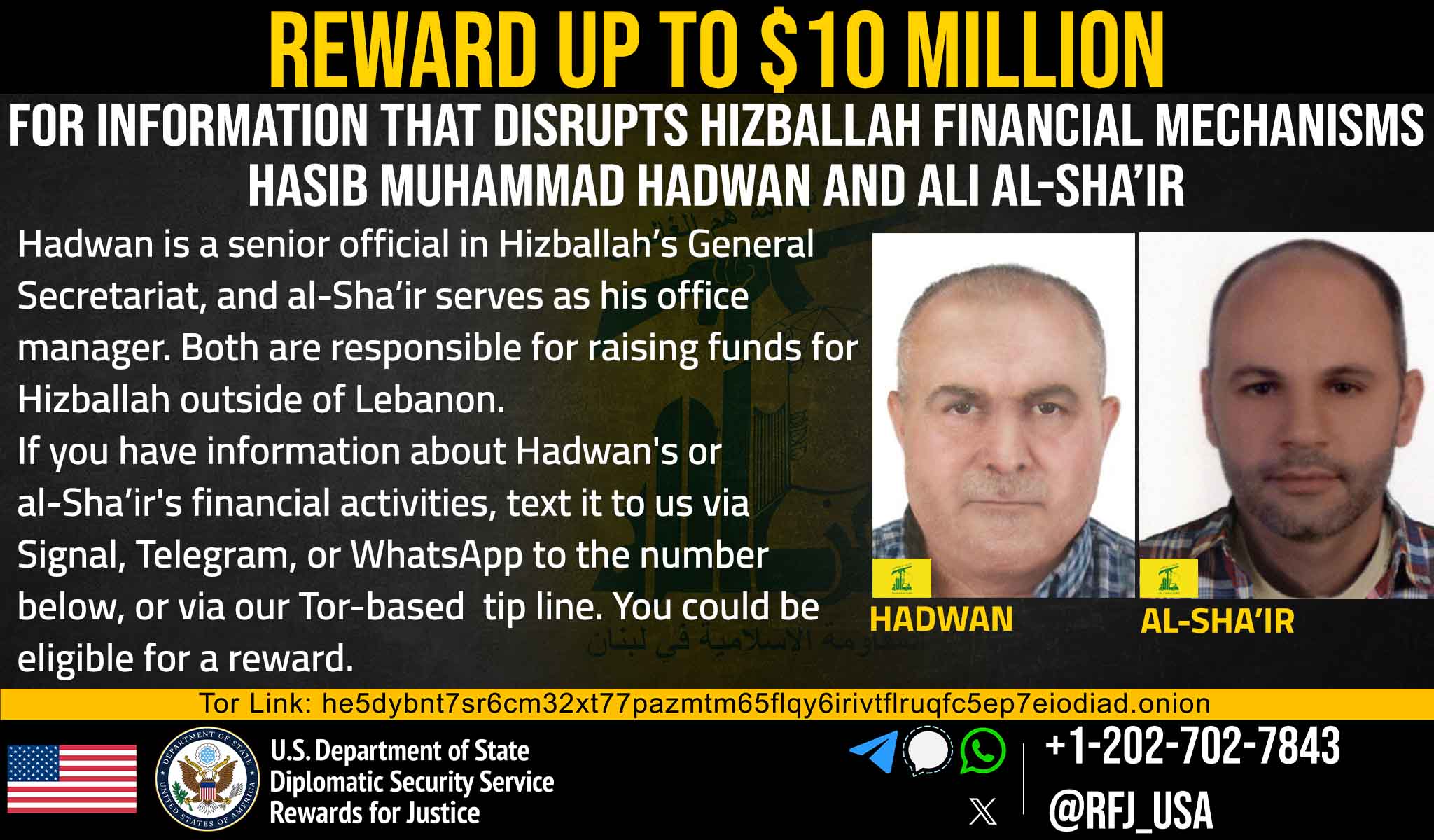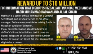 Rewards for Justice is offering a reward of up to $10 million for information that leads to the disruption of the financial mechanisms of Hizballah. Ali al-Sha’ir serves as office manager to Hizballah financier Hasib Muhammad Hadwan and has been accepting financial contributions on behalf of Hizballah since 2000. As part of their functions and responsibilities in Hizballah, al-Sha’ir and Hadwan use the international financial system to transfer money to Lebanon, while concealing the real purpose behind the fundraising, which is financing the terror organization’s activity.