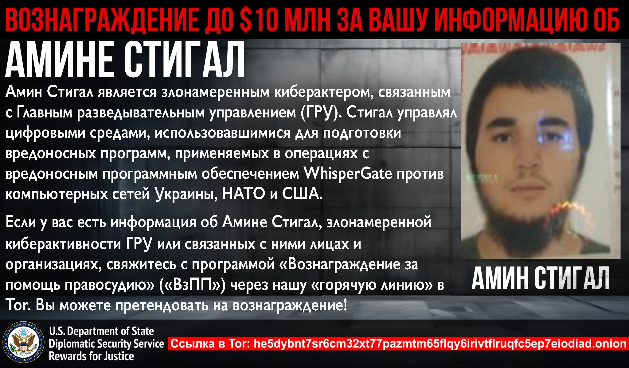 Anyone with information on Amin Stigal’s and the GRU’s malicious cyber activity, or associated individuals and entities should contact Rewards for Justice via the Tor-based tips-reporting channel at: he5dybnt7sr6cm32xt77pazmtm65flqy6irivtflruqfc5ep7eiodiad.onion(Tor browser required).