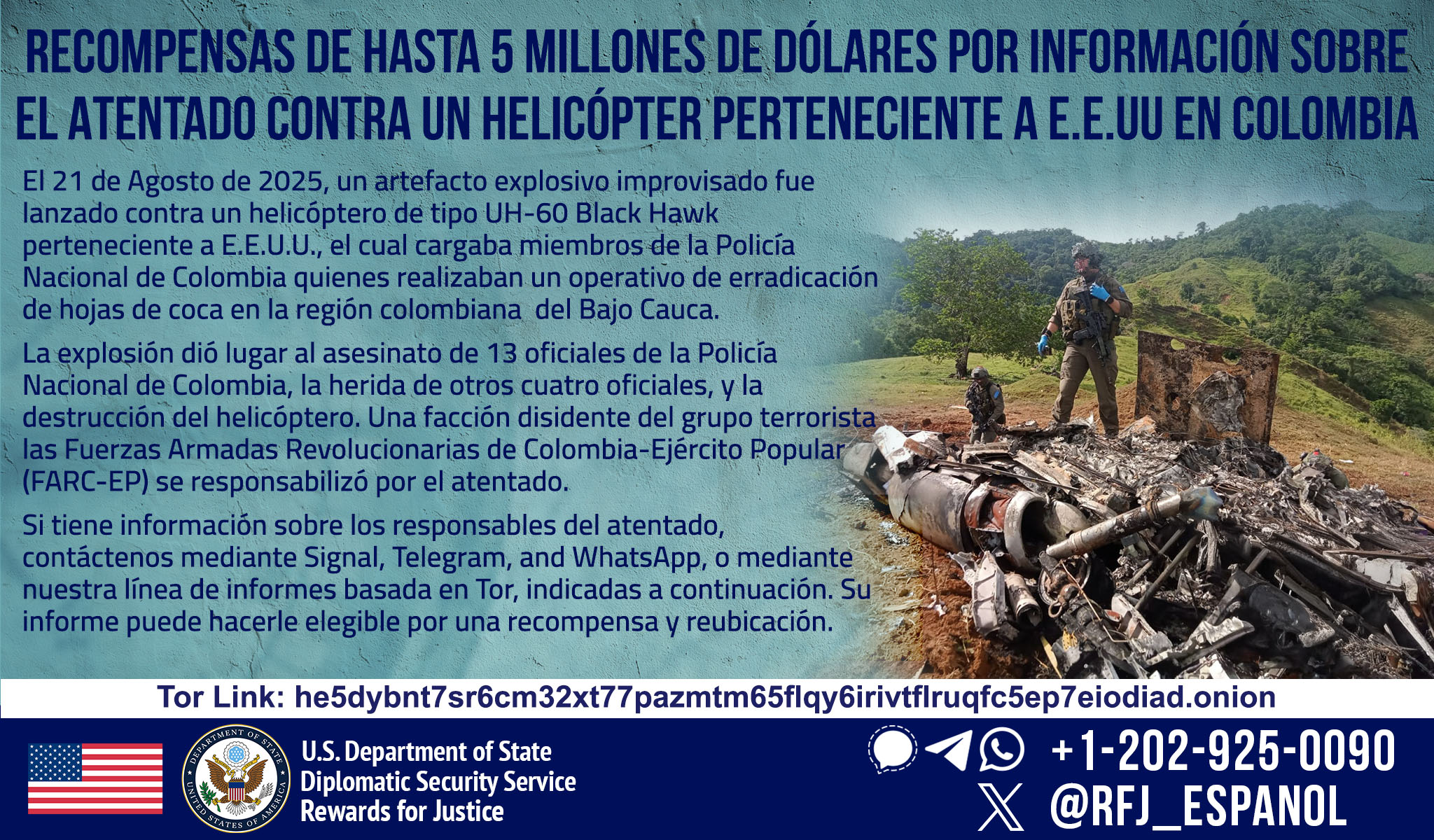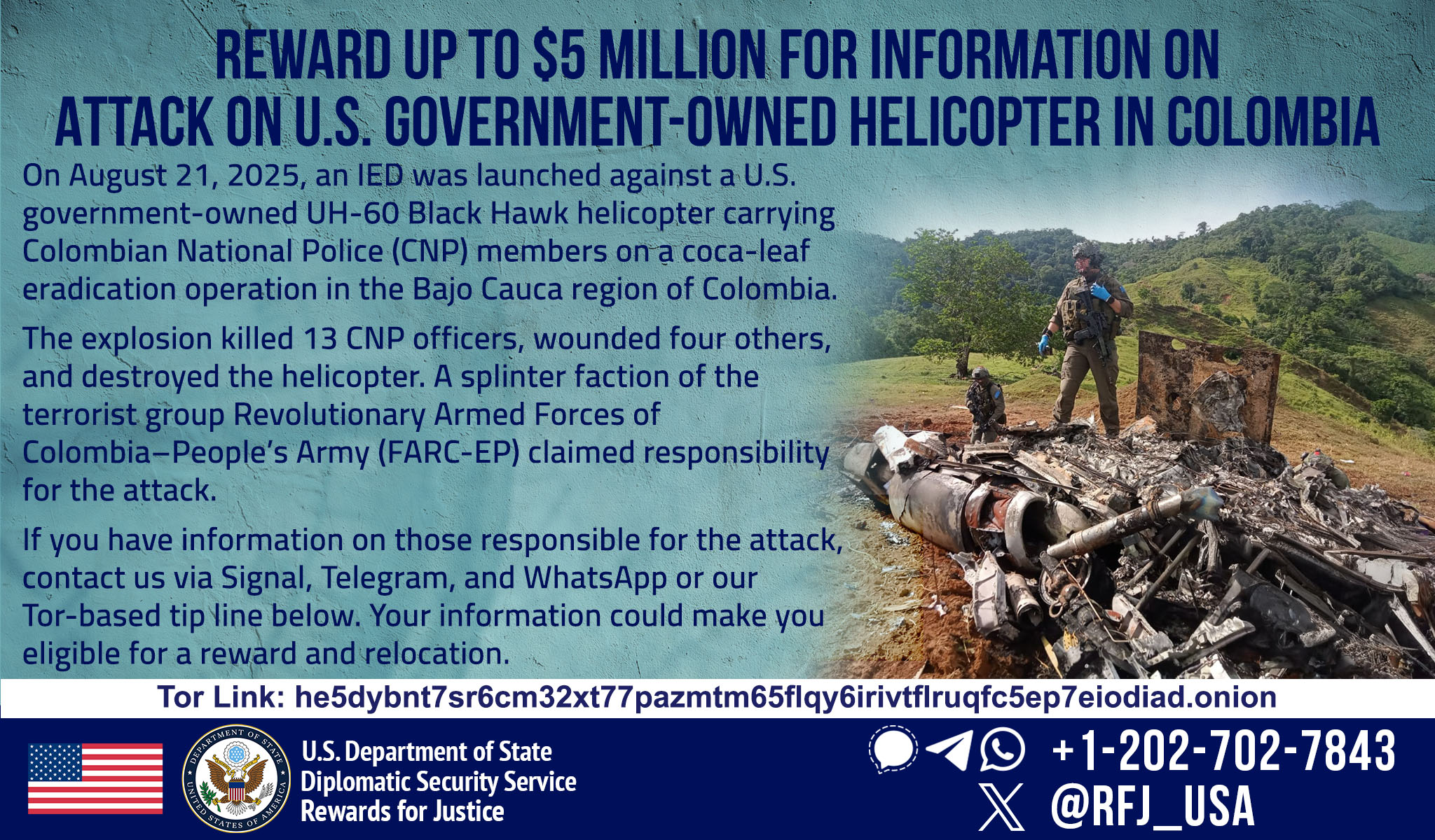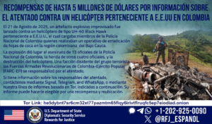 Rewards for Justice is offering a reward of up to $5 million for information on those responsible for an August 21, 2025 terrorist attack in Colombia’s northwest department of Antioquia that killed 13 Colombian National Police (CNP) members , wounded four CNP officers and destroyed a U.S. government-owned helicopter.