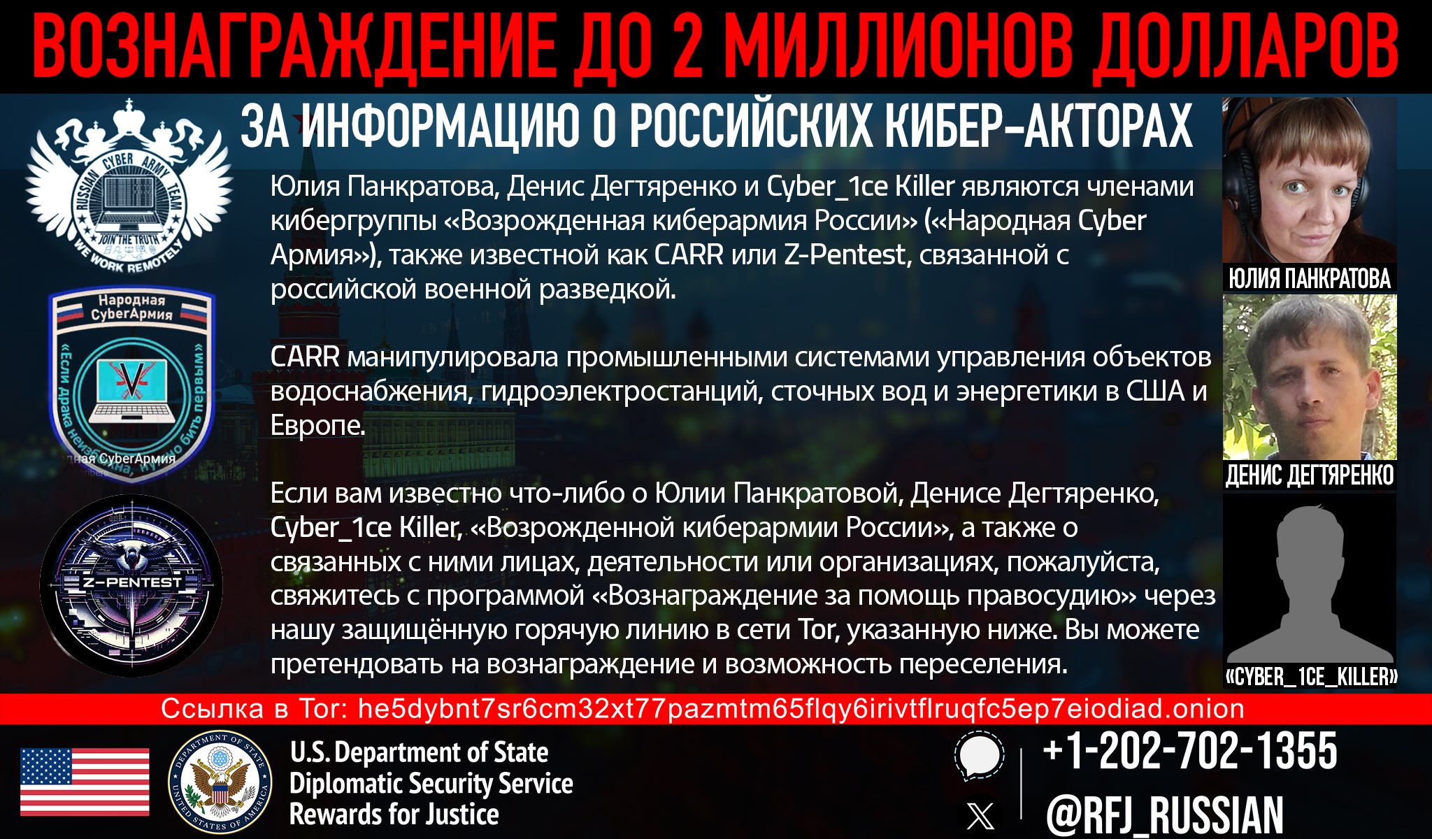 Anyone with information on Yuliya Pankratova, Denis Degtyarenko, Cyber Army of Russia Reborn, or associated individuals, activities, or entities, should contact Rewards for Justice via the Tor-based tips-reporting channel at:
