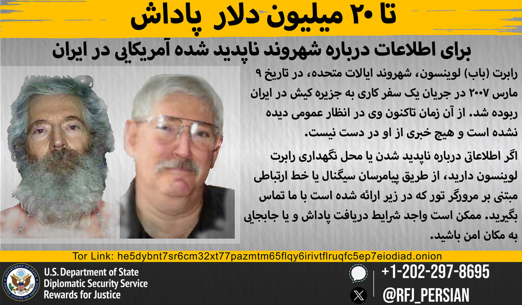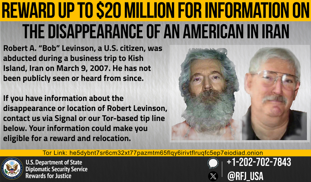 Anyone with information on Mohammad Baseri, Ahmad Khazai, Iran’s MOIS, or any other individuals or entities involved in Mr. Levinson’s disappearance should contact Rewards for Justice via the Tor-based tips-reporting channel at: he5dybnt7sr6cm32xt77pazmtm65flqy6irivtflruqfc5ep7eiodiad.onion (Tor browser required).