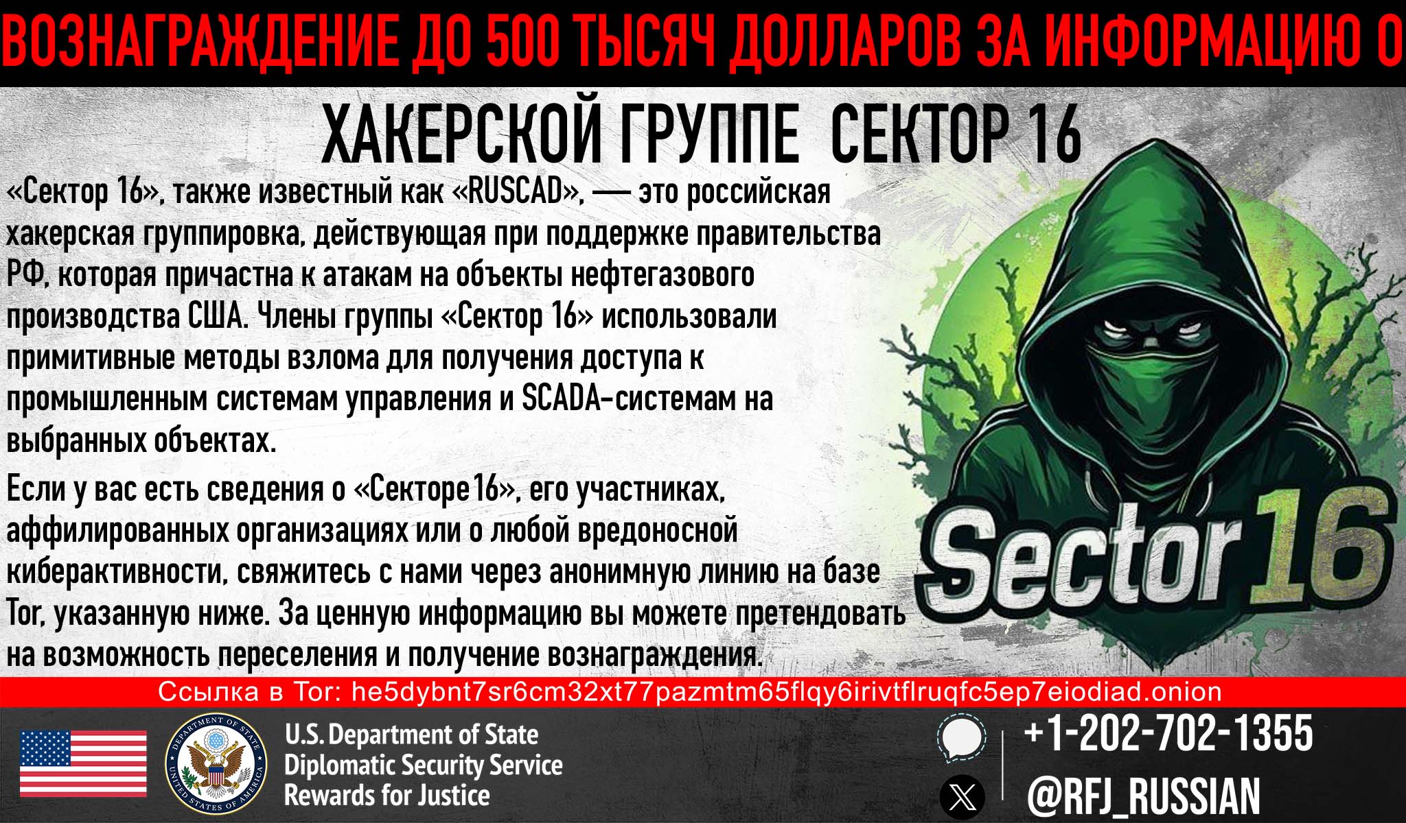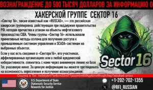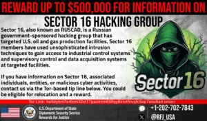 В рамках этого предложения RFJ предлагает до 500,000 долларов за информацию о лицах, связанных с Сектором 16 — российской хакерской группой, действующей при поддержке правительства, которая атаковала объекты нефтегазодобывающей промышленности США. Участники группы «Сектор 16» использовали примитивные методы взлома, чтобы получить доступ к промышленным системам управления и SCADA—системам на выбранных объектах.