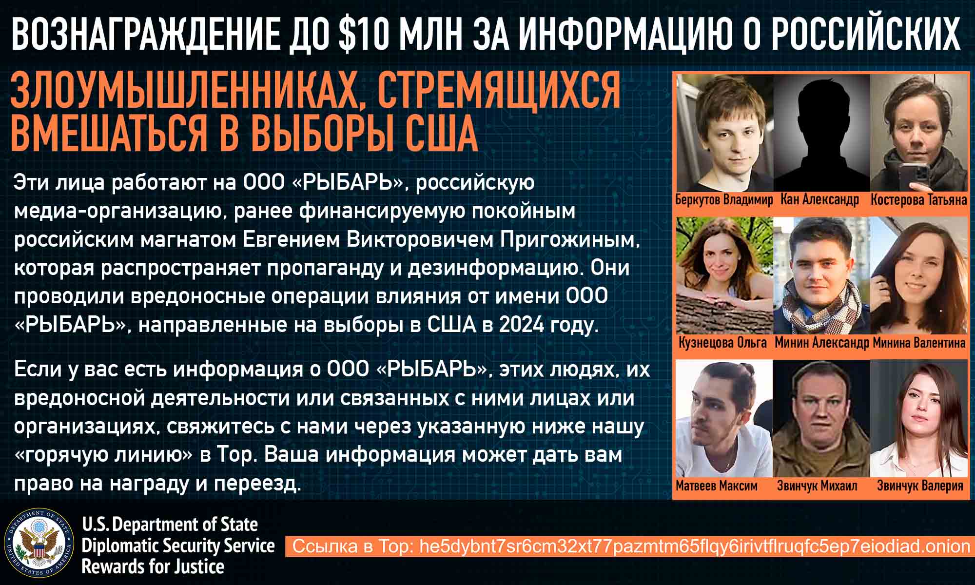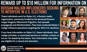 «Вознаграждение за помощь правосудию» предлагает вознаграждение в размере до 10 миллионов долларов за информацию, позволяющую установить личность или местонахождение любого иностранного лица, включая иностранную организацию, которое сознательно занималось или занимается вмешательством в выборы США, а также за информацию, позволяющую предотвратить, сорвать или благоприятно разрешить акт иностранного вмешательства в выборы.