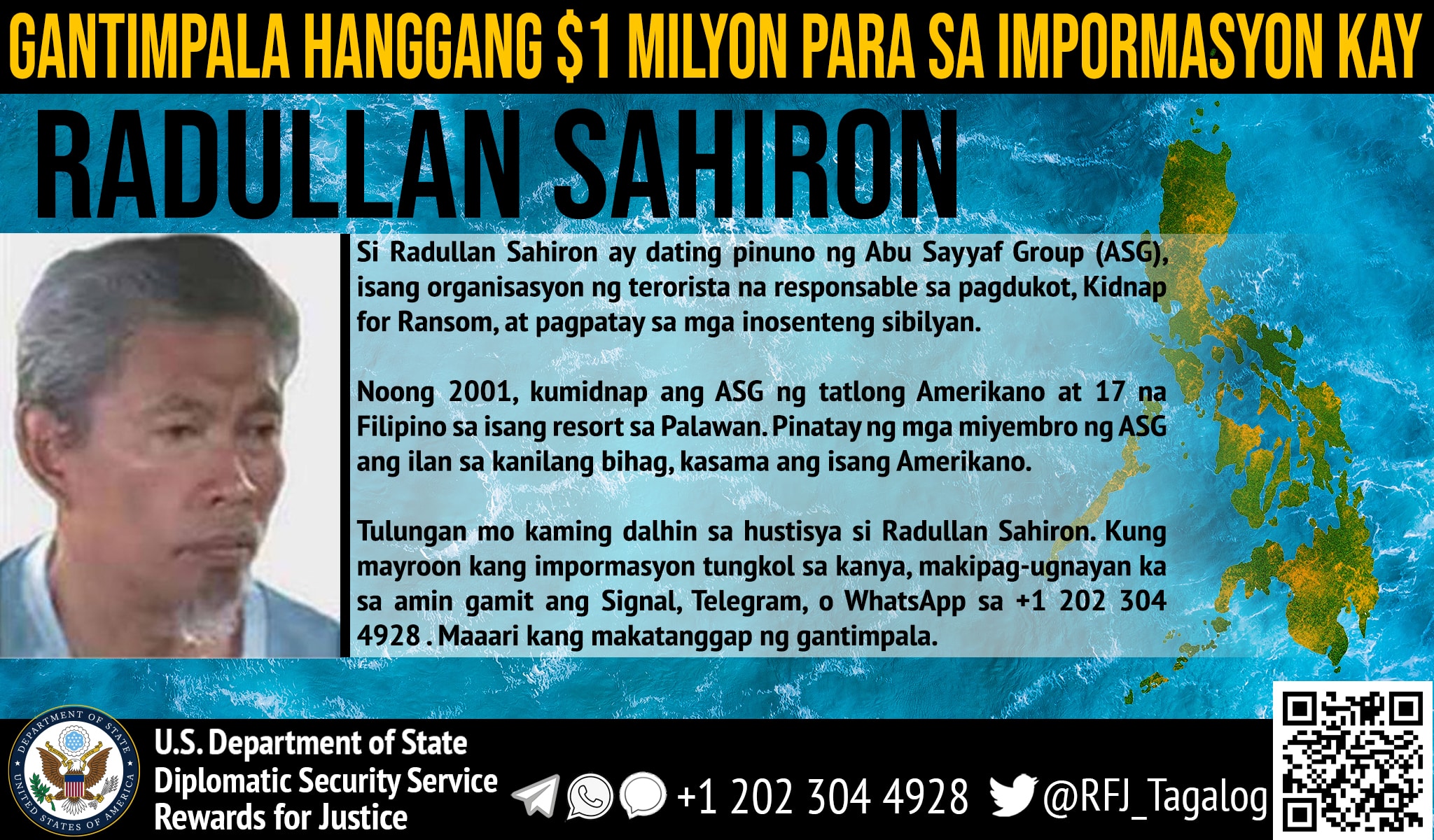ريوارڊز فار جسٽس رادلان ساحرون جنهن کي ڪمانڊر پيوٽول طور پڻ سڃاتو وڃي ٿو، بابت ڄاڻ جي فراهمي تي هڪ ملين ڊالرن تائين انعام جي آڇ ڪري ٿو. 2005ع کان ساحرون آمريڪا طرفان پرڏيهي دهشتگرد تنظيم (ايف ٽي او) طور قرار ڏنل فلپائين جي ابو سياف گروپ (اي ايس جي) جو مجموعي طور تي اڳواڻ آهي.