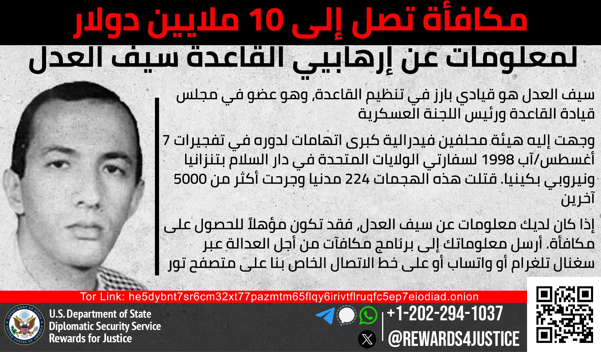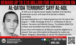 ريوارڊز فار جسٽس سيف العدل بابت معلومات جي فراهمي تي 10 ملين آمريڪي ڊالرن تائين انعام جي آڇ ڪري ٿو. العدل ايران ۾ موجود القاعده (اي ڪيو) جو سينيئر اڳواڻ ۽ القاعده جي سينيئر قيادت تي ٻڌل ڪائونسل مجلس شوريٰ جو ميمبر آهي. العدل اي ڪيو جي فوجي ڪميٽي جي سربراهي پڻ ڪري ٿو.
