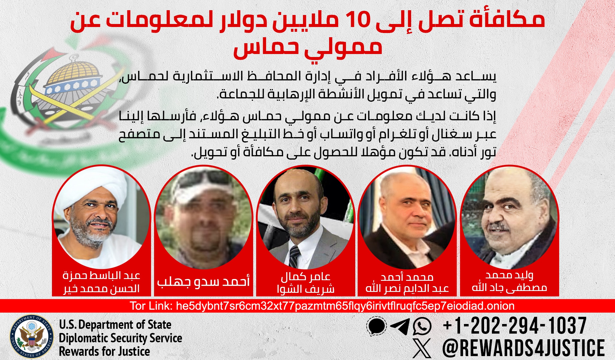 ريوارڊز فار جسٽس اهڙي معلومات جي فراهمي تي 10 ملين آمريڪي ڊالرن تائين انعام جي آڇ ڪري ٿو، جنهن سان دهشتگرد تنظيم حماس جنهن کي حرڪت ال مقواما اسلاميه طور پڻ سڃاتو وڃي ٿو، جي مالياتي نظام ۾ رنڊڪ يا خلل پوي.