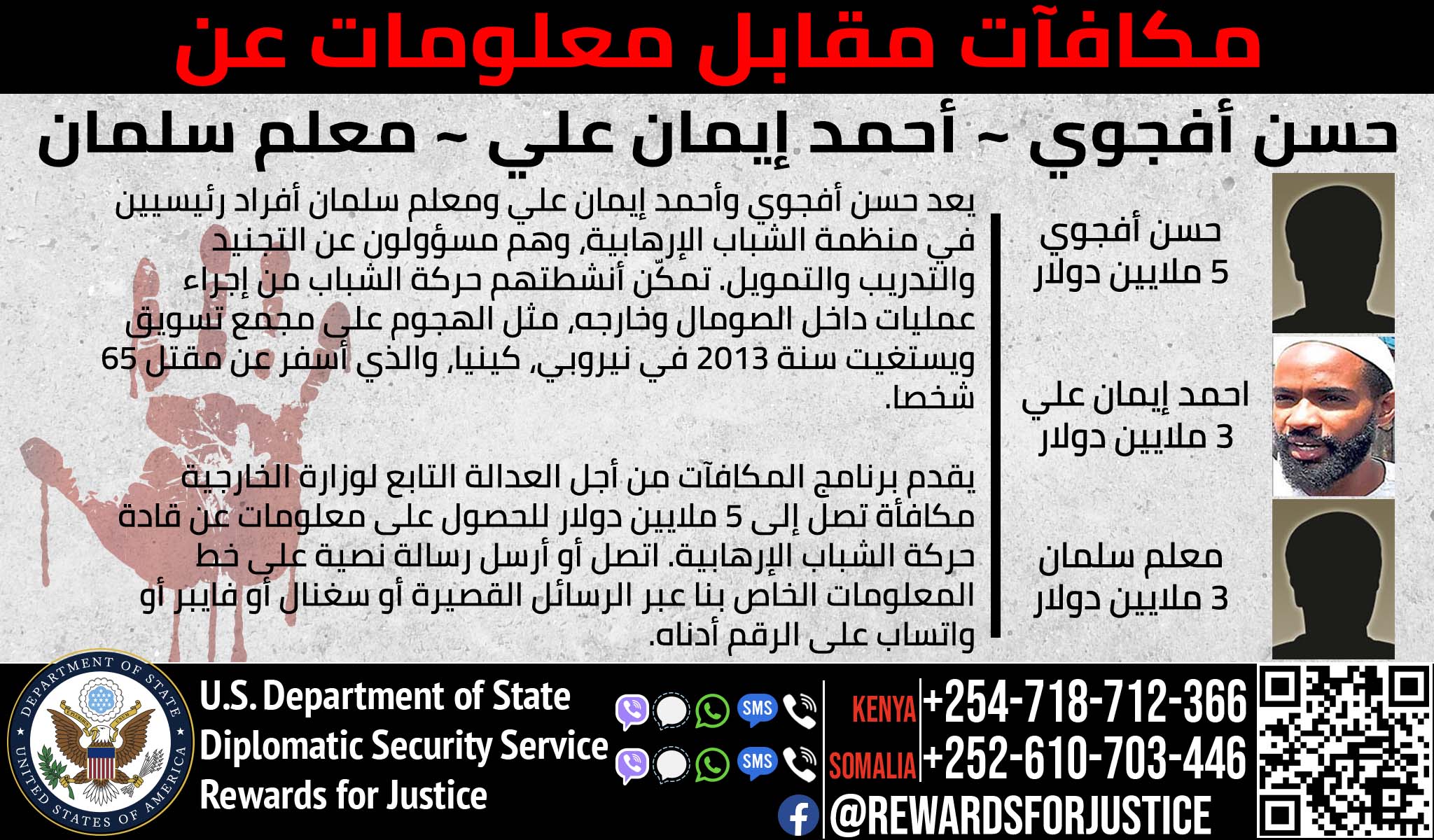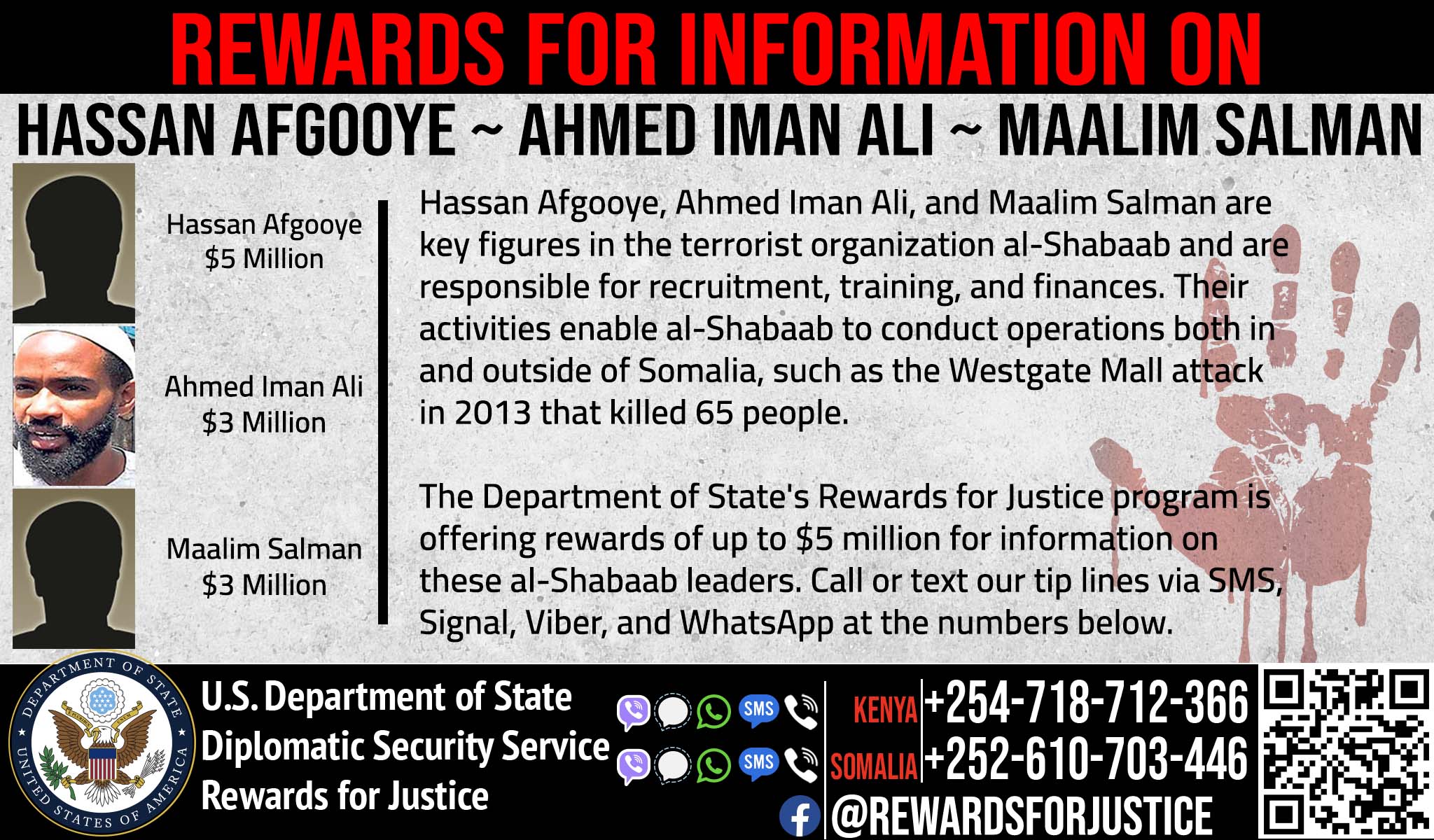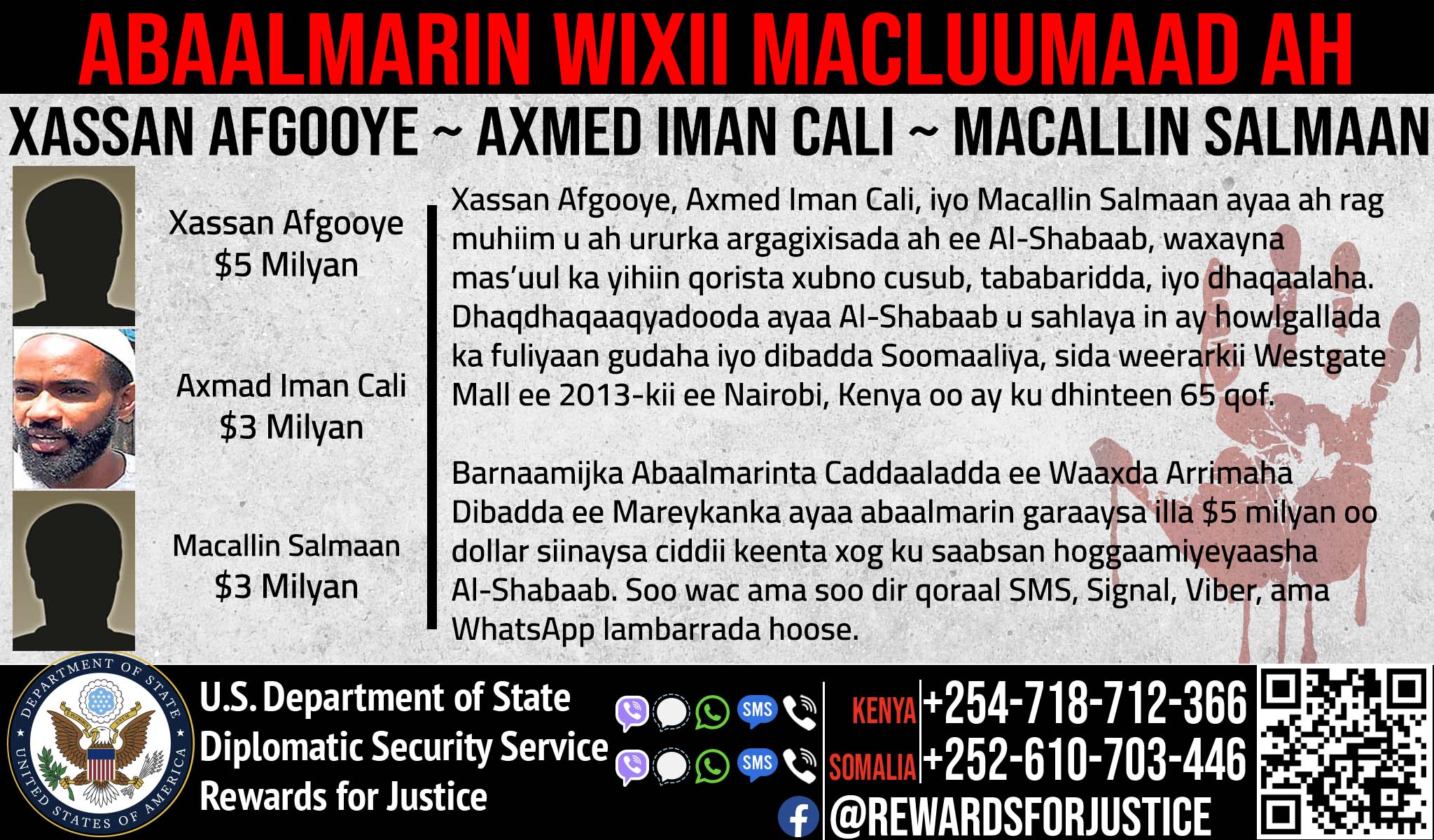 Barnaamijka Abaalmarinta Caddaalaadda ayaa waxay bixinayaan lacag gaaraysa illaa $3 milyan oo ay siinayo ciddii keenta xog ku saabsan Axmed Iman Cali. Cali waa taliye caan ah oo ka tirsan al-Shabaab, oo uu Maraykanku u aqoonsaday Urur Argaggixiso Shisheeye (FTO), kaas oo hogaamiyaha kooxda ka ahaa Kenya tan iyo sannadkii 2012. Wuxuu si toos ah uu u maamulaa howlgallada ka dhanka ah Kenya, ee lagu bartilmaameedsado ciidamada Kenya ee qeybta ka ah AMISOM ee ku sugan dalka Soomaaliya. Weerar noocaan oo kale ah oo bishii Janaayo 2016 ka ayaa wuxuu dhacay deegaanka Ceel-Cadde ee dalka Soomaaliya, halkaa waxaa lagu jabiyay gabi ahaan fariisin ay ku sugnaayeen ciidamada Kenya, waxaana lagu dilay in ka badan 140 askari oo ka tirsan ciidamada Kenya ee AMISOM.