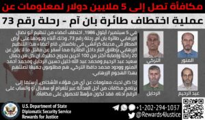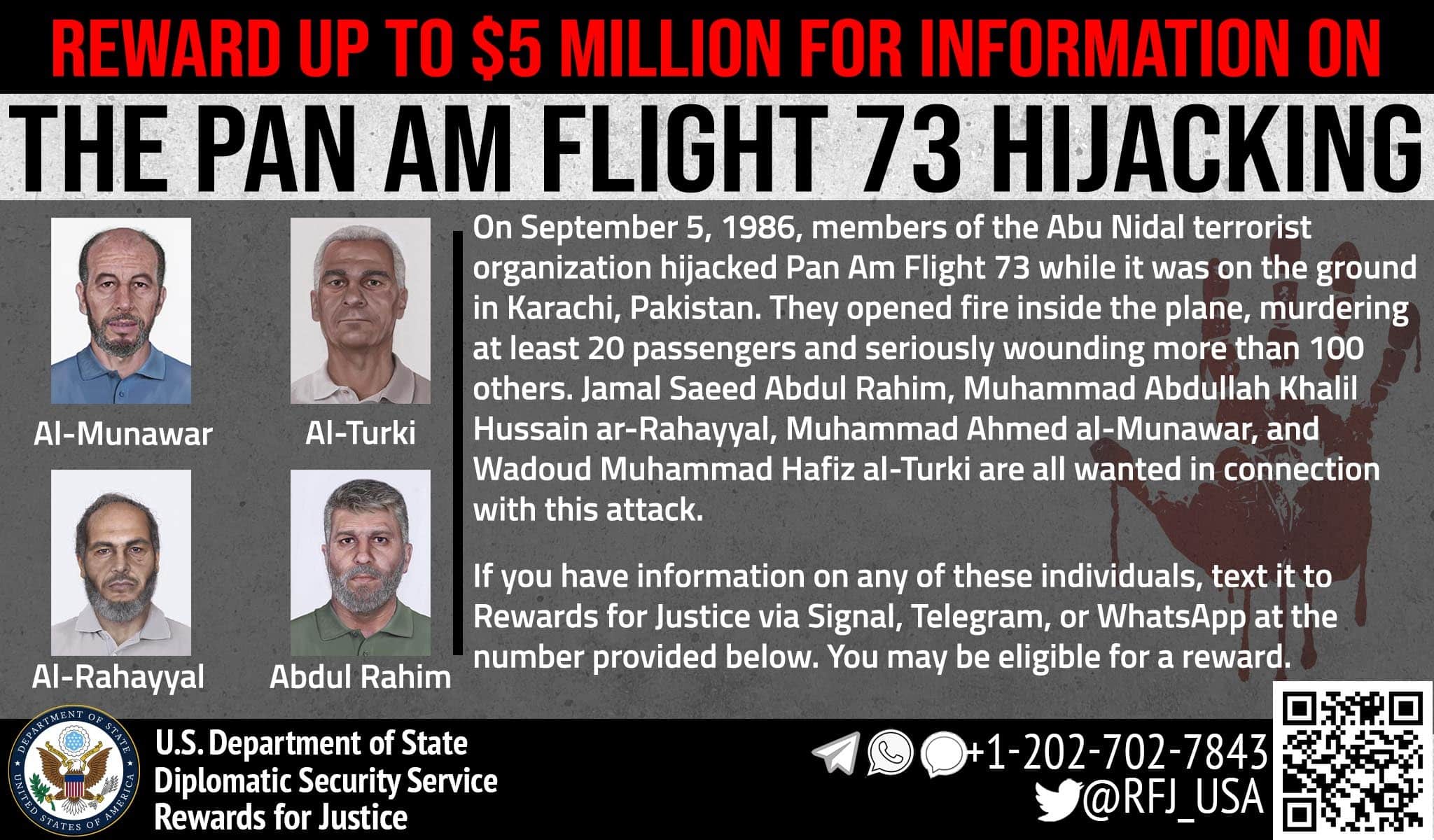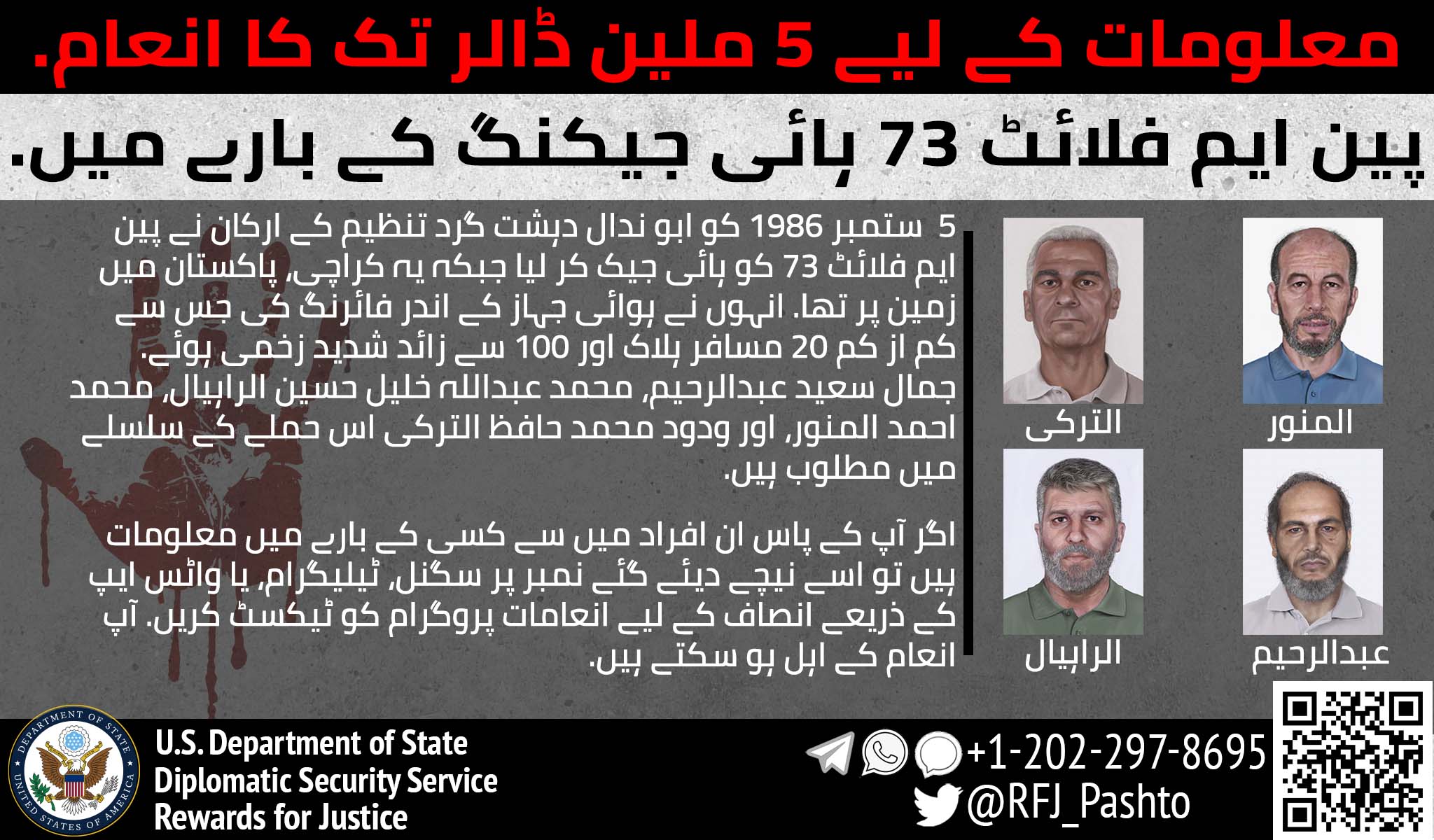 Tuzo ka Mahakama inaahidi kutoa tuzo ya hadi dola milioni tano kwa taarifa kuhusu utekaji nyara wa Ndege ya Pan Am 73. Mnamo tarehe 5 mwezi Septemba, mwaka 1986, watu walioshukiwa kuwa wanachama wa Shirika la kigaidi la Abu Nidal waliteka nyara Ndege ya Pan Am 73 ikiwa ardhini mjini Karachi, Pakistani, ikiwa na watu 379. Baada ya kuwashika mateka abiria na wahudumu kwa karibu saa 16, watekaji nyara hao walianza kufyatua risasi kiholela. Watu ishirini, wakiwamo Wamarekani wawili, waliuliwa na wengine zaidi ya 100 wakajeruhiwa.