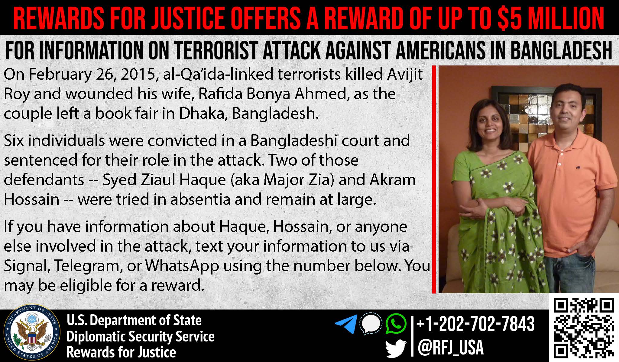 Rewards for Justice is offering a reward of up to $5 million for information on the killing of Avijit Roy and the concurrent attack on Rafida Bonya Ahmed in Dhaka, Bangladesh.