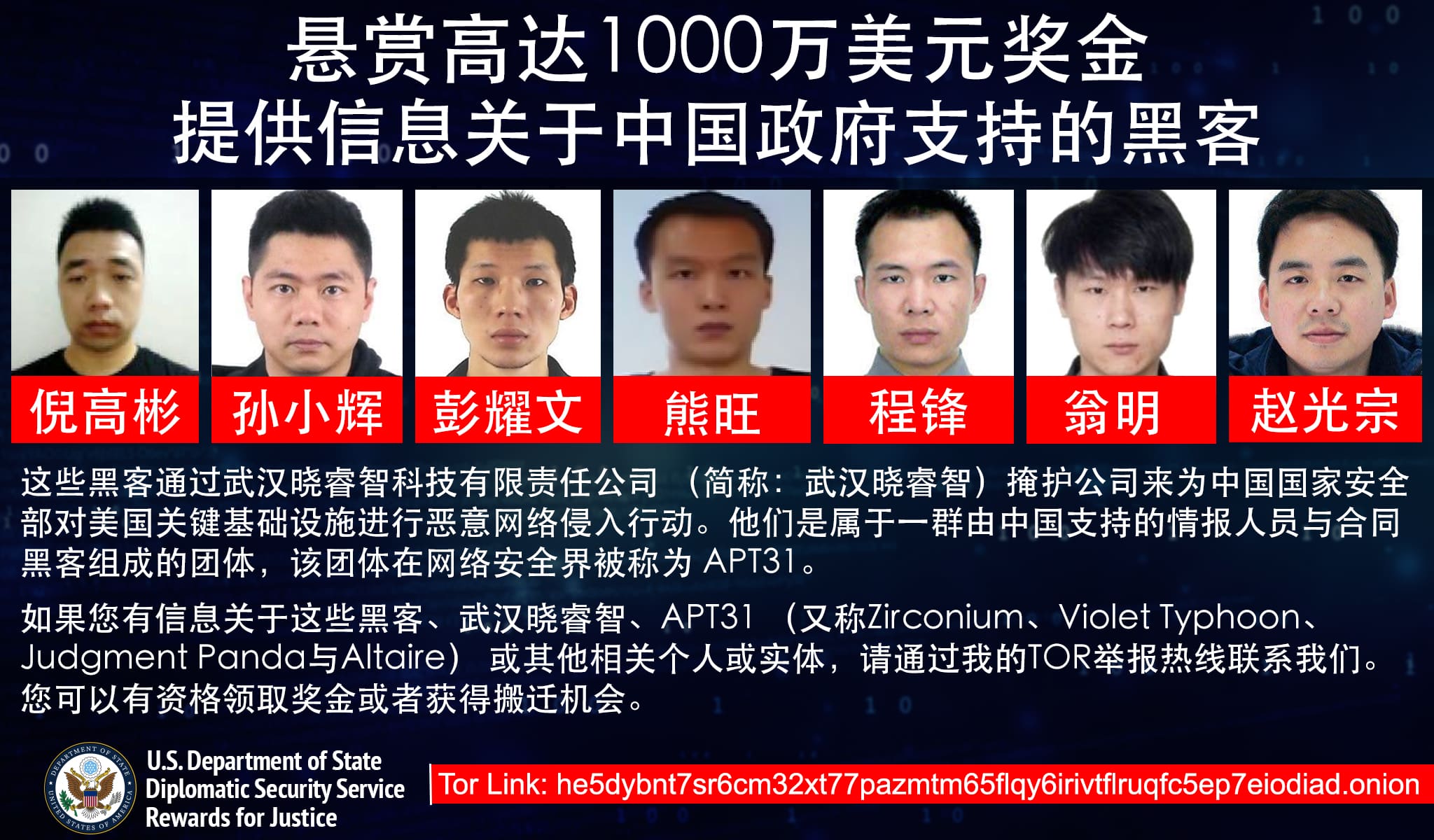 Anyone with information on APT31, Wuhan XRZ, Cheng Feng, Ni Gaobin, Peng Yaowen, Sun Xiaohui, Weng Ming, Xiong Wang, and Zhao Guangzong, or their malicious cyber activity should contact Rewards for Justice via the Tor-based tips-reporting channel at: he5dybnt7sr6cm32xt77pazmtm65flqy6irivtflruqfc5ep7eiodiad.onion (Tor browser required).