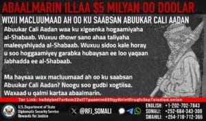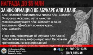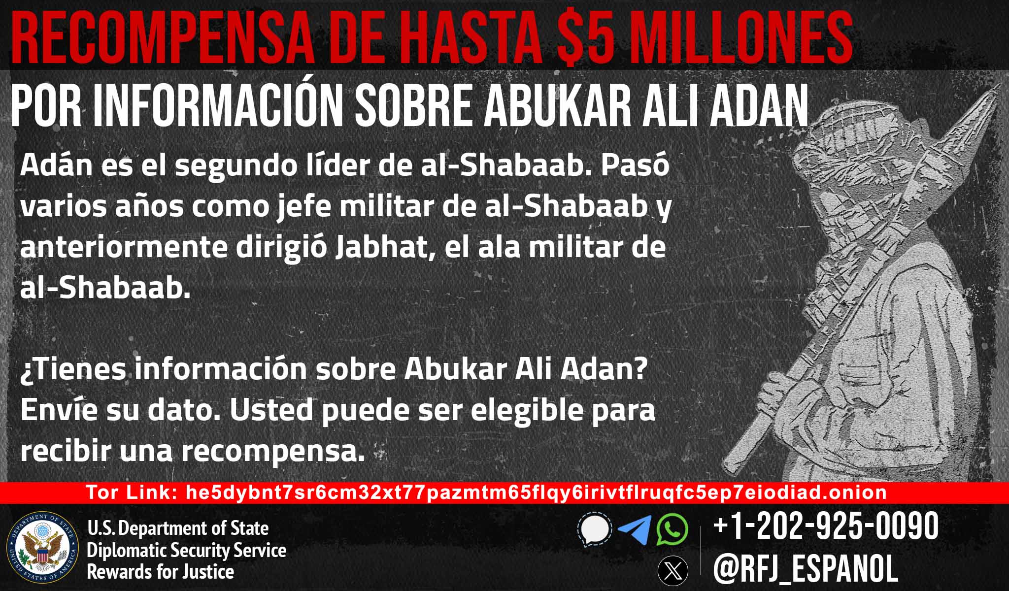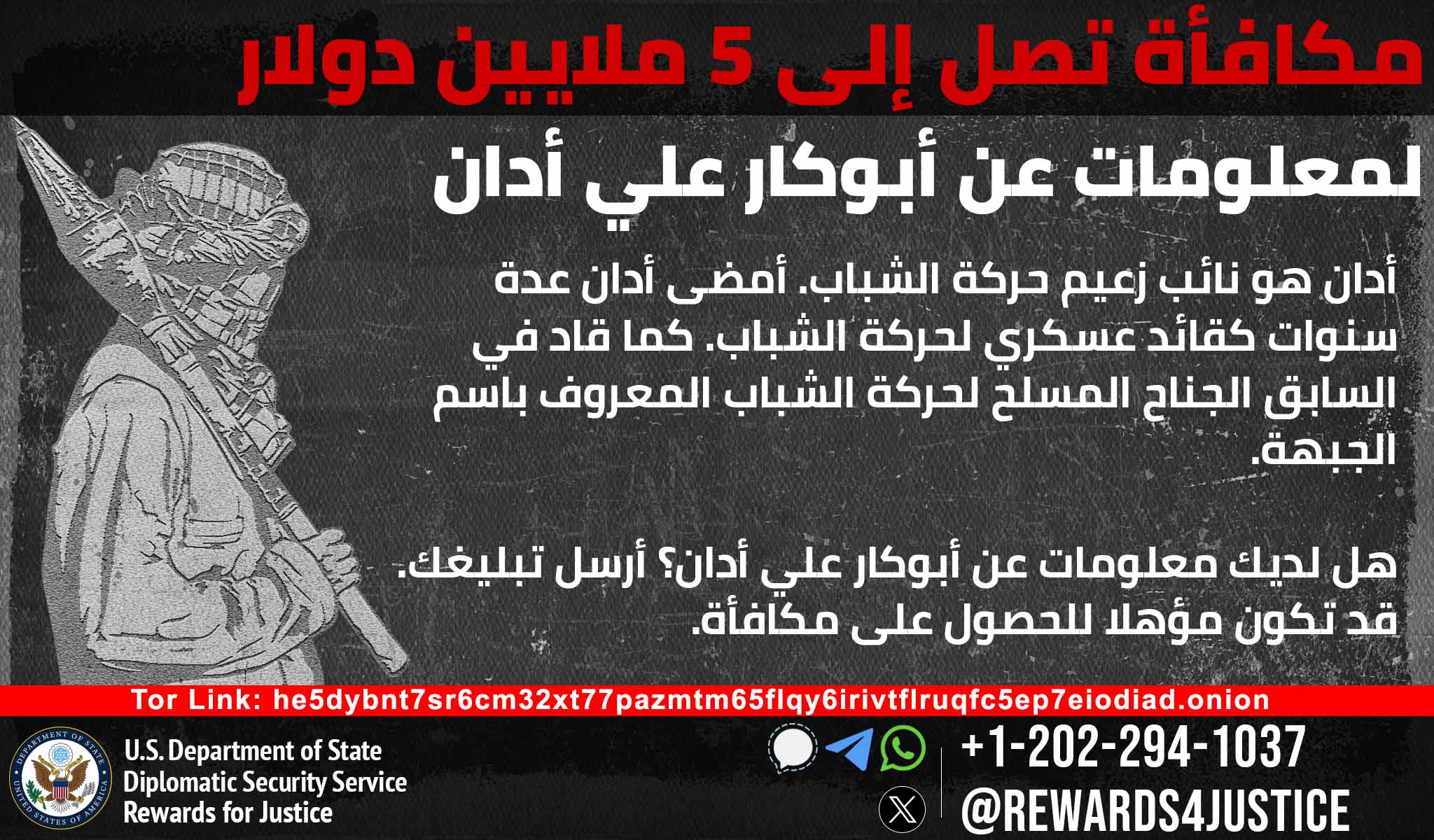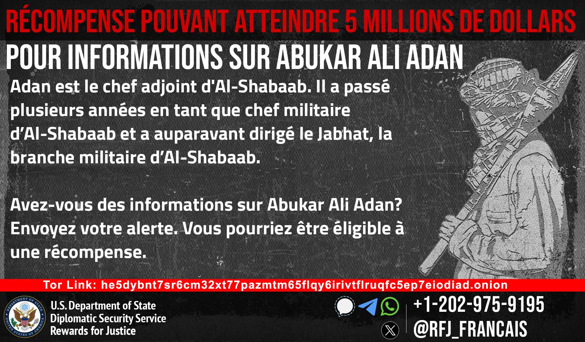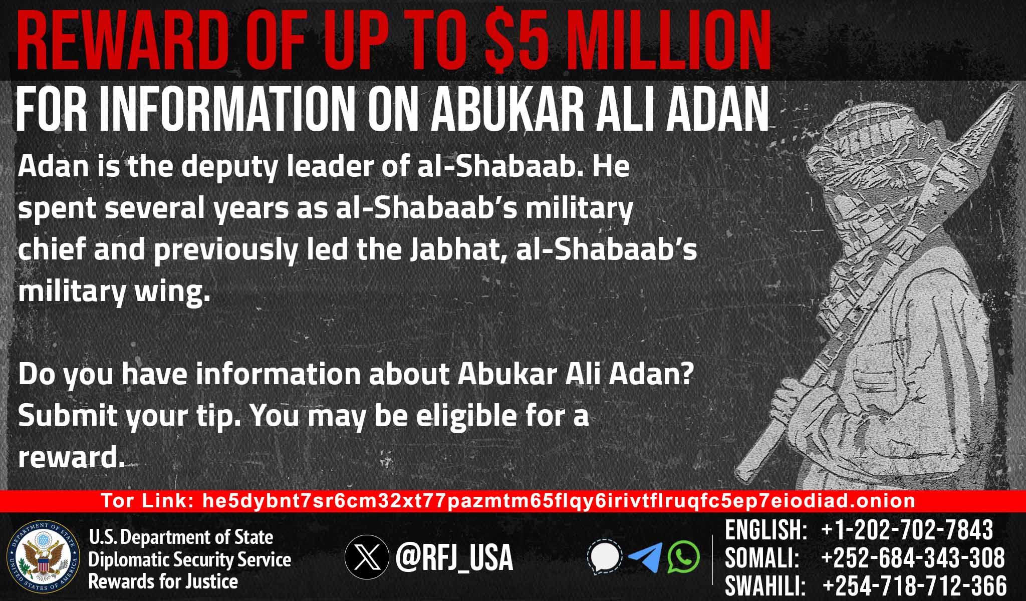 In January 2018, the Department of State designated Abukar Ali Adan as a Specially Designated Global Terrorist (SDGT) under Executive Order (E.O.) 13224 which imposes strict sanctions on foreign persons determined to have committed, or pose a significant risk of committing, acts of terrorism that threaten the security of U.S. nationals or the national security, foreign policy, or economy of the United States. He is also listed under UN sanctions pursuant to UN resolution 1844 (2008) for engaging in or providing support for acts that threaten the peace, security or stability of Somalia and peacekeepers. In addition, Adan is associated with al-Qaida affiliates, al-Qaida in the Arabian Peninsula and al-Qaida in the Islamic Maghreb.