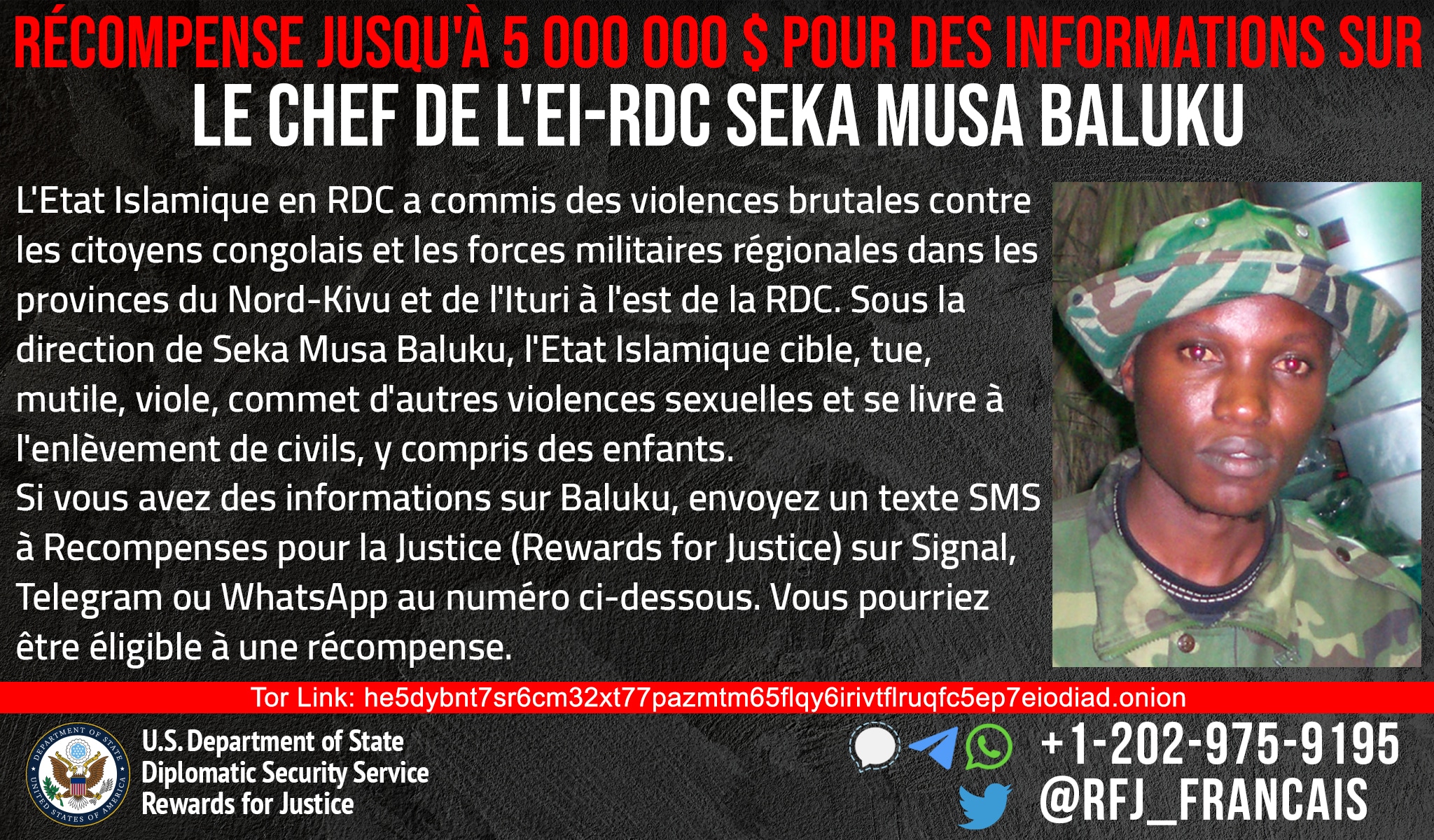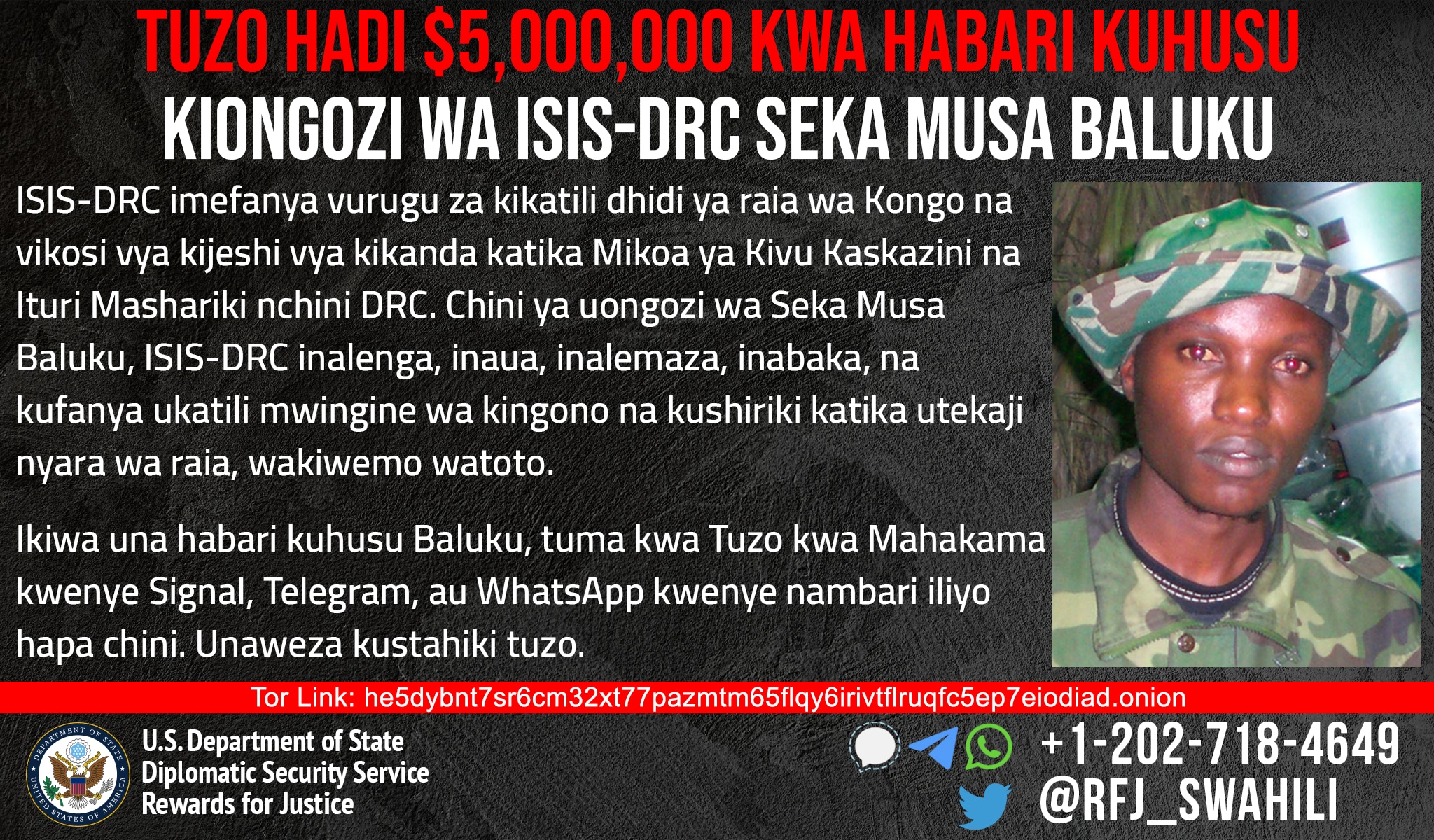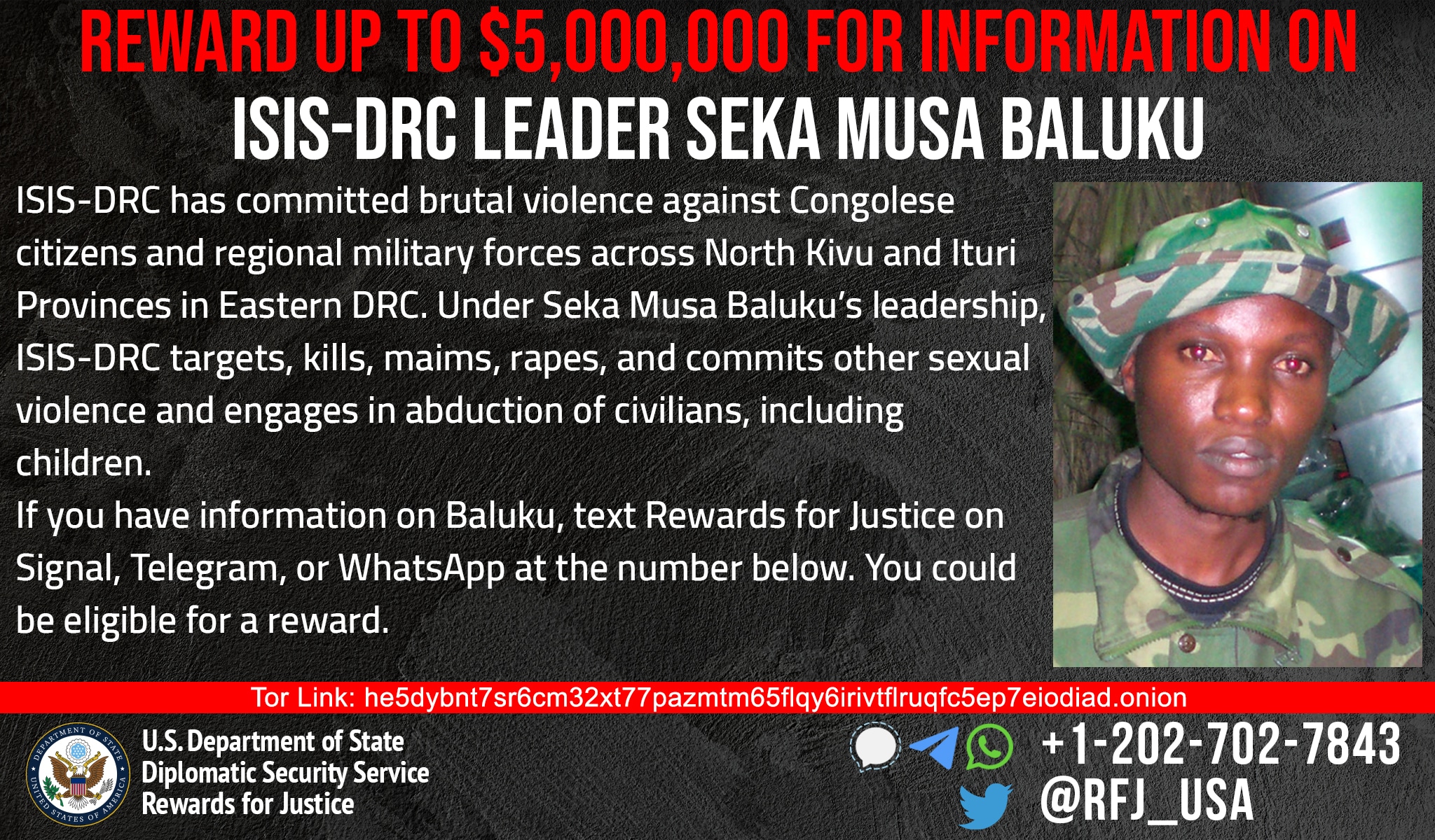 انعامات برائے انصاف آئی ایس آئی ایس-ڈی آر ایس کے رہنما سیکا موسیٰ بلوکو کے بارے میں معلومات کے لیے 5 ملین ڈالر تک کے انعام کی پیشکش کر رہا ہے۔
