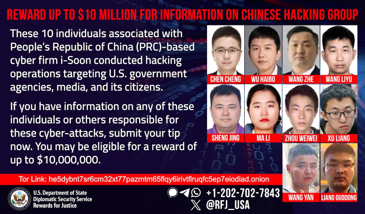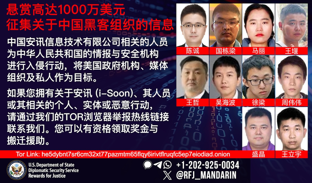 由外交安全局管理的美国国务院正义奖励计划 (Rewards for Justice, RFJ) 悬赏高达1000万美元奖金,征集关于任何人员或机构在外国政府控制下参与针对美国关键基础设施的恶意网络活动,违反计算机欺诈和滥用法案(Computer Fraud and Abuse Act,CFAA),的个人信息或下落的线索。
