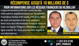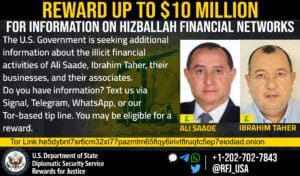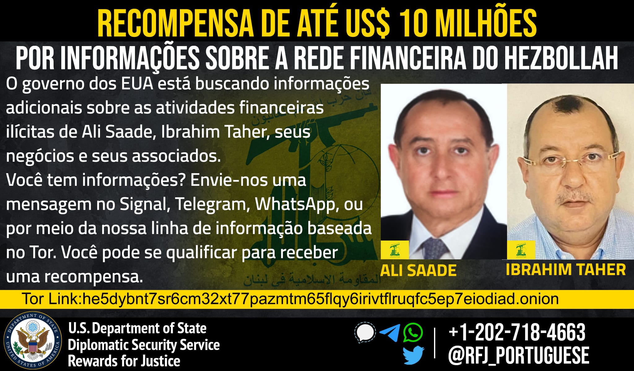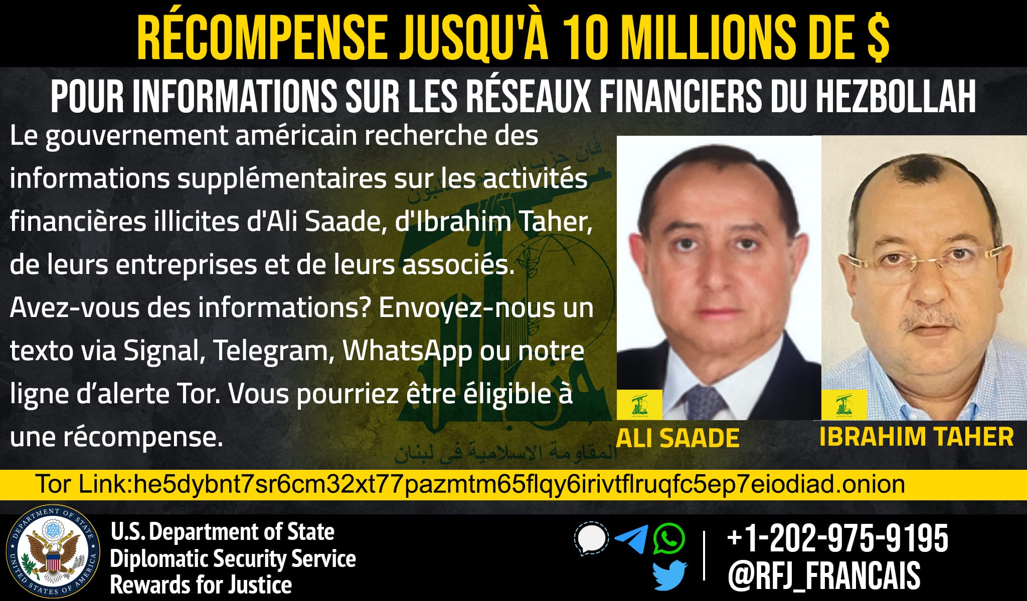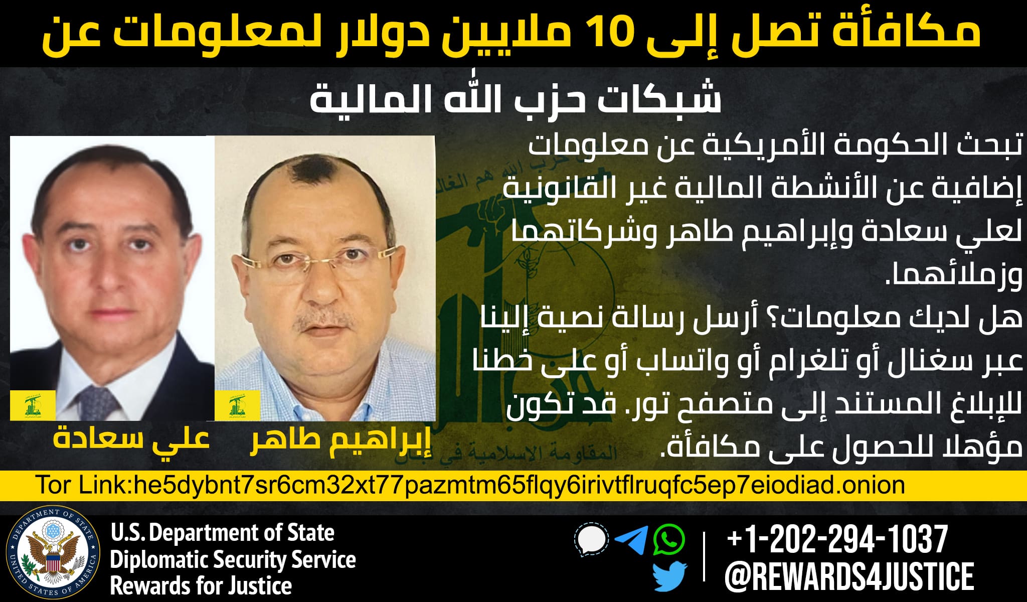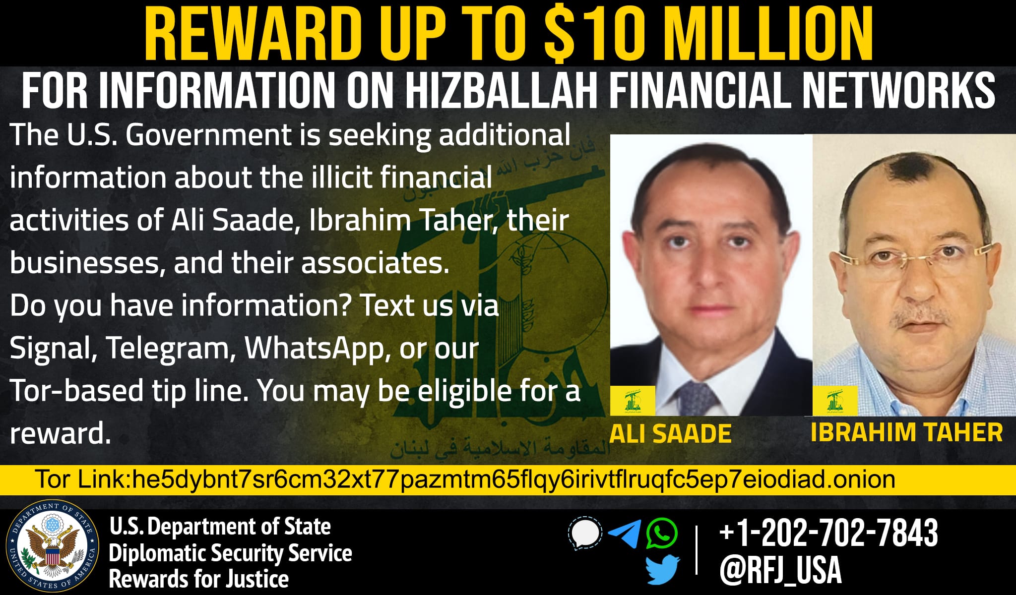 正义奖励计划(Rewards for Justice)为征集关于导致真主党经费机制扰乱的信息提供最高1000万。埃布拉黑姆·塔赫尔(Ibrahim Taher)是一名在几内亚经营的真主党理财家。塔赫尔被视为几内亚所在的真主党最突出的资金支持者之一。他被认为在几内亚聘用几名真主党所属的人。