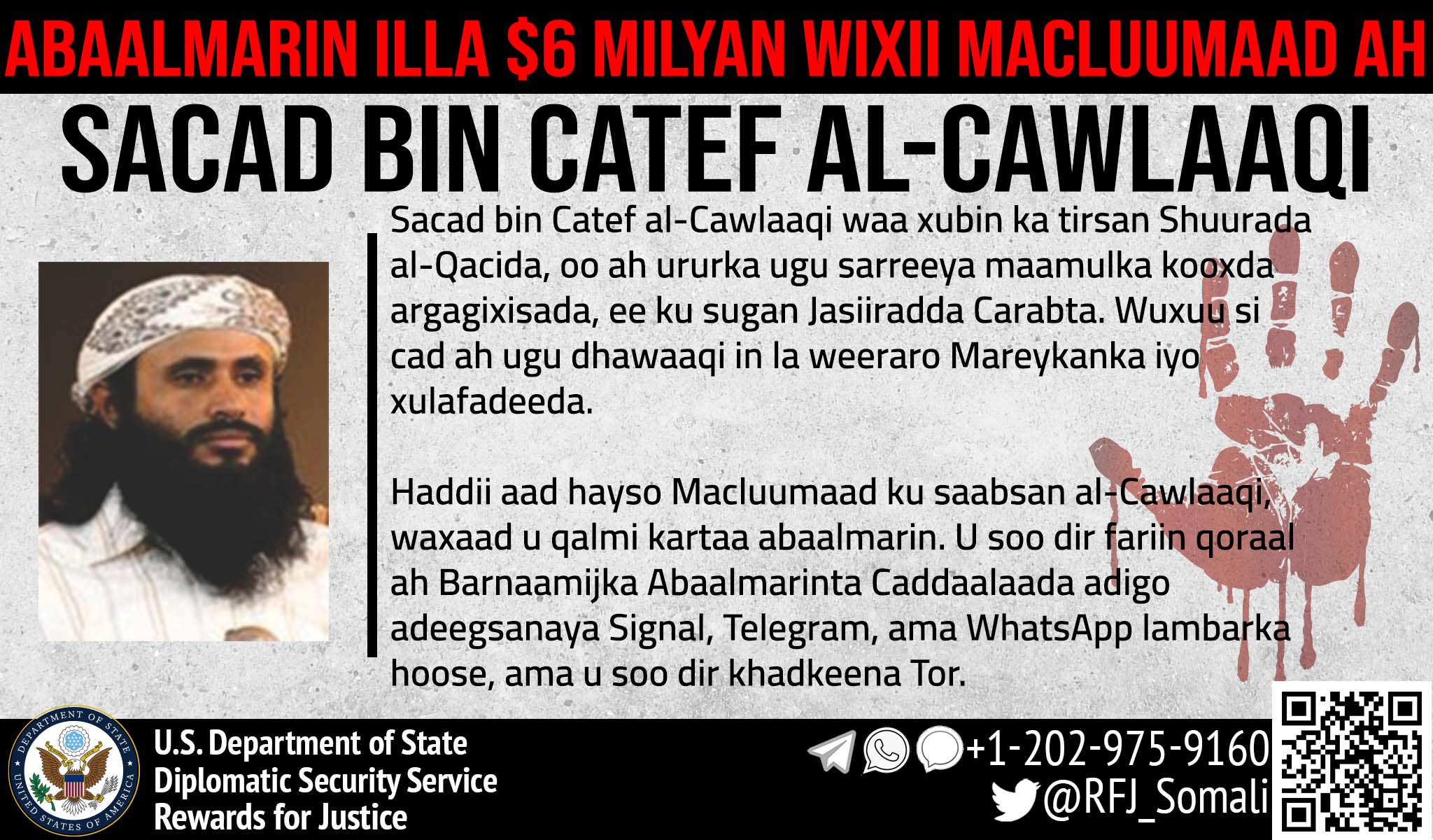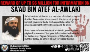 正义奖励计划为征集有关萨阿德·本·阿特夫·奥拉基 (Sa’ad bin Atef al-Awlaki),又名萨阿德·穆罕默德·阿提夫 (Sa’d Muhammad Atif) 的信息,悬赏提供高达 600 万美元的奖励。阿特夫·奥拉基是阿拉伯半岛舒拉基地组织的成员。他公开呼吁攻击美国及其盟友。