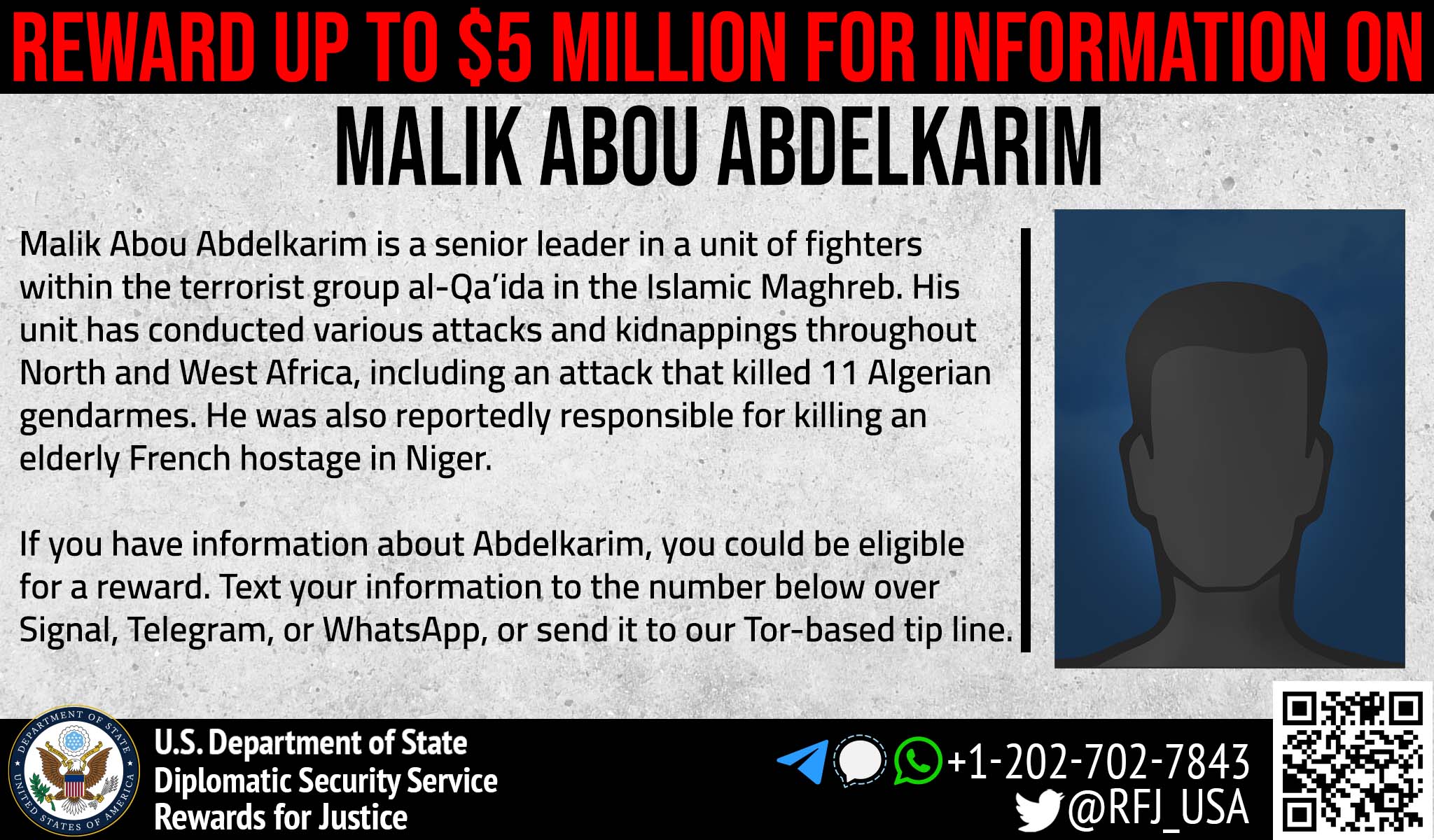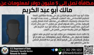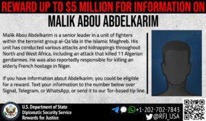 正义奖励计划为征集马利克·阿布·阿卜杜勒卡里姆,又名阿卜杜勒-卡里姆 (Abd al-Karim) 或阿布·阿卜杜勒·卡里姆·塔里克(Abu Abd al-Karim al-Tariqi)的信息,悬赏提供高达 500 万美元的奖励。阿卜杜勒卡里姆是美国认定的外国恐怖组织伊斯兰马格里布(AQIM)基地组织一个战斗连的高级领导人。