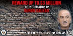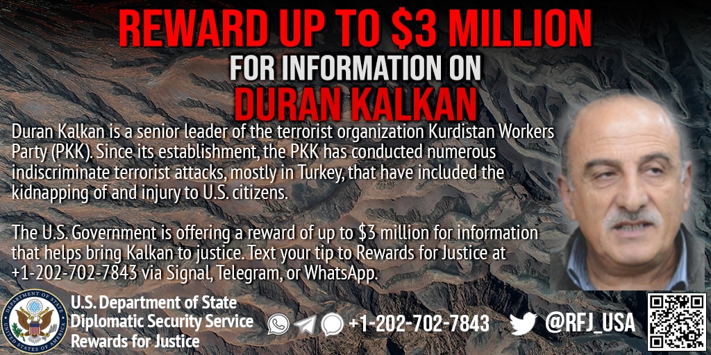 Rewards for Justice is offering a reward of up to $3 million for information on Duran Kalkan, a senior leader of the Kurdistan Workers Party (PKK), also known as the Kongra-Gel. The PKK is a U.S.-designated Foreign Terrorist Organization (FTO). Kalkan is an Executive Committee Member of the PKK and was responsible for an attack that killed seven Turkish soldiers in December 2009.